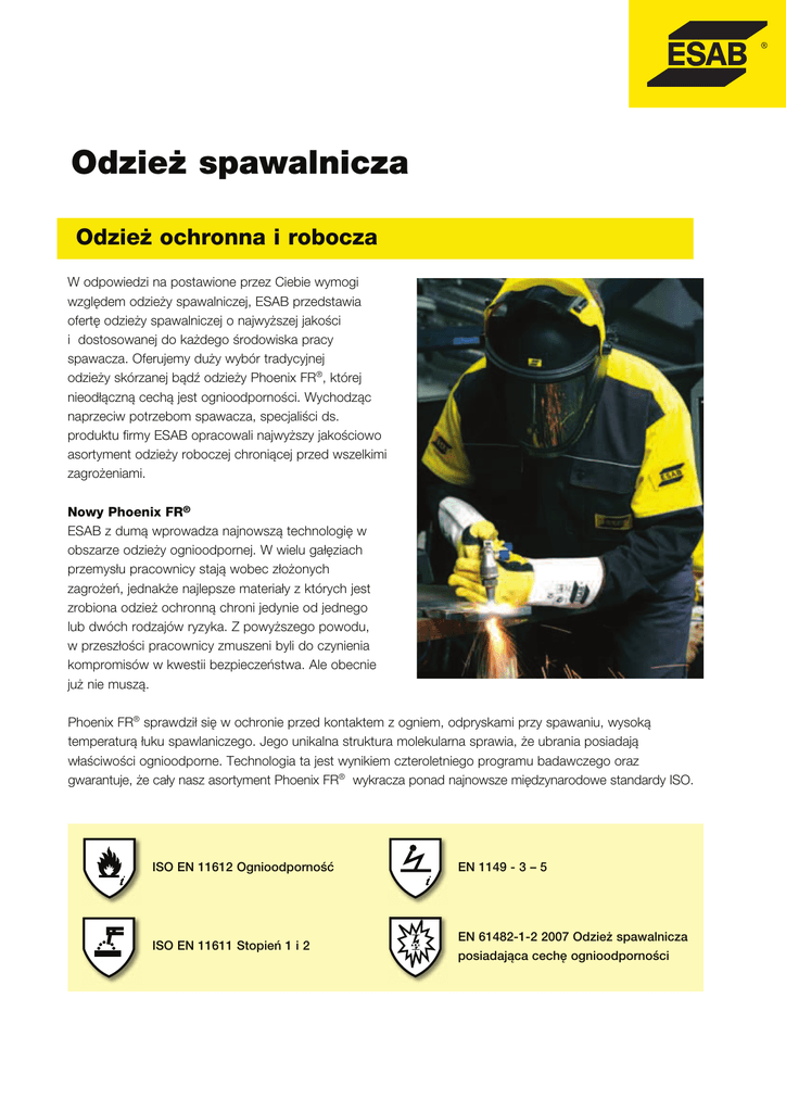 Odzież spawalnicza Odzież ochronna i robocza W odpowiedzi na postawione przez Ciebie wymogi względem odzieży spawalniczej, ESAB przedstawia ofertę odzieży spawalniczej o najwyższej jakości i dostosowanej do każdego środowiska pracy spawacza. Oferujemy duży wybór tradycyjnej PE[JFŤZTLØS[BOFKCįEţPE[JFŤZ1IPFOJY'3®, której nieodłączną cechą jest ognioodporności. Wychodząc naprzeciw potrzebom spawacza, specjaliści ds. produktu firmy ESAB opracowali najwyższy jakościowo asortyment odzieży roboczej chroniącej przed wszelkimi zagrożeniami. Nowy Phoenix FR® ESAB z dumą wprowadza najnowszą technologię w obszarze odzieży ognioodpornej. W wielu gałęziach przemysłu pracownicy stają wobec złożonych zagrożeń, jednakże najlepsze materiały z których jest zrobiona odzież ochronną chroni jedynie od jednego MVCEXØDISPE[BKØXSZ[ZLB;QPXZŤT[FHPQPXPEV w przeszłości pracownicy zmuszeni byli do czynienia kompromisów w kwestii bezpieczeństwa. Ale obecnie już nie muszą. 1IPFOJY'3® sprawdził się w ochronie przed kontaktem z ogniem, odpryskami przy spawaniu, wysoką temperaturą łuku spawlaniczego. Jego unikalna struktura molekularna sprawia, że ubrania posiadają właściwości ognioodporne. Technologia ta jest wynikiem czteroletniego programu badawczego oraz HXBSBOUVKFŤFDBZOBT[BTPSUZNFOU1IPFOJY'3® wykracza ponad najnowsze międzynarodowe standardy ISO. ISO EN 11612 Ognioodporność ISO EN 11611 Stopień 1 i 2 EN 1149 - 3 – 5 EN 61482-1-2 2007 Odzież spawalnicza posiadająca cechę ognioodporności Odzież spawalnicza/ognioodporna Ognioodporna odzież spawalnicza Ognioodporne kurtki spawalnicze Kurtki spawalnicze firmy ESAB zaprojektowano tak by zapewnić maksymalną wydajność a przy tym najwyższy komfort i trwałość. Ta część TUSPKVXZLPOBOBKFTU[XZTPLPXZEBKOFHPNBUFSJBV1IPFOJY'3LUØSFHP właściwością jest ognioodporność. Okrycie to ma regulowane rękawy, dwie górne kieszenie i zakryty z przodu suwak. Kurtka ma certyfikat CE QFOFK[HPEOPŔDJ[OPSNBNJ&/*40'3TQBXBMOJD[į*40 BOUZTUBUZD[Oį&/PSB[&/X[BLSFTJFPDISPOZQS[FE VLJFNTQBXBMOJD[ZN%PTUĺQOBXSP[NJBSBDI499- Kurtka spawalnicza ESAB FR, roz. S ,VSULBTQBXBMOJD[B&4"#'3SP[. Kurtka spawalnicza ESAB FR, roz. L ,VSULBTQBXBMOJD[B&4"#'3SP[9- ,VSULBTQBXBMOJD[B&4"#'3SP[99- 0700 0700 0700 0700 0700 010 010 010 010 010 358 359 360 361 362 Ognioodporne spodnie spawalnicze Spodnie spawalnicze firmy ESAB w kolorach czarnym i żółtym zostały zaprojektowane dla uzyskania maksimum przydatności ;BQFXOJBKįOBKXJĺLT[ZLPNGPSUJUSXBPŔDJPSB[TUBOPXJįV[VQFOJFOJF dla ognioodpornej kurtki spawalniczej. Spodnie wykonane są z XZTPLPXZEBKOFHPNBUFSJBV1IPFOJY'3LUØSFHPHØXOįDFDIįKFTU ognioodporność. Spodnie mają regulowaną talię, szlufki na pasek, dwie łatwo dostępne kieszenie boczne i dwie tylne. Spodnie mają certyfikat $&JQFOį[HPEOPŔDJ[OPSNBNJ&/*40'3TQBXBMOJD[į*40 BOUZTUBUZD[Oį&/PSB[&/X[BLSFTJFPDISPOZ QS[FEVLJFNTQBXBMOJD[ZN%PTUĺQOFXSP[NJBSBDI499- Spodnie spawalnicze ESAB FR, roz. S 4QPEOJFTQBXBMOJD[F&4"#'3SP[. Spodnie spawalnicze ESAB FR, roz. L 4QPEOJFTQBXBMOJD[F&4"#'3SP[9- 4QPEOJFTQBXBMOJD[F&4"#'3SP[99- 0700 0700 0700 0700 0700 010 010 010 010 010 363 364 365 366 367 Ognioodporny kombinezon ESAB FR Kombinezon ESAB został zaprojektowany dla zapewnienia spawaczowi maksimum komfortu i ochrony. Wykonany jest z materiału ognioodpornego. Część kombinezonu wokół talii jest elastyczna dla większego komfortu i dopasowania, rękawy i nogawki są regulowane a [BNFL[BTPOJĺUZDISPOJPOZ4[ZKBKFTUDISPOJPOBE[JĺLJLPOJFS[PXJLUØSZ można postawić, a na kolana można zamontować miękkie ochraniacze. ;HPEOPŔİ[OPSNBNJ&/*40'3TQBXBMOJD[į*40BOUZ TUBUZD[Oį&/%PTUĺQOZXSP[NJBSBDI499- Kombinezon spawacza ESAB, roz. S ,PNCJOF[POTQBXBD[B&4"#SP[. Kombinezon spawacza ESAB, roz. L ,PNCJOF[POTQBXBD[B&4"#SP[9- Kombinezon spawacza ESAB, roz. 99- 0700 0700 0700 0700 0700 010 010 010 010 010 328 329 330 331 332 Odzież spawalnicza/ognioodporna Ognioodporna odzież spawalnicza Polar ESAB FR Polar dla spawacza firmy ESAB, wykonany z ogniotrwałego i antyTUBUZD[OFHPNBUFSJBV1IPFOJY1S[ØE[PECMBTLPXįQMBLJFULį[BQJOBOZ na suwak, dwie boczne kieszenie i jeden suwak od wewnątrz. ;HPEOPŔİ[OPSNBNJ&/*40'3TQBXBMOJD[į*40BOUZ TUBUZD[Oį&/3P[NJBSZ499- Polar ESAB FR, roz. S 1PMBS&4"#'3SP[. Polar ESAB FR, roz. L 1PMBS&4"#'3SP[9- 1PMBS&4"#'3SP[99- 0700 0700 0700 0700 0700 010 010 010 010 010 368 369 370 371 372 Bluza Jersey ESAB FR Bluza Jersey polo ESAB w kolorze czarnym z ognioodpornego materiału 1IPFOJY'3PXBŔDJXPŔDJBDIBOUZTUBUZD[OZDIQS[F[OBD[POBEMB spawacza. Posiada zapięcie na suwak od przodu oraz odblaskową GJSNPXįQMBLJFULĺOBQJFSTJ.BVOJLBMOZŤFCFSLPXZLPOJFS[;HPEOPŔİ [OPSNBNJ&/*40'3TQBXBMOJD[į*40JBOUZTUBUZD[Oį &/3P[NJBSZ499- Jersey ESAB FR, roz. S +FSTFZ&4"#'3SP[. Jersey ESAB FR, roz. L +FSTFZ&4"#'3SP[9- +FSTFZ&4"#'3SP[99- 0700 0700 0700 0700 0700 010 010 010 010 010 373 374 375 376 377 Sweter ESAB FR 4XFUFS&4"#[PHOJPPEQPSOFHPNBUFSJBV1IPFOJY'3PXBŔDJXPŔDJBDI BOUZTUBUZD[OZDIQS[F[OBD[POZEMBTQBXBD[B;HPEOPŔİ[OPSNBNJ &/*40'3TQBXBMOJD[į*40JBOUZTUBUZD[Oį&/ 3P[NJBSZ499- Sweter ESAB FR, roz. S 4XFUFS&4"#'3SP[. Sweter ESAB FR, roz. L 4XFUFS&4"#'3SP[9- 4XFUFS&4"#'3SP[99- ESAB Polska Sp. z o.o. 40 – 114 Katowice Ul. Ściegiennego 3 NIP 527-26-27-655 KRS 000356431 Kontakt: Tel. +48 32 3511 100 Fax. +48 32 3511 120 E-mail: [email protected] www.esab.pl 0700 0700 0700 0700 0700 010 010 010 010 010 378 379 380 381 382