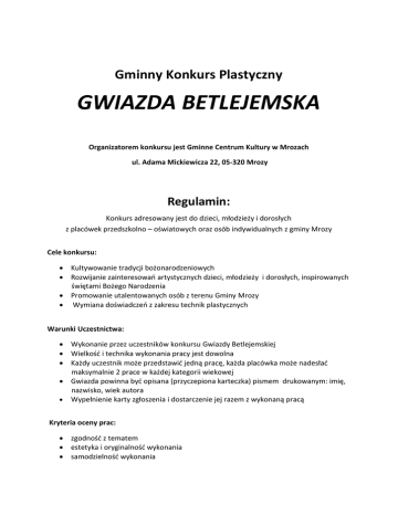 Gminny Konkurs Plastyczny GWIAZDA BETLEJEMSKA Organizatorem konkursu jest Gminne Centrum Kultury w Mrozach ul. Adama Mickiewicza 22, 05-320 Mrozy Regulamin: Konkurs adresowany jest do dzieci, młodzieży i dorosłych z placówek przedszkolno – oświatowych oraz osób indywidualnych z gminy Mrozy Cele konkursu: Kultywowanie tradycji bożonarodzeniowych Rozwijanie zainteresowao artystycznych dzieci, młodzieży i dorosłych, inspirowanych świętami Bożego Narodzenia Promowanie utalentowanych osób z terenu Gminy Mrozy Wymiana doświadczeo z zakresu technik plastycznych Warunki Uczestnictwa: Wykonanie przez uczestników konkursu Gwiazdy Betlejemskiej Wielkośd i technika wykonania pracy jest dowolna Każdy uczestnik może przedstawid jedną pracę, każda placówka może nadesład maksymalnie 2 prace w każdej kategorii wiekowej Gwiazda powinna byd opisana (przyczepiona karteczka) pismem drukowanym: imię, nazwisko, wiek autora Wypełnienie karty zgłoszenia i dostarczenie jej razem z wykonaną pracą Kryteria oceny prac: zgodnośd z tematem estetyka i oryginalnośd wykonania samodzielnośd wykonania Przebieg konkursu: Termin składania prac – 11 grudnia 2015 r. do godziny 17.00 w biurze Gminnego Centrum Kultury w Mrozach Oceny prac dokona Jury powołane przez Organizatora Najciekawsze prace zostaną nagrodzone i wyróżnione (nagrody, dyplomy) Wręczenie nagród odbędzie się podczas „Wigilii pod chmurką” 20 grudnia 2015 r. na sali widowiskowej GCK w Mrozach Kategorie wiekowe: przedszkola i zerówki szkoły podstawowe, klasy I-III szkoły podstawowe, klasy IV- VI gimnazja i licea dorośli Organizator nie odsyła prac. Odbiór wykonanych gwiazd w dniach 19.01.2015 r. – 30.01.2015 r. Prace nie odebrane w tym terminie przechodzą na własnośd organizatora. Informacji na temat konkursu udziela Weronika Chłopik tel. 25-757-44-79