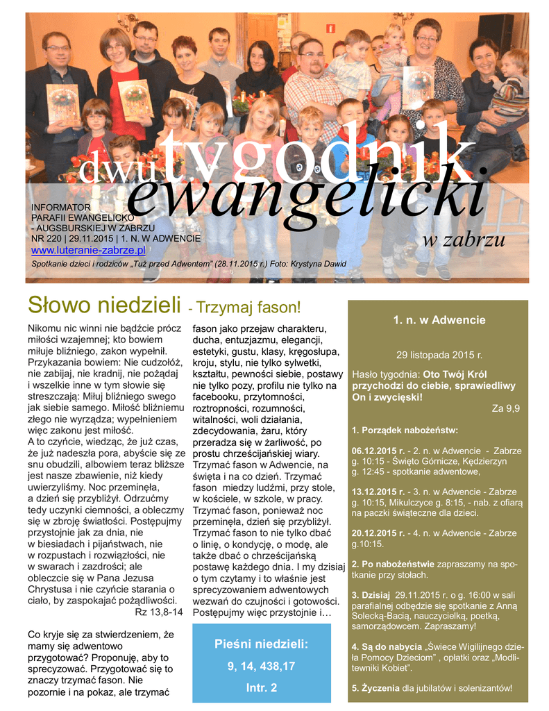 tygodnik ewangelicki dwu INFORMATOR PARAFII EWANGELICKO - AUGSBURSKIEJ W ZABRZU NR 220 | 29.11.2015 | 1. N. W ADWENCIE w zabrzu www.luteranie-zabrze.pl Spotkanie dzieci i rodziców „Tuż przed Adwentem” (28.11.2015 r.) Foto: Krystyna Dawid Słowo niedzieli - Trzymaj fason! Nikomu nic winni nie bądźcie prócz miłości wzajemnej; kto bowiem miłuje bliźniego, zakon wypełnił. Przykazania bowiem: Nie cudzołóż, nie zabijaj, nie kradnij, nie pożądaj i wszelkie inne w tym słowie się streszczają: Miłuj bliźniego swego jak siebie samego. Miłość bliźniemu złego nie wyrządza; wypełnieniem więc zakonu jest miłość. A to czyńcie, wiedząc, że już czas, że już nadeszła pora, abyście się ze snu obudzili, albowiem teraz bliższe jest nasze zbawienie, niż kiedy uwierzyliśmy. Noc przeminęła, . aŚw. dzień się przybliżył. Odrzućmy tedy uczynki ciemności, a obleczmy się w zbroję światłości. Postępujmy przystojnie jak za dnia, nie w biesiadach i pijaństwach, nie w rozpustach i rozwiązłości, nie w swarach i zazdrości; ale obleczcie się w Pana Jezusa Chrystusa i nie czyńcie starania o ciało, by zaspokajać pożądliwości. Rz 13,8-14 Co kryje się za stwierdzeniem, że mamy się adwentowo przygotować? Proponuję, aby to sprecyzować. Przygotować się to znaczy trzymać fason. Nie pozornie i na pokaz, ale trzymać fason jako przejaw charakteru, ducha, entuzjazmu, elegancji, estetyki, gustu, klasy, kręgosłupa, kroju, stylu, nie tylko sylwetki, kształtu, pewności siebie, postawy nie tylko pozy, profilu nie tylko na facebooku, przytomności, roztropności, rozumności, witalności, woli działania, zdecydowania, żaru, który przeradza się w żarliwość, po prostu chrześcijańskiej wiary. Trzymać fason w Adwencie, na święta i na co dzień. Trzymać fason miedzy ludźmi, przy stole, w kościele, w szkole, w pracy. Trzymać fason, ponieważ noc przeminęła, dzień się przybliżył. Trzymać fason to nie tylko dbać o linię, o kondycję, o modę, ale także dbać o chrześcijańską postawę każdego dnia. I my dzisiaj o tym czytamy i to właśnie jest sprecyzowaniem adwentowych wezwań do czujności i gotowości. Postępujmy więc przystojnie i… Pieśni niedzieli: 9, 14, 438,17 Intr. 2 1. n. w Adwencie 29 listopada 2015 r. Hasło tygodnia: Oto Twój Król przychodzi do ciebie, sprawiedliwy On i zwycięski! Za 9,9 1. Porządek nabożeństw: 06.12.2015 r. - 2. n. w Adwencie - Zabrze g. 10:15 - Święto Górnicze, Kędzierzyn g. 12:45 - spotkanie adwentowe, 13.12.2015 r. - 3. n. w Adwencie - Zabrze g. 10:15, Mikulczyce g. 8:15, - nab. z ofiarą na paczki świąteczne dla dzieci. 20.12.2015 r. - 4. n. w Adwencie - Zabrze g.10:15. 2. Po nabożeństwie zapraszamy na spotkanie przy stołach. 3. Dzisiaj 29.11.2015 r. o g. 16:00 w sali parafialnej odbędzie się spotkanie z Anną Solecką-Bacią, nauczycielką, poetką, samorządowcem. Zapraszamy! 4. Są do nabycia „Świece Wigilijnego dzieła Pomocy Dzieciom” , opłatki oraz „Modlitewniki Kobiet”. 5. Życzenia dla jubilatów i solenizantów! XVII Turniej Piłki Halowej im. ks. A. Hauptmana 14 listopada 2015 r. w hali MOSiR przy ul. Matejki 6 w Zabrzu odbył się XVII Ewangelicki Turniej Piłki Nożnej Halowej im. ks. Andrzeja Hauptmana. Organizatorami turnieju były Parafie EwangelickoAugsburskie w Zabrzu i Gliwicach. W rozgrywkach turniejowych uczestniczyło 25 drużyn. Nowością był udział, po raz pierwszy, dwóch drużyn żeńskich z parafii w Wiśle. Cieszymy się, że reprezentacja naszej parafii drużyna seniorów z Zabrza zajęła 3 miejsce (na fotografii). Gratulujemy! Rangę tego sportowego wydarzenia podniosła obecność dwóch biskupów: dr Mariana Niemca bpa diecezji katowickiej i bpa Jerzego Samca zwierzchnika Kościoła Ewangelicko-Augsburskiego w RP. W trakcie naszego turnieju upamiętniliśmy chwilą milczenia i modlitwą ofiary zamachów terrorystycznych we Francji. Dziękujemy Pani Pastorowej Eugenii Hauptman za obecność na całym turnieju i aktywny udział w dekoracji zwycięskich drużyn. Serdeczne podziękowania kierujemy pod adresem Zarządu MOSiR w Zabrzu za umożliwienie zorganizowania turnieju w hali przy ul. Matejki. Gratulujemy zwycięzcom, a wszystkim pozostałym życzymy powodzenia za rok w 18. Ewangelickim Turnieju Piłki Nożnej Halowej im. ks. Andrzeja Hauptmana! Foto: D. Dawid „Tuż przed Adwentem” W sobotę 28 listopada 2015 r. odbyło się w sali parafialnej spotkanie dzieci i rodziców: „Tuż przed Adwentem”. W trakcie wspólnego wieczoru miała miejsce promocja książki „Rodzinny Adwent”. Były wspólne pieśni i rozmowy. Rodzice wraz z dziećmi przygotowali scenki obrazujące, czym dla nich jest Kościół. Na zakończenie każda rodzina przygotowała dla siebie wieniec adwentowy. Zachęcamy rodziny do wspólnego przeżywania Adwentu w domu i w Kościele! Książki „Rodzinny Adwent” są do nabycia w kancelarii parafialnej w cenie 10,- zł. za sztukę. Reformacyjny konkurs plastyczny 2015 VII Jarmark Adwentowy W sobotę 12 grudnia 2015 roku o g. 15:00 rozpocznie się na „Dziedzińcu Pokoju”, VII Jarmark Adwentowy organizowany przez Parafię Ewangelicko-Augsburską w Zabrzu oraz Młodzieżowy Dom Kultury nr 2. Jarmark jest przede wszystkim płaszczyzną spotkania ludzi, okazją do wspólnych rozmów i adwentowych inspiracji. W ofercie jarmarku znajdziemy muzykę i słowo, występy chórów, zespołów dziecięcych i młodzieżowych. Ponadto nie zabraknie szerokiej propozycji kulinarnej i upominkowej. Zapraszamy! W konkursie wzięło udział 17 dzieci z naszej parafii. Prezentacja prac miała miejsce 8 listopada br.