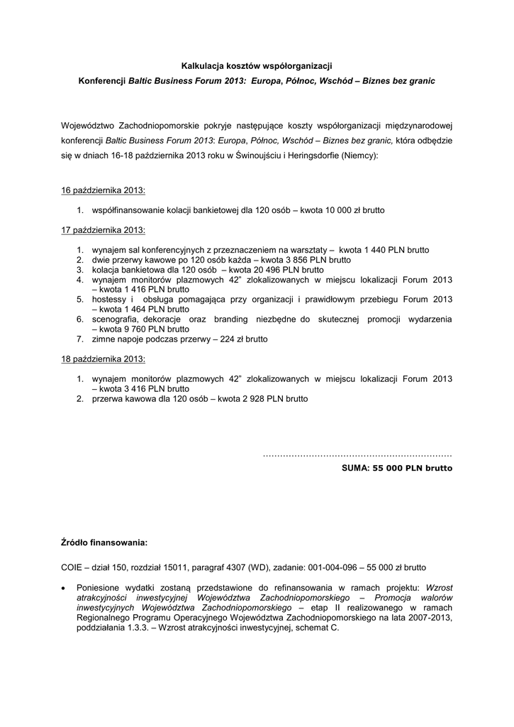 Kalkulacja kosztów współorganizacji Konferencji Baltic Business Forum 2013: Europa, Północ, Wschód – Biznes bez granic Województwo Zachodniopomorskie pokryje następujące koszty współorganizacji międzynarodowej konferencji Baltic Business Forum 2013: Europa, Północ, Wschód – Biznes bez granic, która odbędzie się w dniach 16-18 października 2013 roku w Świnoujściu i Heringsdorfie (Niemcy): 16 października 2013: 1. współfinansowanie kolacji bankietowej dla 120 osób – kwota 10 000 zł brutto 17 października 2013: wynajem sal konferencyjnych z przeznaczeniem na warsztaty – kwota 1 440 PLN brutto dwie przerwy kawowe po 120 osób każda – kwota 3 856 PLN brutto kolacja bankietowa dla 120 osób – kwota 20 496 PLN brutto wynajem monitorów plazmowych 42” zlokalizowanych w miejscu lokalizacji Forum 2013 – kwota 1 416 PLN brutto 5. hostessy i obsługa pomagająca przy organizacji i prawidłowym przebiegu Forum 2013 – kwota 1 464 PLN brutto 6. scenografia, dekoracje oraz branding niezbędne do skutecznej promocji wydarzenia – kwota 9 760 PLN brutto 7. zimne napoje podczas przerwy – 224 zł brutto 1. 2. 3. 4. 18 października 2013: 1. wynajem monitorów plazmowych 42” zlokalizowanych w miejscu lokalizacji Forum 2013 – kwota 3 416 PLN brutto 2. przerwa kawowa dla 120 osób – kwota 2 928 PLN brutto ………………………………………………………… SUMA: 55 000 PLN brutto Źródło finansowania: COIE – dział 150, rozdział 15011, paragraf 4307 (WD), zadanie: 001-004-096 – 55 000 zł brutto Poniesione wydatki zostaną przedstawione do refinansowania w ramach projektu: Wzrost atrakcyjności inwestycyjnej Województwa Zachodniopomorskiego – Promocja walorów inwestycyjnych Województwa Zachodniopomorskiego – etap II realizowanego w ramach Regionalnego Programu Operacyjnego Województwa Zachodniopomorskiego na lata 2007-2013, poddziałania 1.3.3. – Wzrost atrakcyjności inwestycyjnej, schemat C.