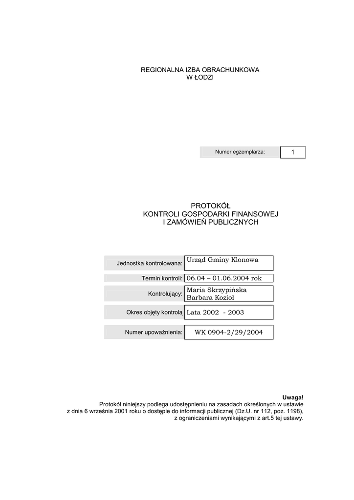 REGIONALNA IZBA OBRACHUNKOWA W ŁODZI Numer egzemplarza: 1 PROTOKÓŁ KONTROLI GOSPODARKI FINANSOWEJ I ZAMÓWIEŃ PUBLICZNYCH Jednostka kontrolowana: Urząd Gminy Klonowa Termin kontroli: 06.04 – 01.06.2004 rok Kontrolujący: Maria Skrzypińska Barbara Kozioł Okres objęty kontrolą Lata 2002 - 2003 Numer upowaŜnienia: WK 0904-2/29/2004 Uwaga! Protokół niniejszy podlega udostępnieniu na zasadach określonych w ustawie z dnia 6 września 2001 roku o dostępie do informacji publicznej (Dz.U. nr 112, poz. 1198), z ograniczeniami wynikającymi z art.5 tej ustawy. PROTOKÓŁ Z KONTROLI KOMPLEKSOWEJ PRZEPROWADZONEJ W GMINIE KLONOWA Regionalna Izba Obrachunkowa w Łodzi, ul. Zamenhofa 10 90-431 Łódź, tel. 42-6366896, fax 6367424 I. INFORMACJE WSTĘPNE DANE O JEDNOSTCE Gmina Klonowa połoŜona jest w powiecie sieradzkim. Adres Urzędu Gminy w Klonowej ul. Ks. Dalaka 2 98-273 Klonowa. Według danych ewidencji ludności na dzień 14 kwietnia 2004 roku Gminę Klonowa zamieszkiwało 3160 osób. Kobiety stanowiły liczbę 1607 osób, męŜczyźni 1553 osób. Gmina swoim zasięgiem administracyjnym obejmuje 11 sołectw stanowiące jednostki pomocnicze Gminy. Są to sołectwa: Kuźnica Zagrzebska, Kuźnica Błońska, Grzyb, Świątki, Klonowa I, Klonowa II, Lipicze, Lesiaki, Leliwa, Owieczki i Pawelce. Gmina zajmuje obszar o powierzchni 9500 ha, w tym: uŜytki rolne – 5568 ha z tego: - grunty orne – 4 085 ha - łąki i pastwiska – 1 474 ha - sady – 9 ha lasy i grunty leśne – 3 033 ha pozostałe – 899 ha Urząd Gminy w Klonowej jest zarejestrowany w systemie REGON i posiada nr statystyczny 000543634 Gmina jest podatnikiem podatku VAT. Posiada numer identyfikacji podatkowej NIP 827-11-07-895. Według stanu na koniec 2003 roku liczba bezrobotnych na terenie Gminy Klonowa wynosiła 221 osób. II. USTALENIA OGÓLNE 1. KIEROWNICTWO JEDNOSTKI Przewodniczący rady gminy Przewodniczącym Rady Gminy Klonowa jest pan Ryszard Nowak wybrany na to stanowisko uchwałą nr I/1/2002 Rady Gminy Klonowa z dnia 19 listopada 2002 roku. W kadencji 1998-2002 Przewodniczącym Rady Gminy był pan Stanisław Kolankowski wybrany na to stanowisko uchwałą nr I/1/1998 Rady Gminy z dnia 28 października 1998 roku. Wójt, i ich zastępcy (pozostali członkowie zarządu) Wójtem Gminy Klonowa jest pani Barbara Wyrwas wybrana na to stanowisko w wyborach powszechnych, które odbyły się w dniu 27 października 2002 roku. Pani Barbara Wyrwas funkcję Wójta od 11 lipca 1994 roku. _____________________________________________________ 2 PROTOKÓŁ Z KONTROLI KOMPLEKSOWEJ PRZEPROWADZONEJ W GMINIE KLONOWA Regionalna Izba Obrachunkowa w Łodzi, ul. Zamenhofa 10 90-431 Łódź, tel. 42-6366896, fax 6367424 Zastępcą Wójta Gminy jest pani Anna Wolska powołana na to stanowisko Zarządzeniem nr 5/2003 Wójta Gminy Klonowa z dnia 1 lutego 2003 roku. Skarbnik gminy Skarbnikiem Gminy Klonowa od dnia 1 grudnia 2003 roku jest pani Krystyna Przezak powołana na to stanowisko uchwałą nr VIII/73/2003 Rady Gminy z dnia 30 października 2003 roku. Wcześniej funkcję Skarbnika Gminy pełniła pani Stanisława Wika powołana na to stanowisko Uchwałą nr II/13/1990 Rady Gminy z dnia 15 sierpnia 1990 roku. Panią Stanisławę Wika odwołano ze stanowiska Skarbnika Gminy uchwałą Rady Gminy nr VIII/72/2003 z dnia 30 października 2003 roku Sekretarz gminy Sekretarzem Gminy Klonowa jest pan Jacek Lesiak powołany na to stanowisko uchwałą nr I/3/2002 Rady Gminy z dnia 19 listopada 2002 roku. 2. GMINNE JEDNOSTKI ORGANIZACYJNE I PRAWNOORGANIZACYJNE FORMY ICH DZIAŁALNOŚCI Według załącznik nr 1 c do Statutu Gminy Klonowa wprowadzonego w Ŝycie uchwałą nr I/13/2002 Rady Gminy z dnia 19 listopada 2002 roku w Gminie Klonowa funkcjonuje 6 gminnych jednostek organizacyjnych: 1) Zespół Szkół w Klonowej, 2) Szkoła Podstawowa w Kuźnicy Błońskiej, 3) Przedszkole Publiczne w Klonowej, 4) Gminny Ośrodek Kultury w Klonowej, 5) Gminna Biblioteka Publiczna w Klonowej , 6) Gminny Ośrodek Pomocy Społecznej w Klonowej. Gminna Biblioteka Publiczna i Gminny Ośrodek Kultury funkcjonują jako instytucje kultury, natomiast pozostałe jednostki organizacyjne funkcjonują jako jednostki budŜetowe. 3. UNORMOWANIA WEWNĘTRZNE Statut gminy Statut Gminy Klonowa uchwalony został uchwałą nr I/13/2002 Rady Gminy z dnia 19 sierpnia 200 roku. Cytowaną wyŜej uchwałą stracił moc statut wprowadzony w Ŝycie uchwałą nr XIV/96/96 Rady Gminy Klonowa z dnia 15 lutego 1996 roku, zmieniony uchwałami Rady Gminy: - nr XII/105/00 z dnia 21 czerwca 2000 roku, - nr XX/171/2001 z dnia 30 sierpnia 2001 roku, _____________________________________________________ 3 PROTOKÓŁ Z KONTROLI KOMPLEKSOWEJ PRZEPROWADZONEJ W GMINIE KLONOWA Regionalna Izba Obrachunkowa w Łodzi, ul. Zamenhofa 10 90-431 Łódź, tel. 42-6366896, fax 6367424 Regulamin organizacyjny urzędu Regulamin Organizacyjny Urzędu Gminy Klonowa wprowadzony został w Ŝycie Zarządzeniem nr 1/2002 Wójta Gminy Klonowa z dnia 2 grudnia 2002 roku zmieniony Zarządzeniami Wójta: nr 23/2003 z dnia 7 lipca 2003 roku, nr 47/2003 z dnia 30 grudnia 2003 roku i Zarządzeniem nr 50/2004 z dnia 10 lutego 2004 roku. Instrukcja obiegu i kontroli dokumentów Zarządzeniem nr 31/2003 Wójta Gminy Klonowa z dnia 30 września 2003 roku w sprawie instrukcji regulujących gospodarkę finansową i majątkową gminy wprowadzono do uŜytku wewnętrznego : - instrukcję obiegu i kontroli dokumentów księgowych oraz zasady przeprowadzania inwentaryzacji stanowiącą załącznik nr 1 do zarządzenia, - zakładowy plan kont dla budŜetu Gminy i Urzędu Gminy – stanowiący załącznik nr 2 do zarządzenia, - wykaz kont syntetycznych i kont pomocniczych prowadzonych do dochodów jednostki i stanowiący załącznik nr 3 do zarządzenia, - wykaz kont syntetycznych i kont pomocniczych prowadzonych dla wydatków jednostki – stanowiący załącznik nr 4 do zarządzenia, - instrukcję w sprawie gospodarki kasowej –