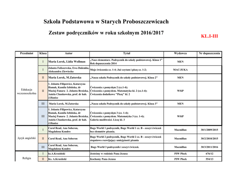 Szkoła Podstawowa w Starych Proboszczewicach Zestaw podręczników w roku szkolnym 2016/2017 Przedmiot Edukacja wczesnoszkolna Język angielski Religia Klasa KL.I-III Tytuł Wydawca „Nasz elementarz. Podręcznik do szkoły podstawowej. Klasa 1” Rok dopuszczenia 2014 MEN Autor I Maria Lorek, Lidia Wollman I Jolanta Faliszewska, Ewa Dulemba, Moje ćwiczenia cz. 1-4; Już czytam i piszę cz. 1-2; Aleksandra Ziewiecka II Maria Lorek, M.Zatorska II 1. Jolanta Filipowicz, Katarzyna Hamak, Kamila Izbińska, dr Ćwiczenia z pomysłęm 2 (cz.1-4); Maciej Funara 2. Jolanta Brzózka, Ćwiczenia z pomysłem. Matematyka kl. 2 (cz.1-4); Aniela Chankowska, prof. dr hab. Ćwiczenia dodatkowe "Piszę" kl. 2 J.Hanisz III Maria Lorek, M.Zatorska III 1. Jolanta Filipowicz, Katarzyna Hamak, Kamila Izbińska, dr Ćwiczenia z pomysłęm 3 (cz. 1-4); Maciej Funara 2. Jolanta Brzózka, Ćwiczenia z pomysłem. Matematyka 3 (cz. 1-4); Aniela Chankowska, prof. dr hab. Galeria możliwości. Liczę kl. 3 J.Hanisz „Nasza szkoła Podręcznik do szkoły podstawowej. Klasa 2” „Nasza szkoła Podręcznik do szkoły podstawowej. Klasa 3” Nr dopuszczenia MAC/JUKA MEN WSiP MEN WSiP I Carol Read, Ana Soberon, Magdalena Kondro Bugs World 1 podręcznik, Bugs World 1 cz. B - zeszyt ćwiczeń bez elemntów pisania. Macmillan 30/1/2009/2015 II Carol Read, Ana Soberon Bugs World 2 podręcznik, Bugs World 2 cz. B - zeszyt ćwiczeń stopniowo rozwijający umiejętność pisania Macmillan 30/2/2010/2015 III Carol Read, Ana Soberon, Magdalena Kondro Bugs World 3 podręcznik i zeszyt ćwiczeń. Macmillan 30/3/2011/2016 I ks.A.Krasiński Jesteśmy w rodzinie Pana Jezusa PIW Płock 676/12 II Ks. A.Krasiński Kochamy Pana Jezusa PIW Płock 554/13 Religia III ks. Andrzej Krasiński Przyjmujemy Pana Jezusa PIW Płock 297/14