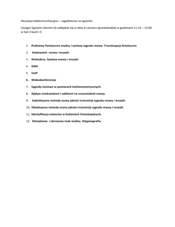 Akustyka telekomunikacyjna – zagadnienia na egzamin Uwaga! Egzamin (termin 0) odbędzie się w dniu 6 czerwca (poniedziałek) w godzinach 11.15 – 13.00 w Sali 3 bud C-5 1. Podstawy fonetyczne analizy i syntezy sygnału mowy. Transkrypcja fonetyczna 2. Kodowanie mowy i muzyki. 3. Wokodery. Synteza mowy i muzyki. 4. GSM 5. VoIP 6. Wideokonferencje 7. Sygnały testowe w pomiarach telefonometrycznych. 8. Wpływ zniekształceń i zakłóceń na zrozumiałość mowy. 9. Subiektywne metody oceny jakości transmisji sygnału mowy i muzyki. 10. Obiektywne metody oceny jakości transmisji sygnału mowy i muzyki. 11. Identyfikacja mówców w badaniach fonoskopijnych. 12. Dźwiękowy i obrazowy znak wodny. Steganografia.