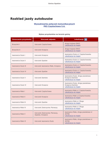 Gmina Opatów Rozkład jazdy autobusów Wyszukiwarka połączeń komunikacyjnych PKS Częstochowa S.A. Wykaz przystanków na terenie gminy Oznaczenie przystanku Kierunek odjazdu Lokalizacja Brzezinki I kierunek Częstochowa droga krajowa DK43 Lokalizacja na mapie Brzezinki II kierunek Krzepice droga krajowa DK43 Lokalizacja na mapie Iwanowice Duże I kierunek Krzepice Iwanowice Duże ul. Częstochowska Lokalizacja na mapie Iwanowice Duże II kierunek Opatów Iwanowice Duże ul. Częstochowska Lokalizacja na mapie Iwanowice Duże III kierunek Iwanowice Małe, Krzepice Iwanowice Duże ul. Częstochowska Lokalizacja na mapie Iwanowice Duże IV kierunek Opatów Iwanowice Duże ul. Częstochowska Lokalizacja na mapie Iwanowice Duże V kierunek Danków Iwanowice Duże, droga powiatowa Krzepice-Danków Lokalizacja na mapie Iwanowice Duże VI kierunek Krzepice Iwanowice Duże, droga powiatowa Krzepice-Danków Lokalizacja na mapie Iwanowice Małe I kierunek Częstochowa Iwanowice Małe ul. Częstochowska Lokalizacja na mapie Iwanowice Małe II kierunek Krzepice Iwanowice Małe ul.Częstochowska Lokalizacja na mapie Iwanowice Małe III kierunek Opatów Iwanowice Małe ul. Długa Lokalizacja na mapie Iwanowice Małe IV kierunek Zwierzyniec Pierwszy Iwanowice Małe ul. Długa Lokalizacja na mapie Iwanowice Małe V kierunek Zwierzyniec Pierwszy, Opatów, Krzepice Iwanowice Małe, droga powiatowa nr 2076S Lokalizacja na mapie Iwanowice Małe VI kierunek Iwanowice Duże Iwanowice Małe, droga powiatowa nr 2076S Lokalizacja na mapie 1 Gmina Opatów Opatów I kierunek Częstochowa Opatów ul. Częstochowska Lokalizacja na mapie Opatów II kierunek Krzepice Opatów ul. Częstochowska Lokalizacja na mapie Opatów III kierunek Opatów Centrum Opatów ul. Klepaczka Lokalizacja na mapie Opatów IV kierunek Złochowice Opatów ul. Klepaczka Lokalizacja na mapie Opatów V kierunek Częstochowa, Krzepice, Iwanowice Duże Opatów ul. Kuźniczka Lokalizacja na mapie Opatów VI kierunek Złochowice Opatów ul. Kuźniczka Lokalizacja na mapie Opatów VII kierunek Iwanowice Duże Opatów ul. Tadeusza Kościuszki Lokalizacja na mapie Opatów VIII kierunek Częstochowa, Krzepice, Złochowice Opatów ul. Tadeusza Kościuszki Lokalizacja na mapie Opatów IX kierunek Iwanowice Duże Opatów ul. Tadeusza Kościuszki Lokalizacja na mapie Opatów X kierunek Opatów Centrum Opatów ul. Tadeusza Kościuszki Lokalizacja na mapie Opatów XI kierunek Opatów Centrum Opatów ul. Szkolna Lokalizacja na mapie Opatów XII kierunek Wilkowiecko Opatów ul. Szkolna Lokalizacja na mapie Waleńczów I kierunek Krzepice Waleńczów ul. Częstochowska Lokalizacja na mapie Waleńczów II kierunek Częstochowa Waleńczów ul. Częstochowska Lokalizacja na mapie Waleńczów III kierunek Krzepice Waleńczów ul. Częstochowska Lokalizacja na mapie Waleńczów IV kierunek Częstochowa Waleńczów ul. Częstochowska Lokalizacja na mapie Wilkowiecko I kierunek Opatów Wilkowiecko ul. płk. Chodakowskiego Lokalizacja na mapie Wilkowiecko II kierunek Wilkowiecko Centrum Wilkowiecko ul. płk. Chodakowskiego Lokalizacja na mapie Wilkowiecko III kierunek Opatów Wilkowiecko ul. płk. Chodakowskiego Lokalizacja na mapie Wilkowiecko IV kierunek Brzezinki, Rębielice Królewskie, Mokra, Kłobuck Wilkowiecko ul. płk. Chodakowskiego Lokalizacja na mapie 2 Gmina Opatów Wilkowiecko V kierunek Brzezinki Wilkowiecko ul. płk. Chodakowskiego Lokalizacja na mapie Wilkowiecko VI kierunek Brzezinki Wilkowiecko ul. Mikołaja z Wilkowiecka Lokalizacja na mapie Wilkowiecko VII kierunek Rębielice Królewskie, Opatów, Brzezinki Wilkowiecko ul. Mikołaja z Wilkowiecka Lokalizacja na mapie Wilkowiecko VIII kierunek Kłobuck Wilkowiecko ul. Długosza Lokalizacja na mapie Wilkowiecko IX kierunek Wilkowiecko Centrum Wilkowiecko ul. Długosza Lokalizacja na mapie Wilkowiecko X kierunek Rębielice Królewskie Wilkowiecko ul. 3-go Maja Lokalizacja na mapie Wilkowiecko XI kierunek Wilkowiecko Centrum Wilkowiecko ul. 3-go Maja Lokalizacja na mapie Złochowice I kierunek Konieczki Złochowice ul. Wesoła Lokalizacja na mapie Złochowice II kierunek Opatów, Waleńczów Złochowice ul. Wesoła Lokalizacja na mapie Złochowice III kierunek Opatów Złochowice ul. Wesoła Lokalizacja na mapie Złochowice IV kierunek Złochowice Centrum Złochowice ul. Wesoła Lokalizacja na mapie Złochowice V kierunek Waleńczów Złochowice ul. Topolowa Lokalizacja na mapie Złochowice VI kierunek Złochowice Centrum Złochowice ul. Topolowa Lokalizacja na mapie Złochowice VII kierunek Konieczki Złochowice ul. Długa Lokalizacja na mapie Złochowice VIII kierunek Złochowice Centrum Złochowice ul. Długa Lokalizacja na mapie Złochowice IX kierunek Złochowice Centrum Złochowice ul. Długa Lokalizacja na mapie Złochowice X kierunek Konieczki Złochowice ul. Długa Lokalizacja na mapie Złochowice XI kierunek Złochowice Centrum Złochowice ul. Długa Lokalizacja na mapie Złochowice XII kierunek Konieczki Złochowice ul. Długa Lokalizacja na mapie Zwierzyniec Drugi I kierunek Konieczki, Złochowice Zwierzyniec Drugi, droga powiatowa nr 2036S Lokalizacja na mapie 3 Gmina Opatów Zwierzyniec Drugi II kierunek Zwierzyniec Pierwszy Zwierzyniec Drugi, droga powiatowa nr 2036S Lokalizacja na mapie Zwierzyniec Pierwszy I kierunek Zwierzyniec Pierwszy Centrum Zwierzyniec Pierwszy ul. 3-go Maja Lokalizacja na mapie Zwierzyniec Pierwszy II kierunek Konieczki, Złochowice Zwierzyniec Pierwszy ul. 3-go Maja Lokalizacja na mapie Zwierzyniec Pierwszy III kierunek Krzepice, Panki Zwierzyniec Pierwszy ul. Jasna Lokalizacja na mapie Zwierzyniec Pierwszy IV kierunek Konieczki, Iwanowice Małe Zwierzyniec Pierwszy ul. Jasna Lokalizacja na mapie Zwierzyniec Pierwszy V kierunek Zwierzyniec Pierwszy Centrum Zwierzyniec Pierwszy ul. Jasna Lokalizacja na mapie Zwierzyniec Pierwszy VI kierunek Krzepice, Panki Zwierzyniec Pierwszy ul. Jasna Lokalizacja na mapie 4