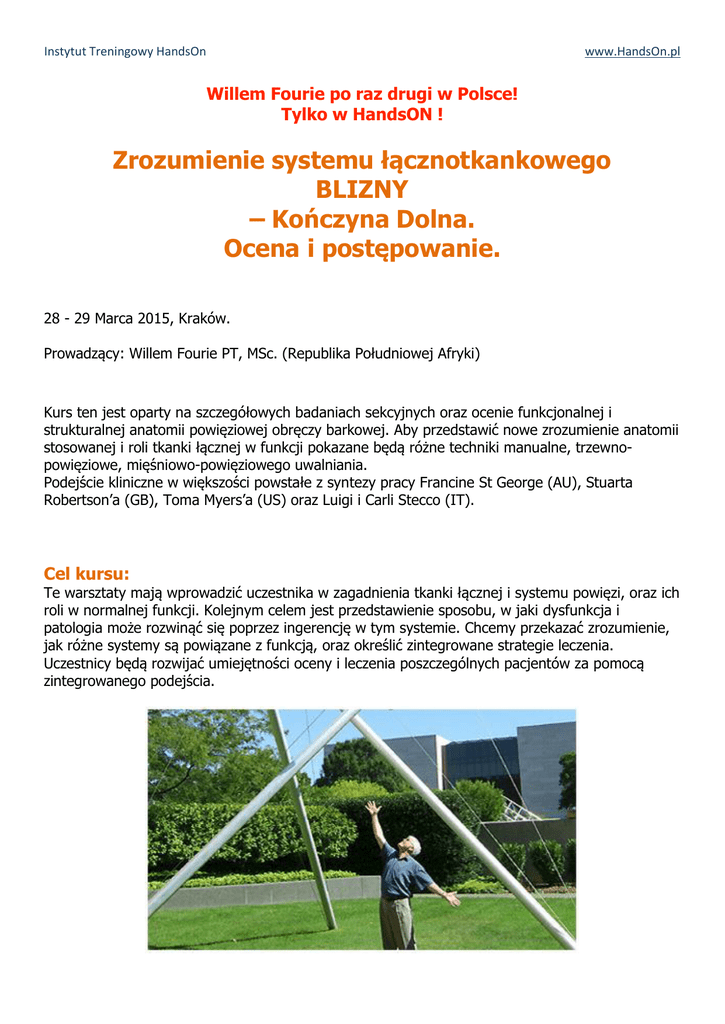 Instytut Treningowy HandsOn www.HandsOn.pl Willem Fourie po raz drugi w Polsce! Tylko w HandsON ! Zrozumienie systemu łącznotkankowego BLIZNY – Kończyna Dolna. Ocena i postępowanie. 28 - 29 Marca 2015, Kraków. Prowadzący: Willem Fourie PT, MSc. (Republika Południowej Afryki) Kurs ten jest oparty na szczegółowych badaniach sekcyjnych oraz ocenie funkcjonalnej i strukturalnej anatomii powięziowej obręczy barkowej. Aby przedstawić nowe zrozumienie anatomii stosowanej i roli tkanki łącznej w funkcji pokazane będą różne techniki manualne, trzewnopowięziowe, mięśniowo-powięziowego uwalniania. Podejście kliniczne w większości powstałe z syntezy pracy Francine St George (AU), Stuarta Robertson’a (GB), Toma Myers’a (US) oraz Luigi i Carli Stecco (IT). Cel kursu: Te warsztaty mają wprowadzić uczestnika w zagadnienia tkanki łącznej i systemu powięzi, oraz ich roli w normalnej funkcji. Kolejnym celem jest przedstawienie sposobu, w jaki dysfunkcja i patologia może rozwinąć się poprzez ingerencję w tym systemie. Chcemy przekazać zrozumienie, jak różne systemy są powiązane z funkcją, oraz określić zintegrowane strategie leczenia. Uczestnicy będą rozwijać umiejętności oceny i leczenia poszczególnych pacjentów za pomocą zintegrowanego podejścia. Instytut Treningowy HandsOn www.HandsOn.pl Elementy i tematy objęte kursem: 1. Struktura ciała: Wszystkie struktury są zaangażowane w tworzeniu jakości ruchu. Przedstawimy więc ciało, jako biotensegracyjną strukturę która znajduje się we wstępnym napięciu, które sprawia ze są możliwe właściwe funkcje mięśniowo-szkieletowe. Takie ujęcie rozszerza widzenie linearnej biomechaniki celem wyjaśnienia ruchu w bardziej realistycznym spojrzeniu na ciało, które funkcjonuje, jako system nieliniowy, gdzie małe zmiany mogą tworzyć nieproporcjonalnie duże rezultaty. 2. Tkanka łączna: Celem jest przedstawienie tkanki łącznej i powięzi, jako mikroskopowego podmiotu makroskopowej dziedziny. System powięziowy to żywa tkanka tworząca nasz „organ formy”, który może być badany, poruszany i manipulowany. Aspekty objęte szkoleniem: Struktura i klasyfikacja tkanki łącznej. Naczynia i nerwy tkanki łącznej, ich rola w transporcie płynów, propriocepcji i odczuwania bodźców. Architektura tkanki łącznej. Wyjaśnienie różnic konstrukcyjnych na poziomie makroskopowym w różnych częściach ciała z odniesieniem do funkcji i jakości ruchu. Terapeutyczne dotarcie do różnych warstw powięziowych: skóry/ naskórka/ powięzi powierzchownej/ tkanki podskórnej/ powięzi głębokiej, tkanki mięśniowo-powięziowej - jest wyjaśniane i oceniane. Funkcje i role tkanki łącznej i powięzi. Fizjologiczne zmiany w przypadku urazu, unieruchomienia, i powstawania blizn. Leczenie ran i jak tkanki reagują na terapię manualną podczas wszystkich stadiów gojenia. 3. Co przyczynia się do zaburzeń? Odpowiedź na pytanie: jak "lokalna" dysfunkcja tkanki (np. utrata ruchliwości) może przyczynić się do "globalnej" odpowiedzi organizmu (zmienione wzorce ruchowe) jest analizowana. 4. Manualna ocena i leczenie tkanki łącznej: Wyjaśnione będą zasady oceny i leczenia powięzi, a następnie praktycznie demonstrowane przez prowadzącego i ćwiczone wśród uczestników. Przedstawiona będzie klasyfikacja głębokości dotyku i palpacji tkanek. Badanie dotykowe w kierunku mobilności, elastyczności i poślizgu będzie dokładnie pokazane i ćwiczone w grupie. Uczestnicy będą się uczyć identyfikować zakres, kierunek, głębokość i jakość mobilności chorych tkanek. Po tym szkoleniu uczestnicy powinni posiadać jasne zrozumienie: Anatomii funkcjonalnej i biomechaniki kończyny dolnej. Struktury tkanki łącznej, jej klasyfikacji i jej roli w prawidłowej funkcji układu mięśniowo szkieletowego. Jak ten system może być uszkodzony przez uraz, operacje, przeciążenie, nawyki ruchowe oraz jak powstały wskutek tego wzorzec posturalny może prowadzić do dalszych uszkodzeń innych obszarów. Jak oceniać tkankę łączną/system powięziowy. I jak wszystko powyższe poprowadzi terapeutę do stworzenia najbardziej odpowiedniej strategii terapeutycznej dobranej do potrzeb indywidualnego pacjenta. Niniejsze warsztaty są intensywnym połączeniem teorii i praktyki i w związku z tym w założeniu dopuszczają udział limitowanej ilości uczestników. Instytut Treningowy HandsOn www.HandsOn.pl Program szkolenia Dzień pierwszy (09:00-17:00): 09:00 – 10:45 10:45 – 11:00 11:00 – 12:30 12:30 – 13:30 13:30 – 15:00 15:00 -15:15 15:15 – 17:00 Wprowadzenie - Moja praca I kilka słów o mnie - Nowy model ruchu I funkcji - Nasze oczekiwania Przerwa kawowa Teoria Tkanka Łączna - Klasyfikacja - Neurologia - Dynamika płynów OCENA RUCHOMOSCI POWIĘZI Skóra i powięź powierzchowna Teoria OCENA RUCHOMOSCI POWĘZI - Powięź głęboka i myofascia LECZNICZE TECHNIKI POWIĘZIOWE Praktyka OBIAD Przerwa kawowa Praktyka Praktyka ANATOMIA and BIOMECHANIKA KONCZYNY DOLNEJ - Struktury powięzi powierzchownej - Warstwy mięśni - Stawy Dzień drugi (09.00-17.00): 09:00 – 10:15 10:15 – 10:30 10:30 – 12:30 12:30 – 13:30 13:30 – 15:00 15:00 -15:15 15:15 – 17:00 ZASADY LECZENIA POWIĘZI STOPNIOWANIE DOTYKU I DOKUMENTACJA PROBLEMY KOLANA I BIODRA (WPROWADZENIE) Przerwa kawowa CZYNNIKI - Zabiegi chirurgiczne - Urazy - Postawa OCENA KONCZYNY DOLNEJ LECZENIE I TECHNIKI OBIAD Teoria Praktyka Praktyka Praktyka LECZENIE I TECHNIKI Praktyka LECZENIE I TECHNIKI DYSKUSJA I OCENA KURSU Praktyka Przerwa kawowa * Tematyka i rozłożenie w czasie może być dostosowana do potrzeb studentów Instytut Treningowy HandsOn www.HandsOn.pl Willem Fourie Jest fizjoterapeutą z ponad 30 letnim stażem pracy w RPA, międzynarodowym szkoleniowcem i wykładowcą. Prowadzi zajęcia sekcyjne na Uniwersytecie w Witwatersrandzie W swoich szkoleniach Willem kładzie nacisk na część praktyczną dzieląc się swoim