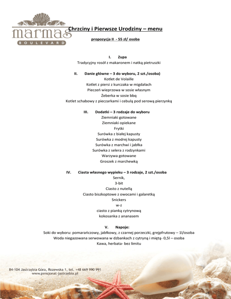 Chrzciny i Pierwsze Urodziny – menu propozycja II - 55 zł/ osoba I. Zupa Tradycyjny rosół z makaronem i natką pietruszki II. Danie główne – 3 do wyboru, 2 szt./osoba) Kotlet de Volaille Kotlet z piersi z kurczaka w migdałach Pieczeń wieprzowa w sosie własnym Żeberka w sosie bbq Kotlet schabowy z pieczarkami i cebulą pod serową pierzynką III. IV. Dodatki – 3 rodzaje do wyboru Ziemniaki gotowane Ziemniaki opiekane Frytki Surówka z białej kapusty Surówka z modrej kapusty Surówka z marchwi i jabłka Surówka z selera z rodzynkami Warzywa gotowane Groszek z marchewką Ciasta własnego wypieku – 3 rodzaje, 2 szt./osoba Sernik, 3-bit Ciasto z nutellą Ciasto biszkoptowe z owocami i galaretką Snickers w-z ciasto z pianką cytrynową kokosanka z ananasem V. Napoje: Soki do wyboru: pomarańczowy, jabłkowy, z czarnej porzeczki, grejpfrutowy – 1l/osoba Woda niegazowana serwowana w dzbankach z cytryną i miętą- 0,5l – osoba Kawa, herbata- bez limitu