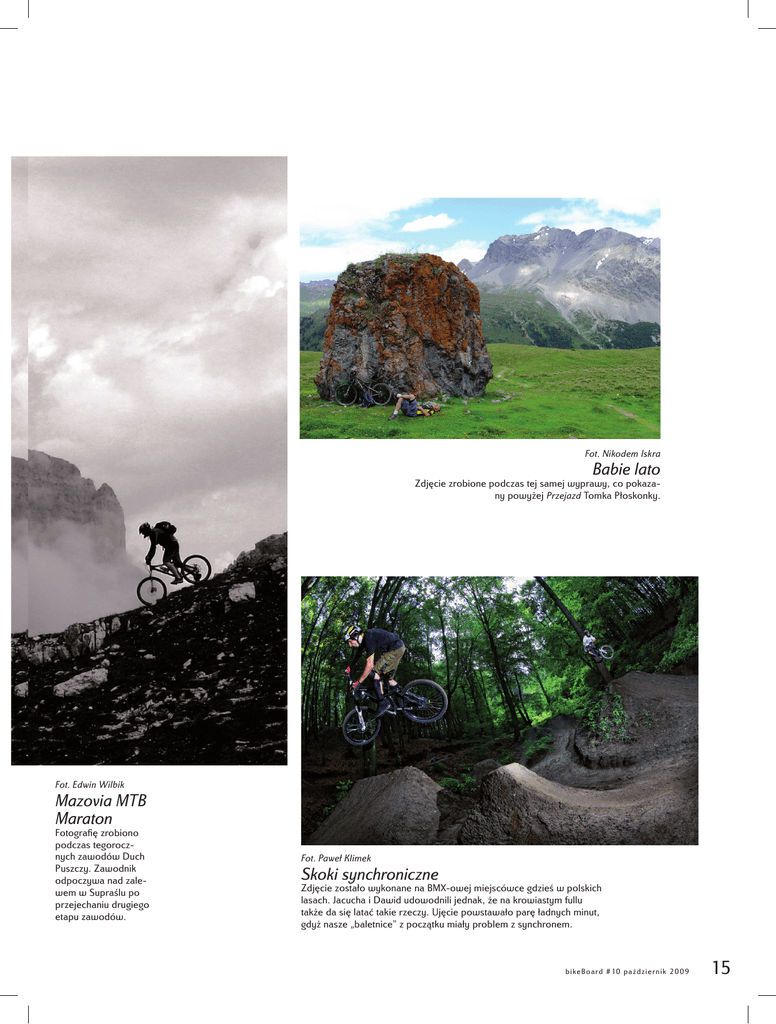 Fot. Nikodem Iskra Babie lato Zdjęcie zrobione podczas tej samej wyprawy, co pokazany powyżej Przejazd Tomka Płoskonky. Fot. Edwin Wilbik Mazovia MTB Maraton Fotografię zrobiono podczas tegorocznych zawodów Duch Puszczy. Zawodnik odpoczywa nad zalewem w Supraślu po przejechaniu drugiego etapu zawodów. Fot. Paweł Klimek Skoki synchroniczne Zdjęcie zostało wykonane na BMX-owej miejscówce gdzieś w polskich lasach. Jacucha i Dawid udowodnili jednak, że na krowiastym fullu także da się latać takie rzeczy. Ujęcie powstawało parę ładnych minut, gdyż nasze „baletnice” z początku miały problem z synchronem. bi ke Boa r d #10 p a źd zi er ni k 2 0 0 9 15