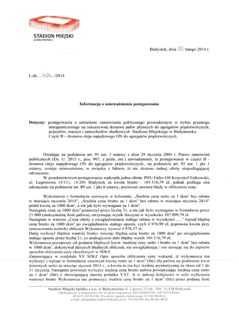 STADION MIEJSKI w BIAŁYMSTOKU Białystok, dnia V}).. lutego 2014 r. L.dz. ...'1.0.4.../2014 Informacja o unieważnieniu postępowania Dotyczy: postępowania o udzielenie zamówienia publicznego prowadzonym w trybie przetargu nieograniczonego na sukcesywną dostawę paliw płynnych do agregatów prądotwórczych, pojazdów, maszyn i samochodów służbowych Stadionu Miejskiego w Białymstoku. Część B - dostawa oleju napędowego ON do agregatów prądotwórczych. Działając na podstawie art. 93 ust. 3 ustawy z dnia 29 stycznia 2004 r. Prawo zamówień publicznych (Dz. U. 2013 r., poz. 907, z późn. zm.) zawiadamiam, iż postępowanie w części B dostawa oleju napędowego ON do agregatów prądotwórczych., na podstawie art. 93 ust. I pkt 1 ustawy, zostaje unieważnione, w związku z faktem, iż nie złożono żadnej oferty niepodlegającej odrzuceniu. W przedmiotowym postępowaniu wpłynęła jedna oferta: PHU Falko Oil Krzysztof Falkowski, ul. Legionowa 15/111, 15-291 Białystok za kwotę brutto - 104 516,79 zł, jednak podlega ona odrzuceniu na podstawie art. 89 ust. 1 pkt 6 ustawy, ponieważ zawiera błędy w obliczeniu ceny. Wykonawca z formularzu cenowym w kolumnie: „Średnia cena netto za 1 dcm^ bez rabatu w miesiącu styczniu 2014", „Średnia cena brutto za 1 dcm^ bez rabatu w miesiącu styczniu 2014" podał kwotę za 1000 dcm\ a nie jak było wymagane za 1 dcm^ Następnie cenę za 1000 dcm"* pomnożył przez liczbę 21, a nie jak było wymagane w formularzu przez 21 000 (maksymalną ilość paliwa), otrzymując wynik iloczynu w wysokości 107 099,79 zł. Następnie w wierszu „Cena oferty z uwzględnieniem stałego rabatu w wysokości ...." wpisał błędną cenę brutto za 1000 dcm^ po uwzględnieniu stałego upustu, czyli 4 976,99 zł, poprawna kwota przy zastosowaniu techniki obliczeń Wykonawcy wynosi 4 976,57 zł. Dalej wyliczył błędnie wartość brutto, mnożąc błędną cenę brutto za 1000 dcm"* po uwzględnieniu stałego upustu przez liczbę 21, co analogicznie dało błędny wynik 104 516,79 zł. Wykonawca począwszy od podania błędnych kwot: średniej ceny netto i brutto za 1 dcm"* bez rabatu w 1000 dcm-\ dokonywał dalszych błędnych obliczeń, nie uwzględniając i nie stosując się do zapisów sposobu obliczenia ceny określonych w SIWZ. Zamawiający w rozdziale XV SIWZ Opis sposobu obliczenia ceny wskazał, iż wykonawca ma wyliczyć i wpisać w formularzu cenowym kwotę netto za 1 dcm' (litr) dla paliwa na podstawie kwot dziennych netto za miesiąc styczeń 2014 r., a kwota ta ma być średnią arytmetyczną za okres od 1 do 31 stycznia. Następnie powinien wyliczyć średnią cenę brutto paliwa powiększając średnią cenę netto za 1 dcm-* (litr) o obowiązującą stawkę podatku VAT. A w dalszej kolejności w celu wyliczenia wartości brutto Wykonawca ma pomnożyć średnia cenę brutto za 1 dcm' (litr) przez podaną ilość Stadion Miejski S p ó ł k a z o.o. w B i a ł y m s t o k u ul. L i p o w a 32 lok, 304, 15-428 Białystok Sąd Rejonowy w Białymstoku Wydział Gospodarczy KRS 0000452595. NIP 5423230046; RKGON 200763186; Wysokość kapitału zakładowego: 22 000 000.00 zł e-mail: sekretariatrajstadion.bialystok.pł teł: 796 650 000. rax: 85 661 08 02 STADION MIEJSKI w BIAŁYMSTOKU paliwa. Ostatecznie, aby wyliczyć wartość zamówienia po upuście. Wykonawca powinien łączną wartość brutto za zakup paliwa, pomniejszyć o udzielony stały rabat. Natomiast Wykonawca, jak zostało to opisane powyżej wartość zamówienia po upuście obliczył w następujący sposób: mnożąc błędną cenę brutto za 1000 dcm' po uwzględnieniu stałego upustu przez liczbę 21, co analogicznie dało błędny wynik 104 516,79 zł. Teoretyzując, iż przyjmując stawkę za 1 dcm' i przesuwając przecinek w podanej przez Wykonawcę wartości za 1000 dcm' otrzymujemy kwotę 4,15 zł netto za 1 dcm'. Po przeliczeniu przez 23% podatku V A T otrzymalibyśmy kwotę brutto za 1 dcm' w wysokości 5,10 zł brutto. Następnie obliczając wartość brutto po przemnożeniu przez 21 000 dcm' (maksymalna ilość paliwa) otrzymalibyśmy 107 100,00 zł. Zgodnie z zapisami SIWZ kwotę 107 100,00 należałoby pomniejszyć o upust w wysokości 2,42%, co dałoby kwotę po upuście 104 508,18 zł. Dodatkowo w formularzu ofertowym Wykonawca wpisał inną kwotę brutto, niż wyliczył w formularzu cenowym - 104 516,96 zł brutto (formularz cenowy - 104 516,79 zł brutto), wyliczając kwotę netto oraz podatek V A T w odniesieniu do wpisanej kwoty brutto. W/w błędy nie mogą zostać uznane za omyłki rachunkowe, zgodnie z art. 87 ust. 2 pkt 2 ustawy, gdyż omyłka rachunkowa to omyłka w przeprowadzaniu rachunków na liczbach, która ma charakter oczywisty, widoczny na pierwszy rzut oka (sygn. akt: KIO/UZP 30/10), co jak widać z opisu powyżej pokazuje wręcz przeciwną sytuację. Błąd w obliczeniu ceny, w tym przypadku polega na wadliwym doborze przez Wykonawcę elementu mającego wpływ na obliczenie wysokości wartości zamówienia po upuście. Wykonawca przyjął do obliczeń inne dane i inny sposób obliczenia ceny niż określony w SIWZ (zamiast wyliczyć wartość brutto po upuście w sposób następujący: łączną wartość brutto za zakup paliwa, pomniejszyć o udzielony stały rabat. Wykonawca policzył to w ten sposób: mnożąc cenę brutto za 1000 dcm' po uwzględnieniu stałego upustu przez liczbę 21), w związku z czym nieprawidłowo posłużył się elementami kalkulacji ceny, co przełożyło się na wystąpienie błędu w obliczeniu ceny i to bez względu na skalę uchybienia. Dodatkowo mnogość błędów w formularzu ofertowym oraz rozbieżność podanych kwot brutto między formularzami, sprawia, iż Zamawiający nie może w tak znaczny sposób ingerować w cenę oferty. W związku z czym poprawienie przedmiotowego błędu z obiektywnych względów jest niedopuszczalne, z uwagi na fakt, iż taka korekta ingerowałaby w sposób nieuprawniony 