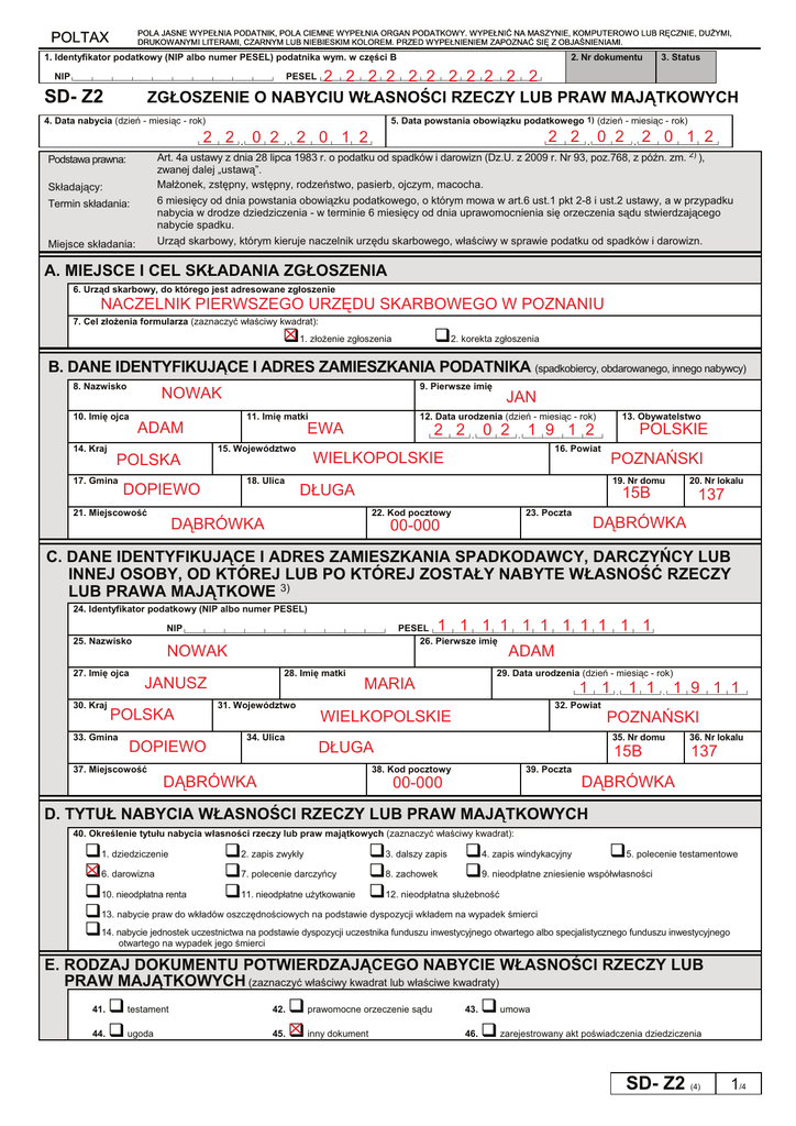 POLA JASNE WYPE!NIA PODATNIK, POLA CIEMNE WYPE!NIA ORGAN PODATKOWY. WYPE!NI" NA MASZYNIE, KOMPUTEROWO LUB R#CZNIE, DU$YMI, DRUKOWANYMI LITERAMI, CZARNYM LUB NIEBIESKIM KOLOREM. PRZED WYPE!NIENIEM ZAPOZNA" SI# Z OBJA%NIENIAMI. POLTAX 1. Identyfikator podatkowy (NIP albo numer PESEL) podatnika wym. w cz!"ci B 2. Nr dokumentu 3. Status 2 2 2 2 2 2 2 2 2 2 2 ZG#OSZENIE O NABYCIU W#ASNO$CI RZECZY LUB PRAW MAJ%TKOWYCH NIP!""""#""""#""""#""""#""""#""""#""""#""""#""""#""""$ SD- Z2 PESEL !""""#""""#""""#""""#""""#""""#""""#""""#""""#""""#""""$ 5. Data powstania obowi&zku podatkowego 1) (dzie& - miesi'c - rok) 4. Data nabycia (dzie& - miesi'c - rok) 2 2 2 2 0 2 2 0 1 2 !""""#""""$-!""""#""""$-!""""#""""#""""#""""$ 0 2 2 0 1 2 !""""#""""$-!""""#""""$-!""""#""""#""""#""""$ Art. 4a ustawy z dnia 28 lipca 1983 r. o podatku od spadków i darowizn (Dz.U. z 2009 r. Nr 93, poz.768, z pó(n. zm. 2) ), zwanej dalej „ustaw'”. Ma)*onek, zst+pny, wst+pny, rodze&stwo, pasierb, ojczym, macocha. Podstawa prawna: Sk)adaj'cy: Termin sk)adania: 6 miesi+cy od dnia powstania obowi'zku podatkowego, o którym mowa w art.6 ust.1 pkt 2-8 i ust.2 ustawy, a w przypadku nabycia w drodze dziedziczenia - w terminie 6 miesi+cy od dnia uprawomocnienia si+ orzeczenia s'du stwierdzaj'cego nabycie spadku. Miejsce sk)adania: Urz'd skarbowy, którym kieruje naczelnik urz+du skarbowego, w)a,ciwy w sprawie podatku od spadków i darowizn. A. MIEJSCE I CEL SK#ADANIA ZG#OSZENIA 6. Urz&d skarbowy, do którego jest adresowane zg'oszenie NACZELNIK PIERWSZEGO URZ!DU SKARBOWEGO W POZNANIU 7. Cel z'o(enia formularza (zaznaczy- w)a,ciwy kwadrat): !1. z)o*enie zg)oszenia !2. korekta zg)oszenia B. DANE IDENTYFIKUJ%CE I ADRES ZAMIESZKANIA PODATNIKA (spadkobiercy, obdarowanego, innego nabywcy) 8. Nazwisko 10. Imi! ojca 14. Kraj 11. Imi! matki ADAM POLSKA 17. Gmina 9. Pierwsze imi! NOWAK EWA 15. Województwo 18. Ulica DOPIEWO 21. Miejscowo") JAN 12. Data urodzenia (dzie& - miesi'c - rok) 13. Obywatelstwo POLSKIE 2 2 0 2 1 9 1 2 !""""#""""$-!""""#""""$-!""""#""""#""""#""""$ 16. Powiat WIELKOPOLSKIE POZNAŃSKI 19. Nr domu DŁUGA 22. Kod pocztowy DĄBRÓWKA 20. Nr lokalu 15B 23. Poczta 00-000 137 DĄBRÓWKA C. DANE IDENTYFIKUJ%CE I ADRES ZAMIESZKANIA SPADKODAWCY, DARCZY*CY LUB INNEJ OSOBY, OD KTÓREJ LUB PO KTÓREJ ZOSTA#Y NABYTE W#ASNO$+ RZECZY LUB PRAWA MAJ%TKOWE 3) 24. Identyfikator podatkowy (NIP albo numer PESEL) NIP!""""#""""#""""#""""#""""#""""#""""#""""#""""#""""$ 25. Nazwisko 27. Imi! ojca 1 1 1 1 1 1 1 1 1 1 1 PESEL !""""#""""#""""#""""#""""#""""#""""#""""#""""#""""#""""$ 26. Pierwsze imi! ADAM NOWAK 28. Imi! matki JANUSZ 29. Data urodzenia (dzie& - miesi'c - rok) MARIA 1 1 1 1 1 9 1 1 !""""#""""$-!""""#""""$-!""""#""""#""""#""""$ 30. Kraj POLSKA 33. Gmina DOPIEWO 37. Miejscowo") 31. Województwo 34. Ulica 32. Powiat WIELKOPOLSKIE 35. Nr domu D!UGA 15B 38. Kod pocztowy D!BRÓWKA POZNA!SKI 39. Poczta 00-000 36. Nr lokalu 137 D!BRÓWKA D. TYTU# NABYCIA W#ASNO$CI RZECZY LUB PRAW MAJ%TKOWYCH 40. Okre"lenie tytu'u nabycia w'asno"ci rzeczy lub praw maj&tkowych (zaznaczy- w)a,ciwy kwadrat): !1. dziedziczenie !2. zapis zwyk)y !3. dalszy zapis !4. zapis windykacyjny !5. polecenie testamentowe !6. darowizna !7. polecenie darczy&cy !8. zachowek !9. nieodp)atne zniesienie wspó)w)asno,ci !10. nieodp)atna renta !11. nieodp)atne u*ytkowanie !12. nieodp)atna s)u*ebno,!13. nabycie praw do wk)adów oszcz+dno,ciowych na podstawie dyspozycji wk)adem na wypadek ,mierci !14. nabycie jednostek uczestnictwa na podstawie dyspozycji uczestnika funduszu inwestycyjnego otwartego albo specjalistycznego funduszu inwestycyjnego otwartego na wypadek jego ,mierci E. RODZAJ DOKUMENTU POTWIERDZAJ%CEGO NABYCIE W#ASNO$CI RZECZY LUB PRAW MAJ%TKOWYCH (zaznaczy- w)a,ciwy kwadrat lub w)a,ciwe kwadraty) ! testament 44. ! ugoda 41. ! prawomocne orzeczenie s'du 45. ! inny dokument 42. ! umowa 46. ! zarejestrowany akt po,wiadczenia dziedziczenia 43. SD- Z2 (4) 1/4 8 7 6 5 4 3 2 1 Lp. m2; m2; m2 ; !1. w'asno") !2. u(ytkowanie wieczyste typ . . . . . . . . , Jednostki uczestnictwa w funduszu inwestycyjnym otwartym albo specjalistycznym funduszu inwestycyjnym 84. $rodki pieni!(ne rok produkcji . . . . . . . . . 79. model. . . . . . . . . . . . . . . , nr rejestracyjny. . . . . . . . . . . . . . . , Samochód osobowy, marka . . . . . . . . . . . . . . . , 74. nr Kw . . . . . . . . . . . . . . . . . . . . . . mieszkalnym o pow. u(ytk. . . . . . . . . . . . . . m2; Gospodarstwo rolne o '&cznej pow. . . . . . . . ha, w tym zabudowane budynkiem nr Kw . . . . . . . . . . . . . . . . . . . . . . 68. zabudowana budynkiem mieszkalnym o pow. u(ytk. . . . . . . . . nr Kw . . . . . . . . . . . . . . . m2 ; !2. u(ytkowanie wieczyste 62. Nieruchomo") o powierzchni gruntu. . . . . . . . !1. w'asno") nr Kw . . . . . . . . . . . . . . . . . . . . . . Nieruchomo") niezabudowana o powierzchni gruntu . . . . . . . . . . . . . 57. wraz z udzia'em w nieruchomo"ci wspólnej nr Kw . . . . . . . . . . . . . . . . . . . . . . . 52. Lokal mieszkalny stanowi&cy odr!bn& nieruchomo") o pow. u(ytk. . . . . . . m2; nr Kw . . . . . . . . . . . . . . . . . . . . . . Spó'dzielcze w'asno"ciowe prawo do lokalu mieszkalnego o pow. u(ytk. . . . . 47. a Rzeczy lub prawa maj&tkowe wed'ug stanu w dniu nabycia 85. 80. 75. 69. 63. 58. 53. 48. ! ! ! ! ! ! ! ! b 100% 86. 81. 76. 70. 64. 59. 54. 49. / ..... ..... / ..... ..... / ..... ..... / ..... ..... / ..... ..... / ..... ..... / ..... ..... / ..... ..... c udzia' 4) Wielko") udzia'u nabytego w rzeczy lub w prawie maj&tkowym d 87. Nazwa towarzystwa funduszy inwestycyjnych PKO BP 82. Miejsce, z którego s& nabywane "rodki (nale*y poda- nazw+ banku, SKOK-u lub inne miejsce po)o*enia ,rodków): 77. 71. 65. 60. 55. 50. Miejsce po'o(enia rzeczy lub wykonywania prawa maj&tkowego (adres) POLA JASNE WYPE!NIA PODATNIK, POLA CIEMNE WYPE!NIA ORGAN PODATKOWY. WYPE!NI" NA MASZYNIE, KOMPUTEROWO LUB R#CZNIE, DU$YMI, DRUKOWANYMI LITERAMI, CZARNYM LUB NIEBIESKIM KOLOREM. PRZED WYPE!NIENIEM ZAP