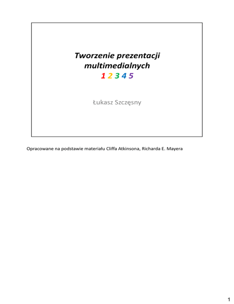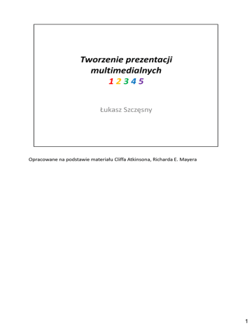 Opracowane na podstawie materiału Cliffa Atkinsona, Richarda E. Mayera 1 Projekty slajdów w PowerPoint powinny być zgodne z tym, jak ludzie się uczą. Istnieje ugruntowana wiedza, jak działa umysł i zmysły. Kiedy przedstawiamy ilustracje i animacje słuchacz jest w stanie utrzymać tylko kilka zdjęć w pamięci roboczej w jednym czasie. Te obrazy odzwierciedlają jedynie fragmenty przedstawionego materiału, a nie są dokładną kopią prezentowanego tematu. Kiedy prowadzimy narrację słuchacz jest w stanie utrzymać tylko kilka słów w pamięci roboczej w jednym czasie. Te słowa odzwierciedlają fragmenty przedstawionego materiału, a nie są dokładną kopią zaprezentowanego tematu. Słuchacze, aby mogli zrozumieć prezentowany temat, zwracają uwagę na materiały, organizują je w spójną strukturę psychiczną i integrują je z ich wcześniejszą wiedzą. Ludzie są aktywnymi przetwórcami, którzy szukają sensu prezentacji multimedialnych. 2 Sposób działania umysłu ma trzy konsekwencje dla przygotowywania prezentacji w PowerPoint: 1) Używając PowerPoint należy używać zarówno wizualnych, jak i werbalnych form prezentacji, 2) Przeładowując slajdy informacjami łatwo przeciążyć systemy poznawcze ludzi, 3) Prezentacje powinny pomóc uczącym się wybrać, uporządkować i zintegrować przedstawione informacje. Zbiór zasad opartych na badaniach bierze te konsekwencje pod uwagę i może pomóc zmniejszyć obciążenie poznawcze podczas tworzenia prezentacji Pomocne zasady opracowane przez Cliff Atkinsona, Richard E. Mayera to: 1) Napisz jasny nagłówek 2) Używaj sortowania slajdów 3) Zmniejsz obciążenia wizualne 4) Wizualizuj słowa 5) Usuń każdy element, który nie wspiera idei W dalszej części zostaną one szczegółowo omówione. Ich zastosowanie prowadzi do bardziej efektywnej komunikacji podczas wystąpień. 3 Ludzie uczą się lepiej, gdy materiał jest zorganizowany w wyraźne kontury i nagłówki Tytuły to wspólna część wszystkich slajdów w PowerPoincie. Powszechnie stosowane tytuły zazwyczaj służą jako drogowskazy do powiedzenia gdzie jesteś, ale nie wyjaśniają przesłania, które chcesz przedstawić na slajdzie. Przybierają one formę haseł: Promocja projektu, Harmonogram, Budżet, Plan budowy, Wzrost sprzedaży itd. Zamiast pisać tytuł na górze wymyśl nagłówek, który wyjaśnia ideę każdego slajdu. Podsumuj jedną nadrzędną ideą slajdu, używając jasnego i konwersacyjnego języka (wykorzystując podmiot i orzeczenie). Może to być np. „W jaki sposób będziemy promować projekt”, „Promocja projektu dała nam wiele frajdy”, „Ile kosztuje projekt?”, „Wydaliśmy 100.000 zł”, „Jakie będą etapy budowy?”, „Co zrobiliśmy żeby więcej sprzedawać?” itd. Proces pisania nagłówków pomoże Ci pokazać swoje własne postrzeganie tematu. W dokumencie PowerPoint nagłówki ograniczamy do 40 pkt, maksymalnie na 2 linie tak, aby mogły być odczytane z tyłu sali i mogły być również odczytywane z widoku „Sortowanie slajdów”. Jedną z technik wymyślania nagłówków jest przemyślenie tego, jakie tematy chcemy poruszyć przy konkretnym slajdzie, a następnie mówimy innej osobie jednym zdaniem o czym jest ten slajd. Wtedy to jest nasz nagłówek. 4 Ludzie uczą się lepiej, gdy informacje są prezentowane w przyswajalnych fragmentach. Łatwo dać się wciągnąć w projektowanie każdego pojedynczego slajdu, ponieważ widok "Normalny" programu to miejsce, gdzie skupiamy się pojedynczych elementach. A gdy się skupiamy na jednym slajdzie, łatwo dorzucać informacje, które służą jedynie wyłączaniu zrozumienia przez słuchaczy. Rozbij informacje za pośrednictwem programu PowerPoint, nawiązując często do widoku „Sortowanie slajdów”. Z tej perspektywy można przeczytać co napisałeś w nagłówkach i zobaczyć w jaki sposób przebiega prezentacja. Twoja historia powinna mieć odpowiednie tempo przejścia z jednego slajdu do następnego, bez długich przerw na jeden slajd. Kiedy przerwy są długie lub masz dużo do powiedzenia, to znaczy, że trzeba przełamać treść, którą przesuwa się do większej ilości slajdów. Jeśli masz zbyt wiele slajdów na przyznany czas, w którym możesz mówić, powróć do widoku „Sortowania slajdów” i pomyśl o sposobach, dzięki którym możesz skrócić swoją historię aż do jej istoty. 5 Ludzie rozumieją multimedialne wyjaśnienie lepiej, gdy słowa są przedstawiane jako narracja Jeśli podchodzimy do slajdu programu PowerPoint jako dokumentu programu Word, to oczywiste jest napełnienie go dużą ilością tekstu. Często mówcy traktują slajdy jak zwykłe notatki. Słuchacze równie dobrze mogliby przeczytać zawartość prezentacji, zamiast słuchać monotonnego głosu prelegenta. Ale kiedy wyświetlasz slajdy PowerPoint na ekranie, multimedialne zasady są lepsze niż zasady drukowania. Przeciążenia wizualne można zmniejszyć przenosząc tekst poza ekran. Kiedy opowiadasz treść zamiast ją pokazywać przesuwasz ją do przetwarzania przez kanał słuchowy. Aby tego technicznie dokonać w PowerPoint używamy część widoku notatek pod slajdem. W ten sposób otrzymujemy podział programu na dwie strefy – wizualną na górze i werbalną poniżej. Zapisanie swojego wystąpienia pomaga przemyśleć pomysły, zwiększa zaufanie do tematu, zmniejsza zapotrzebowanie na notatki oraz zapewnia kompleksowe i przydatne materiały informacyjne, gdy prezentacja jest drukowana w formacie Strony notatek. To co teraz czytasz jest tego świetnym dowodem. Tak właśnie została przygotowana moja prezentacja. 6 Ludzie uczą się lepiej słów i obrazów niż samych słów. Często można zauważyć serię slajdów wypełnionych czarnymi punktami. Przypominają nam one co chcemy powiedzieć, gdy występujemy. Stanowią one dla nas zapis, że objęte tam rzeczy chcemy przedstawić. Jednak komunikacja pisemna jest procesem kognitywnym, l