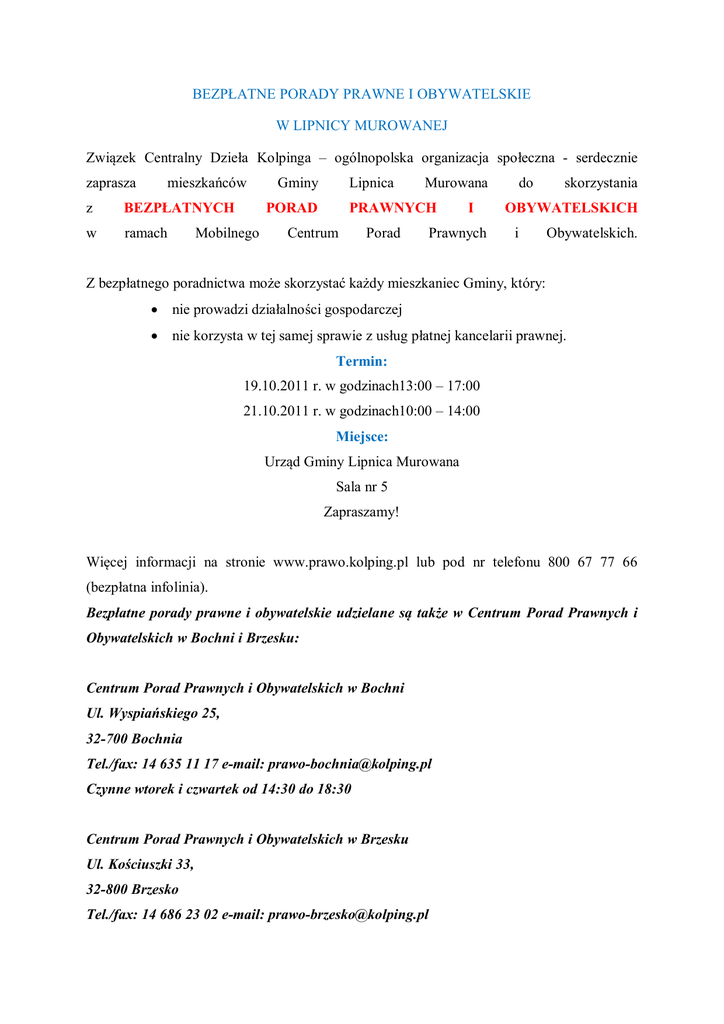 BEZPŁATNE PORADY PRAWNE I OBYWATELSKIE W LIPNICY