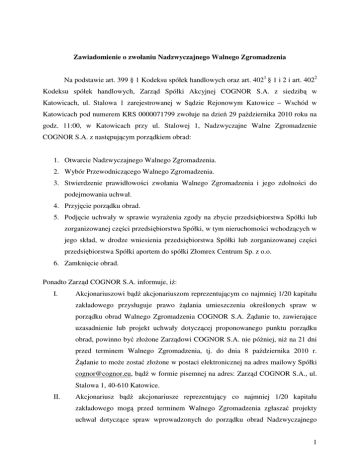Zawiadomienie o zwołaniu Nadzwyczajnego Walnego Zgromadzenia Na podstawie art. 399 § 1 Kodeksu spółek handlowych oraz art. 4021 § 1 i 2 i art. 4022 Kodeksu spółek handlowych, Zarząd Spółki Akcyjnej COGNOR S.A. z siedzibą w Katowicach, ul. Stalowa 1 zarejestrowanej w Sądzie Rejonowym Katowice – Wschód w Katowicach pod numerem KRS 0000071799 zwołuje na dzień 29 października 2010 roku na godz. 11:00, w Katowicach przy ul. Stalowej 1, Nadzwyczajne Walne Zgromadzenie COGNOR S.A. z następującym porządkiem obrad: 1. Otwarcie Nadzwyczajnego Walnego Zgromadzenia. 2. Wybór Przewodniczącego Walnego Zgromadzenia. 3. Stwierdzenie prawidłowości zwołania Walnego Zgromadzenia i jego zdolności do podejmowania uchwał. 4. Przyjęcie porządku obrad. 5. Podjęcie uchwały w sprawie wyrażenia zgody na zbycie przedsiębiorstwa Spółki lub zorganizowanej części przedsiębiorstwa Spółki, w tym nieruchomości wchodzących w jego skład, w drodze wniesienia przedsiębiorstwa Spółki lub zorganizowanej części przedsiębiorstwa Spółki aportem do spółki Złomrex Centrum Sp. z o.o. 6. Zamknięcie obrad. Ponadto Zarząd COGNOR S.A. informuje, iż: I. Akcjonariuszowi bądź akcjonariuszom reprezentującym co najmniej 1/20 kapitału zakładowego przysługuje prawo żądania umieszczenia określonych spraw w porządku obrad Walnego Zgromadzenia COGNOR S.A. Żądanie to, zawierające uzasadnienie lub projekt uchwały dotyczącej proponowanego punktu porządku obrad, powinno być złożone Zarządowi COGNOR S.A. nie później, niż na 21 dni przed terminem Walnego Zgromadzenia, tj. do dnia 8 października 2010 r. Żądanie to może zostać złożone w postaci elektronicznej na adres mailowy Spółki [email protected], bądź w formie pisemnej na adres: Zarząd COGNOR S.A., ul. Stalowa 1, 40-610 Katowice. II. Akcjonariusz bądź akcjonariusze reprezentujący co najmniej 1/20 kapitału zakładowego mogą przed terminem Walnego Zgromadzenia zgłaszać projekty uchwał dotyczące spraw wprowadzonych do porządku obrad Nadzwyczajnego 1 Walnego Zgromadzenia lub spraw, które mają zostać wprowadzone do porządku obrad. Zgłoszenie to może być dokonane w postaci elektronicznej na adres mailowy Spółki [email protected], bądź w formie pisemnej na adres: Zarząd COGNOR S.A., ul. Stalowa 1, 40-610 Katowice. III. Każdy akcjonariusz może podczas Walnego Zgromadzenia zgłaszać projekty uchwał dotyczących spraw wprowadzonych do porządku obrad. IV. Akcjonariusz będący osobą fizyczną może uczestniczyć w Walnym Zgromadzeniu COGNOR S.A. oraz wykonywać prawo głosu osobiście lub przez pełnomocnika. Akcjonariusz nie będący osobą fizyczną może uczestniczyć w Nadzwyczajnym Walnym Zgromadzeniu oraz wykonywać prawo głosu przez osobę uprawnioną do składania oświadczeń woli w jego imieniu lub przez pełnomocnika. Pełnomocnictwo winno być, pod rygorem nieważności, sporządzone w formie pisemnej lub udzielone w postaci elektronicznej. Spółka od dnia publikacji niniejszego ogłoszenia na swojej stronie internetowej www.cognor.eu udostępnia do pobrania formularz zawierający wzór pełnomocnictwa w postaci elektronicznej oraz formularz pozwalający na wykonywanie głosu przez pełnomocnika (tzw. instrukcja). O udzieleniu pełnomocnictwa w postaci elektronicznej należy zawiadomić Spółkę przy wykorzystaniu środków komunikacji elektronicznej, w postaci wypełnionego i podpisanego formularza pełnomocnictwa, w formacie PDF, przesłanego pocztą elektroniczną na adres mailowy: [email protected] Informacja o udzieleniu pełnomocnictwa powinna zawierać również zakres pełnomocnictwa poprzez wskazanie liczby akcji, z których wykonywane będzie prawo głosu oraz datę i nazwę walnego zgromadzenia COGNOR S.A., na którym prawa te będą wykonywane. Udzielenie pełnomocnictwa w postaci elektronicznej nie wymaga opatrzenia bezpiecznym podpisem elektronicznym weryfikowanym przy pomocy ważnego kwalifikowanego certyfikatu. Celem weryfikacji ważności pełnomocnictwa udzielonego w drodze elektronicznej, Spółka zastrzega sobie prawo identyfikacji akcjonariusza i pełnomocnika. W szczególności weryfikacja ta może polegać na zwrotnym pytaniu zadanym w formie elektronicznej lub kontakcie telefonicznym, mającym na celu potwierdzenie danych dotyczących tożsamości akcjonariusza i pełnomocnika oraz potwierdzenie faktu udzielenia pełnomocnictwa i jego zakresu. Brak udzielenia odpowiedzi na zadawane pytania w trakcie weryfikacji będzie traktowany jako brak możliwości weryfikacji udzielenia pełnomocnictwa i będzie stanowić podstawę dla odmowy dopuszczenia 2 pełnomocnika do udziału w Walnym Zgromadzeniu. Prawo do reprezentowania akcjonariusza nie będącego osobą fizyczną winno wynikać z okazanego przy sporządzaniu listy obecności odpisu z właściwego rejestru, składanego w oryginale lub kopii potwierdzonej za zgodność z oryginałem przez notariusza. Osoba bądź osoby udzielające pełnomocnictwa w imieniu akcjonariusza nie będącego osobą fizyczną, powinny być uwidocznione w aktualnym odpisie z właściwego rejestru. Przesłanie drogą elektroniczną ww. dokumentów nie zwalnia z obowiązku przedstawienia przez pełnomocnika, przy sporządzaniu listy obecności osób uprawnionych do uczestnictwa w Walnym Zgromadzeniu COGNOR S.A., dokumentów służących jego identyfikacji. Po przybyciu na Walne Zgromadzenie, a przed podpisaniem listy obecności, pełnomocnik celem potwierdzenia tożsamości powinien okazać oryginał dokumentu tożsamości. V. Statut COGNOR S.A. nie przewiduje możliwości uczestniczenia i wypowiadania się w trakcie Walnego Zgromadzenia przy wykorzystaniu środków komunikacji elektronicznej. VI. Statut COGNOR S.A. i Regulamin Walnego Zgromadzenia COGNOR S.A. nie przewidują oddawania głosu drogą korespondencyjną jak również przy wykorzystaniu środków komunikacji elektronicznej. VII. Prawo uczestniczenia w Walnym Zgromadzen