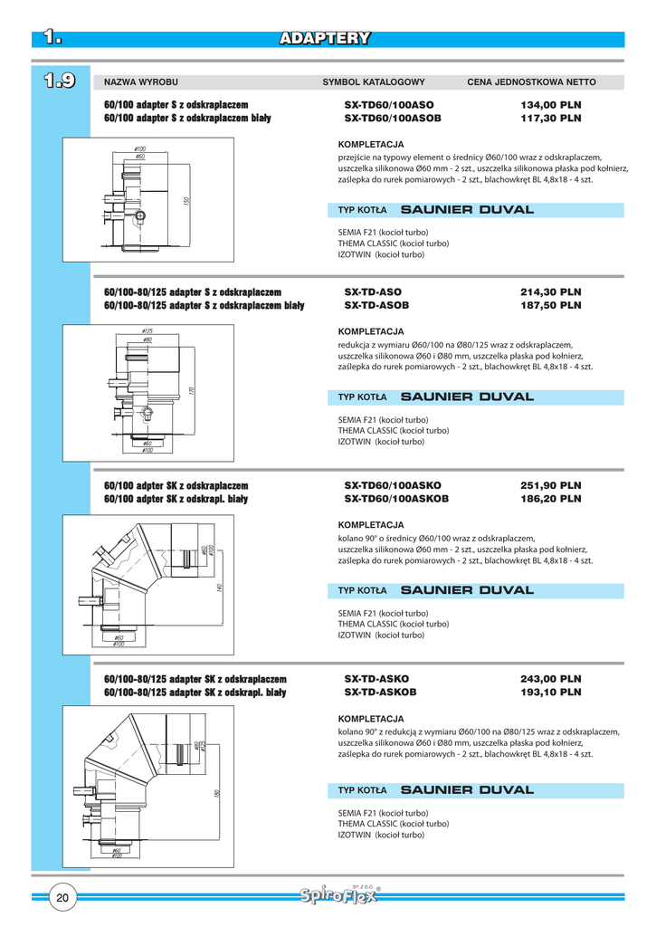 NAZWA WYROBU 60/100 adapter S z odskraplaczem 60/100 adapter S z odskraplaczem biały SYMBOL KATALOGOWY SX-TD60/100ASO SX-TD60/100ASOB CENA JEDNOSTKOWA NETTO 134,00 PLN 117,30 PLN KOMPLETACJA przejście na typowy element o średnicy Ø60/100 wraz z odskraplaczem, uszczelka silikonowa Ø60 mm - 2 szt., uszczelka silikonowa płaska pod kołnierz, zaślepka do rurek pomiarowych - 2 szt., blachowkręt BL 4,8x18 - 4 szt. TYP KOT¸A SAUNIER DUVAL SEMIA F21 (kocioł turbo) THEMA CLASSIC (kocioł turbo) IZOTWIN (kocioł turbo) 60/100-80/125 adapter S z odskraplaczem 60/100-80/125 adapter S z odskraplaczem biały SX-TD-ASO SX-TD-ASOB 214,30 PLN 187,50 PLN KOMPLETACJA redukcja z wymiaru Ø60/100 na Ø80/125 wraz z odskraplaczem, uszczelka silikonowa Ø60 i Ø80 mm, uszczelka płaska pod kołnierz, zaślepka do rurek pomiarowych - 2 szt., blachowkręt BL 4,8x18 - 4 szt. TYP KOT¸A SAUNIER DUVAL SEMIA F21 (kocioł turbo) THEMA CLASSIC (kocioł turbo) IZOTWIN (kocioł turbo) 60/100 adpter SK z odskraplaczem 60/100 adpter SK z odskrapl. biały SX-TD60/100ASKO SX-TD60/100ASKOB 251,90 PLN 186,20 PLN KOMPLETACJA kolano 90° o średnicy Ø60/100 wraz z odskraplaczem, uszczelka silikonowa Ø60 mm - 2 szt., uszczelka płaska pod kołnierz, zaślepka do rurek pomiarowych - 2 szt., blachowkręt BL 4,8x18 - 4 szt. TYP KOT¸A SAUNIER DUVAL SEMIA F21 (kocioł turbo) THEMA CLASSIC (kocioł turbo) IZOTWIN (kocioł turbo) 60/100-80/125 adapter SK z odskraplaczem 60/100-80/125 adapter SK z odskrapl. biały SX-TD-ASKO SX-TD-ASKOB 243,00 PLN 193,10 PLN KOMPLETACJA kolano 90° z redukcją z wymiaru Ø60/100 na Ø80/125 wraz z odskraplaczem, uszczelka silikonowa Ø60 i Ø80 mm, uszczelka płaska pod kołnierz, zaślepka do rurek pomiarowych - 2 szt., blachowkręt BL 4,8x18 - 4 szt. TYP KOT¸A SAUNIER DUVAL SEMIA F21 (kocioł turbo) THEMA CLASSIC (kocioł turbo) IZOTWIN (kocioł turbo) 20 NAZWA WYROBU 60/100 adapter rozdzielczy S 60/100 adapter rozdzielczy S biały SYMBOL KATALOGOWY CENA JEDNOSTKOWA NETTO SX-TD60/100ARS SX-TD60/100ARSB 146,60 PLN 144,10 PLN KOMPLETACJA adapter rozdzielczy owalny Ø60/100 na 2xØ80 z króćcami pomiarowymi, uszczelka silikonowa Ø60mm i Ø80 mm-2szt., uszczelka płaska pod kołnierz, zaślepka do rurek pomiarowych - 2 szt., blachowkręt BL 4,8x18 - 4 szt. TYP KOT¸A SAUNIER DUVAL SEMIA F21 (kocioł turbo) THEMA CLASSIC (kocioł turbo) IZOTWIN (kocioł turbo) 60/100 adapter VS 60/100 adapter VS biały SX-TD-AV SX-TD-AVB 55,00 PLN 51,90 PLN KOMPLETACJA przejście na typowy element o średnicy Ø60/100, tuleja gumowa na rurę powietrzną, opaska zaciskowa - 2 szt. uszczelka silikonowa Ø60 mm TYP KOT¸A SAUNIER DUVAL ISOTWIN CONDENS (kocioł kondensacyjny) ISOFAST 21 CONDENS (kocioł kondensacyjny) THELIA CONDENS (kocioł kondensacyjny) 60/100-80/125 adapter VS 60/100-80/125 adapter VS biały SX-TD6/8AV SX-TD6/8AVB 133,40 PLN 89,90 PLN KOMPLETACJA redukcja z wymiaru Ø60/100 na Ø80/125, uszczelka silikonowa Ø80 mm, tuleja gumowa na rurę powietrzną, opaska zaciskowa - 2 szt. TYP KOT¸A SAUNIER DUVAL ISOTWIN CONDENS (kocioł kondensacyjny) ISOFAST 21 CONDENS (kocioł kondensacyjny) THELIA CONDENS (kocioł kondensacyjny) 60/100 adapter VSK 60/100 adapter VSK biały SX-TD-AVK SX-TD-AVKB 170,40 PLN 140,40 PLN KOMPLETACJA kolano 90° o średnicy Ø60/100, tuleja gumowa na rurę powietrzną, opaska zaciskowa - 2 szt. uszczelka silikonowa Ø60 mm TYP KOT¸A SAUNIER DUVAL ISOTWIN CONDENS (kocioł kondensacyjny) ISOFAST 21 CONDENS (kocioł kondensacyjny) THELIA CONDENS (kocioł kondensacyjny) 21 NAZWA WYROBU 60/100-80/125 adapter VSK 60/100-80/125 adapter VSK bia∏y SYMBOL KATALOGOWY CENA JEDNOSTKOWA NETTO SX-TD6/8AVK SX-TD6/8AVKB 193,90 PLN 149,90 PLN KOMPLETACJA kolano z redukcją z wymiaru Ø60/100 na Ø80/125, uszczelka silikonowa Ø80 mm, tuleja gumowa na rurę powietrzną, opaska zaciskowa - 2 szt. TYP KOT¸A SAUNIER DUVAL ISOTWIN CONDENS (kocioł kondensacyjny) ISOFAST 21 CONDENS (kocioł kondensacyjny) THELIA CONDENS (kocioł kondensacyjny) Adapter VST Adapter VST biały SX-TD-AVT SX-TD-AVTB 246,70 PLN 163,90 PLN KOMPLETACJA trójnik Ø60/100 - z odnogą powietrzną krótszą o 20 mm od odnogi spalinowej, tuleja gumowa na rurę powietrzną, opaska zaciskowa - 2 szt. uszczelka silikonowa Ø60 mm TYP KOT¸A SAUNIER DUVAL ISOTWIN CONDENS (kocioł kondensacyjny) ISOFAST 21 CONDENS (kocioł kondensacyjny) THELIA CONDENS (kocioł kondensacyjny) 60/100-80/125 adapter VST 60/100-80/125 adapter VST biały SX-TD6/8AVT SX-TD6/8AVTB 265,20 PLN 218,20 PLN KOMPLETACJA trójnik redukcyjny z wymiaru Ø60/100 na Ø80/125, uszczelka silikonowa Ø80 mm, tuleja gumowa na rurę powietrzną, opaska zaciskowa - 2 szt. TYP KOT¸A SAUNIER DUVAL ISOTWIN CONDENS (kocioł kondensacyjny) ISOFAST 21 CONDENS (kocioł kondensacyjny) THELIA CONDENS (kocioł kondensacyjny) 22