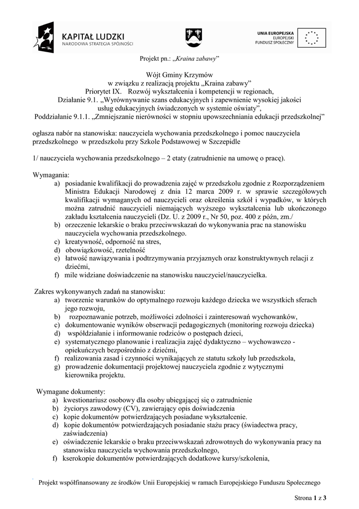 Projekt pn.: ,,Kraina zabawy” Wójt Gminy Krzymów w związku z realizacją projektu „Kraina zabawy” Priorytet IX. Rozwój wykształcenia i kompetencji w regionach, Działanie 9.1. „Wyrównywanie szans edukacyjnych i zapewnienie wysokiej jakości usług edukacyjnych świadczonych w systemie oświaty”, Poddziałanie 9.1.1. „Zmniejszanie nierówności w stopniu upowszechniania edukacji przedszkolnej” ogłasza nabór na stanowiska: nauczyciela wychowania przedszkolnego i pomoc nauczyciela przedszkolnego w przedszkolu przy Szkole Podstawowej w Szczepidle 1/ nauczyciela wychowania przedszkolnego – 2 etaty (zatrudnienie na umowę o pracę). Wymagania: a) posiadanie kwalifikacji do prowadzenia zajęć w przedszkolu zgodnie z Rozporządzeniem Ministra Edukacji Narodowej z dnia 12 marca 2009 r. w sprawie szczegółowych kwalifikacji wymaganych od nauczycieli oraz określenia szkół i wypadków, w których można zatrudnić nauczycieli niemających wyższego wykształcenia lub ukończonego zakładu kształcenia nauczycieli (Dz. U. z 2009 r., Nr 50, poz. 400 z późn, zm./ b) orzeczenie lekarskie o braku przeciwwskazań do wykonywania prac na stanowisku nauczyciela wychowania przedszkolnego. c) kreatywność, odporność na stres, d) obowiązkowość, rzetelność e) łatwość nawiązywania i podtrzymywania przyjaznych oraz konstruktywnych relacji z dziećmi, f) mile widziane doświadczenie na stanowisku nauczyciel/nauczycielka. Zakres wykonywanych zadań na stanowisku: a) tworzenie warunków do optymalnego rozwoju każdego dziecka we wszystkich sferach jego rozwoju, b) rozpoznawanie potrzeb, możliwości zdolności i zainteresowań wychowanków, c) dokumentowanie wyników obserwacji pedagogicznych (monitoring rozwoju dziecka) d) współdziałanie i informowanie rodziców o postępach dzieci, e) systematycznego planowanie i realizacjia zajęć dydaktyczno – wychowawczo opiekuńczych bezpośrednio z dziećmi, f) realizowania zasad i czynności wynikających ze statutu szkoły lub przedszkola, g) prowadzenie dokumentacji projektowej nauczyciela zgodnie z wytycznymi kierownika projektu. Wymagane dokumenty: a) kwestionariusz osobowy dla osoby ubiegającej się o zatrudnienie b) życiorys zawodowy (CV), zawierający opis doświadczenia c) kopie dokumentów potwierdzających posiadane wykształcenie. d) kopie dokumentów potwierdzających posiadanie stażu pracy (świadectwa pracy, zaświadczenia) e) oświadczenie lekarskie o braku przeciwwskazań zdrowotnych do wykonywania pracy na stanowisku nauczyciela wychowania przedszkolnego, f) kserokopie dokumentów potwierdzających dodatkowe kursy/szkolenia, Projekt współfinansowany ze środków Unii Europejskiej w ramach Europejskiego Funduszu Społecznego Strona 1 z 3 Projekt pn.: ,,Kraina zabawy” g) oświadczenie o wyrażeniu zgody na przetwarzanie danych osobowych zawartych w ofercie dla potrzeb niezbędnych do realizacji procesu rekrutacji, zgodnie z Ustawą z dnia 29 sierpnia 1997 r. o ochronie danych osobowych /Dz. U. z 2002 r., Nr 101, poz. 926 z poźn. zm./ , h) oświadczenie kandydata o korzystaniu w pełni praw publicznych i niekaralności za przestępstwa umyślne, 2/ pomoc nauczyciela przedszkolnego - 1 etat (zatrudnienie na umowę-zlecenie) Wymagania: a) wykształcenie minimum średnie (preferowane wyższe pedagogiczne) b) książeczka badań dla celów sanitarno – epidemiologicznych, c) stan zdrowia pozwalający na zatrudnienie jako pomoc nauczyciela wychowania przedszkolnego; d) niekaralność za przestępstwo popełnione umyślnie; e) mile widziane doświadczenie zawodowe Zakres obowiązków: a) współpraca z nauczycielką oddziału w trosce o dobro i bezpieczeństwo dziecka, b) spełnianie czynności opiekuńczych wobec dzieci, c) pomoc nauczycielce w przygotowaniu sali i pomocy do zajęć, d) czynne uczestniczenie w zajęciach, spacerach i wycieczkach, e) pomoc dzieciom w czynnościach samoobsługowych i sanitarno – higienicznych, f) utrzymywanie czystości i porządku w powierzonych pomieszczeniach, g) wykonywanie z własnej inicjatywy zadań i czynności w ramach posiadanych kompetencji, h) wykonywanie innych poleceń dyrektora wynikających z organizacji pracy. Wymagane dokumenty: a) życiorys (curriculum vitae), b) poświadczone za zgodność kserokopie dokumentów potwierdzających wykształcenie i obywatelstwo polskie, c) oświadczenie o braku przeciwskazań zdrowotnych do pracy na stanowisku pomocy nauczyciela wychowania przedszkolnego, d) Oświadczenie o wyrażeniu zgody na przetwarzanie danych osobowych zawartych w ofercie dla potrzeb niezbędnych do realizacji procesu rekrutacji, zgodnie z Ustawą z dnia 29 sierpnia 1997 r. o ochronie danych osobowych /Dz. U. z 2002 r., Nr 101, poz. 926 z poźn. zm./ , e) oświadczenie kandydata o korzystaniu w pełni praw publicznych i niekaralności za przestępstwa umyślne f) aktualna książeczka zdrowia do celów sanitarno-epidemiologicznych – dostarczona w momencie podpisywania umowy o pracę. Termin i miejsce składania dokumentów: Dokumenty należy składać do Urzędu Gminy Krzymowie , 62-513 Krzymów do dnia 22 listopada 2012 roku (czwartek) do godz.14.00 w zaklejonej kopercie z dopiskiem: ,,Nabór na stanowisko nauczyciela wychowania przedszkolnego w Szkole Podstawowej w Szczepidle” lub Projekt współfinansowany ze środków Unii Europejskiej w ramach Europejskiego Funduszu Społecznego Strona 2 z 3 Projekt pn.: ,,Kraina zabawy” „Nabór na stanowisko pomocy nauczyciela wychowania przedszkolnego w Szkole Podstawowej w Szczepidle Dokumenty przedkładane w formie kopii powinny być potwierdzone przez kandydata klauzulą ,,za zgodność z oryginałem’’. Osoby zrekrutowanie będą zobowiązane przed podpisaniem umowy do dostarczenia zaświadczenia o niekaralności z Krajowego Rejestru Karnego i wykonania badań lekarskich. Zatrudnienie osób wyłonionych w konkursie nastąpi na czas realizacji projektu. Projekt współfinansowany ze środków Unii Eu