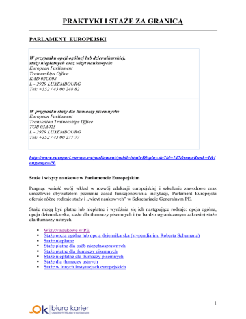 PRAKTYKI I STAŻE ZA GRANICĄ PARLAMENT EUROPEJSKI W przypadku opcji ogólnej lub dziennikarskiej, staży niepłatnych oraz wizyt naukowych: European Parliament Traineeships Office KAD 02C008 L - 2929 LUXEMBOURG Tel: +352 / 43 00 248 82 W przypadku staży dla tłumaczy pisemnych: European Parliament Translation Traineeships Office TOB 03A025 L - 2929 LUXEMBOURG Tel: +352 / 43 00 277 77 http://www.europarl.europa.eu/parliament/public/staticDisplay.do?id=147&pageRank=1&l anguage=PL Staże i wizyty naukowe w Parlamencie Europejskim Pragnąc wnieść swój wkład w rozwój edukacji europejskiej i szkolenie zawodowe oraz umożliwić obywatelom poznanie zasad funkcjonowania instytucji, Parlament Europejski oferuje różne rodzaje staży i „wizyt naukowych” w Sekretariacie Generalnym PE. Staże mogą być płatne lub niepłatne i wyróżnia się ich następujące rodzaje: opcja ogólna, opcja dziennikarska, staże dla tłumaczy pisemnych i (w bardzo ograniczonym zakresie) staże dla tłumaczy ustnych. Wizyty naukowe w PE Staże opcja ogólna lub opcja dziennikarska (stypendia im. Roberta Schumana) Staże niepłatne Staże płatne dla osób niepełnosprawnych Staże płatne dla tłumaczy pisemnych Staże niepłatne dla tłumaczy pisemnych Staże dla tłumaczy ustnych Staże w innych instytucjach europejskich 1 Staże płatne Staże płatne przeznaczone są wyłącznie dla absolwentów uniwersytetów lub szkól wyższych. Celem staży jest umożliwienie stażystom uzupełnienia wiedzy nabytej podczas studiów oraz zapoznania sie przez nich z działalnością Unii Europejskiej, a zwłaszcza Parlamentu Europejskiego. Wyróżnia sie następujące rodzaje staży płatnych: stypendium im. Roberta Schumana, opcja ogólna stypendium im. Roberta Schumana, opcja dziennikarska. Kandydaci ubiegający sie o stypendium im. Roberta Schumana, opcja ogólna, powinni miedzy innymi wykazać sie napisaniem pracy o istotnej wadze, w ramach uzyskania dyplomu uniwersyteckiego lub publikowania pracy naukowej. Jedno ze stypendiów, zwane „stypendium im. Chrisa Pieninga”, przyznawane jest kandydatowi, którego praca dotyczyła w szczególności kontaktów pomiędzy Unia Europejska a Stanami Zjednoczonymi. Kandydaci do staży im. Roberta Schumana, opcja dziennikarska, powinni wykazać sie doświadczeniem zawodowym poświadczonym publikacjami bądź wpisem do stowarzyszenia dziennikarzy danego państwa członkowskiego Unii Europejskiej, lub uzyskaniem kwalifikacji w zakresie dziennikarstwa uznawanych w państwach członkowskich Unii Europejskiej lub w państwach kandydujących do przystąpienia do UE. Staże płatne przyznawane są na okres pięciu miesięcy. Daty rozpoczęcia staży i ostateczne terminy przyjmowania podań: Początek stażu Data zapisania 1 marca od 15 sierpnia do 15 października do godz. 24.00 1 października od 15 marca do 15 maja do godz. 24.00 Radzimy nie czekać do ostatniego dnia wyznaczonego terminu ze zgłoszeniem swojej kandydatury, aby uniknąć ewentualnego przeciążenia systemu spowodowanego duża ilością składanych jednocześnie podań. W przypadku zainteresowania stażem płatnym w ramach tej opcji, kandydaci proszeni są o przeczytanie Przepisów Wewnętrznych Dotyczących Staży i Wizyt Naukowych w Sekretariacie Parlamentu Europejskiego. Zwracamy tez uwagę na warunki przyjęcia na staż. W przypadku wybrania kandydatury danej osoby wymagane będą od niej następujące dokumenty: kopia paszportu lub dowodu tożsamości kopia dyplomu/kopie dyplomów uniwersyteckich dokument stanowiący obiektywna ocenę umiejętności kandydata przygotowany przez osobę prowadzącą praktykę zawodowa w przypadku opcji ogólnej – poświadczenie pisemnej pracy (zaświadczenie, strona tytułowa, dyplom itp.) 2 w przypadku opcji dziennikarskiej – publikacja lub wpis do stowarzyszenia dziennikarzy danego państwa członkowskiego Unii Europejskiej lub dyplom poświadczający uzyskanie wyksztalcenia dziennikarskiego, uznawany w państwach członkowskich Unii Europejskiej lub w państwach kandydujących do przystąpienia do UE. Na etapie składania kandydatury nie należy wysyłać ww. dokumentów. Prośba o nie jest kierowana dopiero w momencie zaproponowania danej osobie stażu. W przypadku zaproponowania stażu i niedostarczenia przez kandydata(-tke) kompletnej dokumentacji, o której mowa wyżej, staż nie dojdzie do skutku. Jeżeli kandydat(-ka) spełnia warunki przyjęcia, proszony(-a) jest o wypełnienie podania w formie elektronicznej. Zwracamy tez uwagę kandydatów na fakt, ze dane wpisane do podania w formie elektronicznej, pozostawionego w stanie nieaktywnym przez 30 minut, zostaną utracone. Radzimy, zatem uważnie przeczytać „Przepisy Wewnętrzne Dotyczące Staży i Wizyt Naukowych w Sekretariacie Parlamentu Europejskiego” przed wypełnieniem podania. Podania nie można modyfikować droga elektroniczna – jego składanie jest jednoetapowe. Przeznaczone do wydruku kopie modelowych formularzy o staż płatny i staż niepłatny mogą służyć pomocą w przygotowaniu dokumentacji przed dokonaniem zapisu droga elektroniczna. Po wypełnieniu formularza należy wydrukować podsumowane i przed jego zatwierdzeniem upewnić się, że wszystkie dane są kompletne. UWAGA: Niekompletne podania będą odrzucane automatycznie. Po zatwierdzeniu/ wysłaniu podania w formie elektronicznej, otrzymają Państwo na podany adres poczty elektronicznej automatyczne potwierdzenie. Wiadomość ta zawiera numer potwierdzający, który należy podawać we wszelkiej korespondencji dotyczącej stażu oraz link do podsumowania wniosku w formacie pdf, którego papierowej wersji mogą wymagać odpowiednie służby w przypadku przyjęcia Państwa na staż. Staże niepłatne Parlament Europejski oferuje młodym ludziom będącym posiadaczami matury i absolwentom studiów wyższych lub odpowiadającym im studiów technicznych możliwość ubiegania się o niepłatne staże praktyczne. Na staż w pierwszej kolej