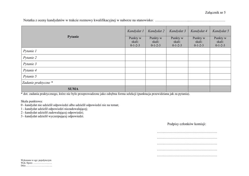 Załącznik nr 5 Notatka z oceny kandydatów w trakcie rozmowy kwalifikacyjnej w naborze na stanowisko: ………………………...………………………… Pytanie Kandydat 1 Kandydat 2 Kandydat 3 Kandydat 4 Kandydat 5 Punkty w skali: 0-1-2-3 Punkty w skali: 0-1-2-3 Punkty w skali: 0-1-2-3 Punkty w skali: 0-1-2-3 Punkty w skali: 0-1-2-3 Pytanie 1 Pytanie 2 Pytanie 3 Pytanie 4 Pytanie 5 Zadanie praktyczne * SUMA * dot. zadania praktycznego, które nie było przeprowadzone jako odrębna forma selekcji (punktacja przewidziana jak za pytania). Skala punktowa: 0 - kandydat nie udzielił odpowiedzi albo udzielił odpowiedzi nie na temat; 1 - kandydat udzielił odpowiedzi niezadowalającej; 2 - kandydat udzielił zadowalającej odpowiedzi; 3 - kandydat udzielił wyczerpującej odpowiedzi. Podpisy członków komisji: …………………………………………… …………………………………………… …………………………………………… …………………………………………… …………………………………………… Wykonano w egz. pojedynczym Wyk./Sporz. ……………….….. Dnia ……………………….…...