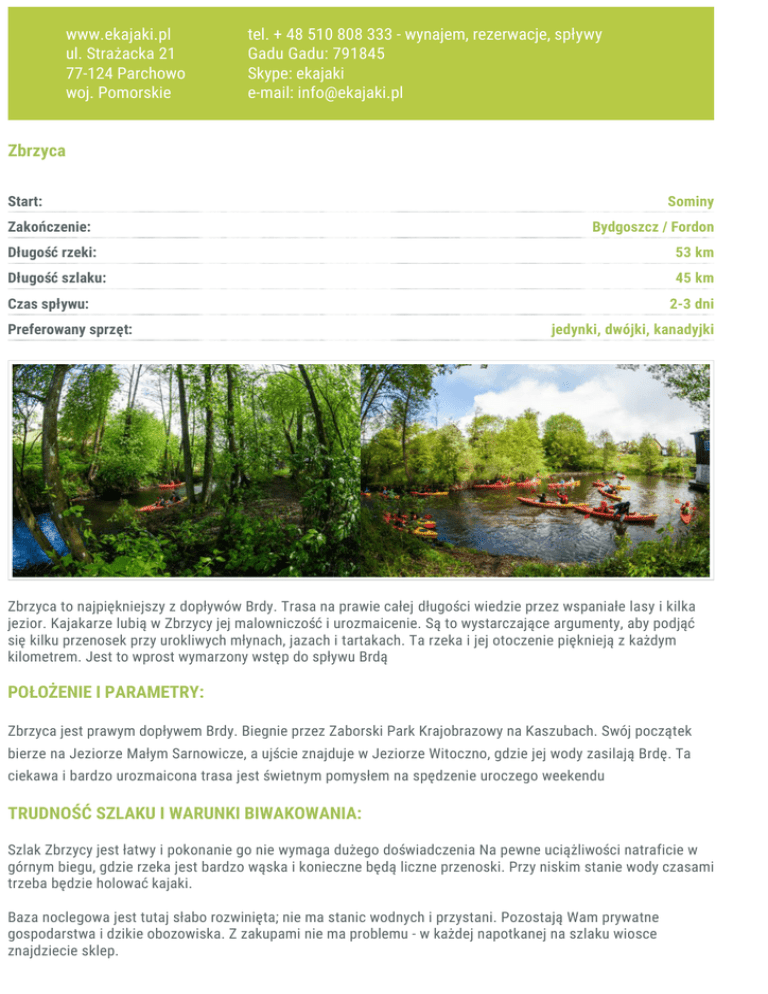 www.ekajaki.pl ul. Strażacka 21 77-124 Parchowo woj. Pomorskie tel. + 48 510 808 333 - wynajem, rezerwacje, spływy Gadu Gadu: 791845 Skype: ekajaki e-mail: [email protected] Zbrzyca Start: Zakończenie: Sominy Bydgoszcz / Fordon Długość rzeki: 53 km Długość szlaku: 45 km Czas spływu: Preferowany sprzęt: 2-3 dni jedynki, dwójki, kanadyjki Zbrzyca to najpiękniejszy z dopływów Brdy. Trasa na prawie całej długości wiedzie przez wspaniałe lasy i kilka jezior. Kajakarze lubią w Zbrzycy jej malowniczość i urozmaicenie. Są to wystarczające argumenty, aby podjąć się kilku przenosek przy urokliwych młynach, jazach i tartakach. Ta rzeka i jej otoczenie pięknieją z każdym kilometrem. Jest to wprost wymarzony wstęp do spływu Brdą POŁOŻENIE I PARAMETRY: Zbrzyca jest prawym dopływem Brdy. Biegnie przez Zaborski Park Krajobrazowy na Kaszubach. Swój początek bierze na Jeziorze Małym Sarnowicze, a ujście znajduje w Jeziorze Witoczno, gdzie jej wody zasilają Brdę. Ta ciekawa i bardzo urozmaicona trasa jest świetnym pomysłem na spędzenie uroczego weekendu TRUDNOŚĆ SZLAKU I WARUNKI BIWAKOWANIA: Szlak Zbrzycy jest łatwy i pokonanie go nie wymaga dużego doświadczenia Na pewne uciążliwości natraficie w górnym biegu, gdzie rzeka jest bardzo wąska i konieczne będą liczne przenoski. Przy niskim stanie wody czasami trzeba będzie holować kajaki. Baza noclegowa jest tutaj słabo rozwinięta; nie ma stanic wodnych i przystani. Pozostają Wam prywatne gospodarstwa i dzikie obozowiska. Z zakupami nie ma problemu - w każdej napotkanej na szlaku wiosce znajdziecie sklep. OPIS SZLAKU ZBRZYCY: Spływ Zbrzycą proponujemy rozpocząć od Jeziora Dywańskiego albo Jeziora Sominńskiego. Warto zwiedzić miejscowość Sominy z mini-skansenem i urzekającym drewnianym kościółkiem z XVIII w. Pierwszy etap szlaku Zbrzycy prowadzi przez trzy jeziora - Somińskie, Kruszyńskie oraz Parzyn. Odcinek od miejscowości Parzyn jest wspaniały – mamy tu wysokie strome brzegi porośnięte lasem mieszanym. Płynąc dalej napotkacie na lewy dopływ Zbrzycy - Młosienicę - chętni mogą spróbować sił i popłynąć pod prąd do miejscowości Leśno (nieco ponad 3 km). Dalej miniecie Kaszuby i Rolbik. Kolejną opcją jest możliwość wpłynięcia na jezioro Milachowo. Kolejny dopływ Zbrzycy to Kulawa (8 km). Będąc tu warto odwiedzić rezerwat krajobrazowy Doliny Rzeki Kulawy. Dalej miniecie miejscowość Laska wpływając do Rezerwatu jeziora o tej samej nazwie. Kolejne jezioro to Jezioro Księże z prawym dopływem rzeki Kłoniecznicy. Przed Wami zaczyną pojawiać się jeziora rynnowe: Długie, Parszczenica i Śluza - oznacza to, że jesteście już blisko ujścia Zbrzycy. Ten końcowy odcinek jest najpiękniejszy. Szerokie na 20m koryto i urozmaicona linia brzegowa pozostawiają niezapomniane wrażenia. Za miejscowością Zbrzyca otwiera się Jezioro Witoczno, w którym rzeka łączy się z Brdą na 150 km szlaku. Pomimo licznych przenosek warto przepłynąć się przepięknym szlakiem Zbrzycy. Obcowanie z dziewiczą naturą i dzikość tej rzeki są nie do przecenienia. NAJWAŻNIEJSZE ATRAKCJE ZBRZYCY: Sominy Kościół Matki Boskiej Królowej Polski z XVIII w. Sominy zabytkowa zagroda-dom owczarza wraz z owczarnią z XIX w. Malownicze kaszubskie jeziora Zaborski Park Krajobrazowy