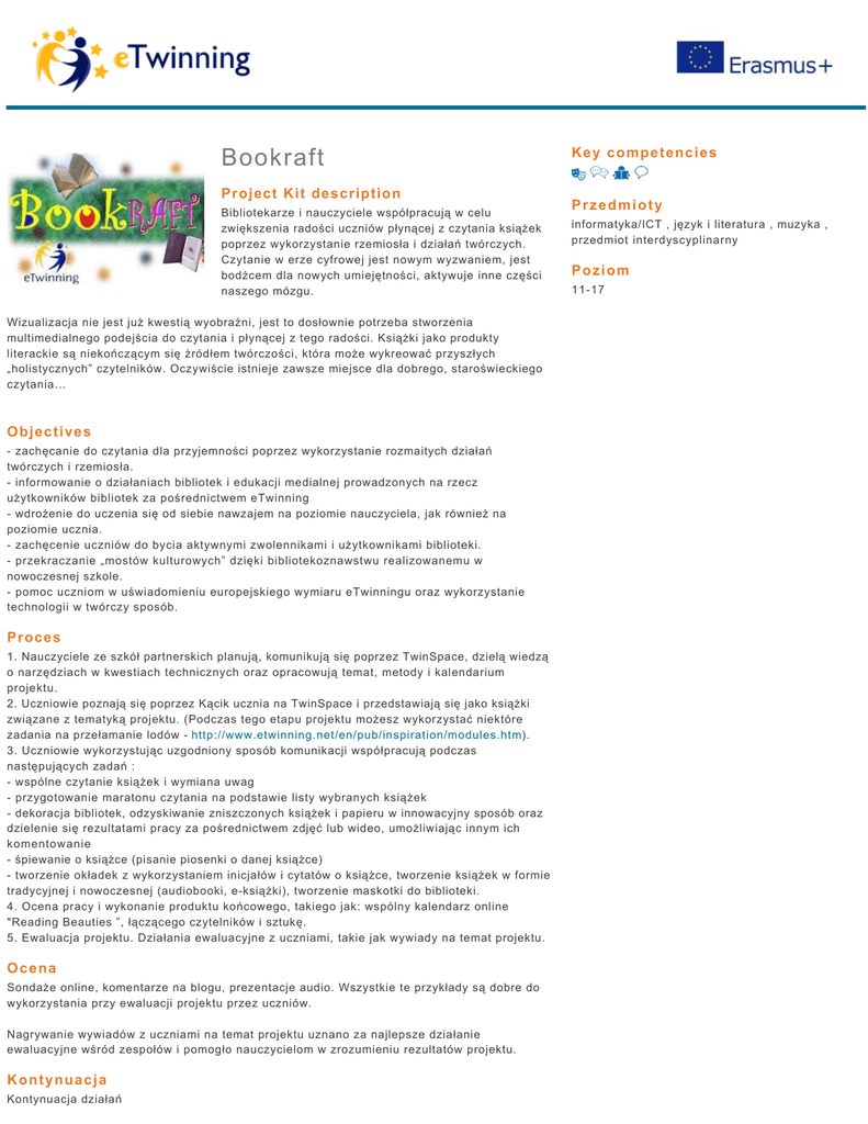 Bookraft Project Kit description Bibliotekarze i nauczyciele współpracują w celu zwiększenia radości uczniów płynącej z czytania książek poprzez wykorzystanie rzemiosła i działań twórczych. Czytanie w erze cyfrowej jest nowym wyzwaniem, jest bodźcem dla nowych umiejętności, aktywuje inne części naszego mózgu. Wizualizacja nie jest już kwestią wyobraźni, jest to dosłownie potrzeba stworzenia multimedialnego podejścia do czytania i płynącej z tego radości. Książki jako produkty literackie są niekończącym się źródłem twórczości, która może wykreować przyszłych „holistycznych” czytelników. Oczywiście istnieje zawsze miejsce dla dobrego, staroświeckiego czytania… Objectives - zachęcanie do czytania dla przyjemności poprzez wykorzystanie rozmaitych działań twórczych i rzemiosła. - informowanie o działaniach bibliotek i edukacji medialnej prowadzonych na rzecz użytkowników bibliotek za pośrednictwem eTwinning - wdrożenie do uczenia się od siebie nawzajem na poziomie nauczyciela, jak również na poziomie ucznia. - zachęcenie uczniów do bycia aktywnymi zwolennikami i użytkownikami biblioteki. - przekraczanie „mostów kulturowych” dzięki bibliotekoznawstwu realizowanemu w nowoczesnej szkole. - pomoc uczniom w uświadomieniu europejskiego wymiaru eTwinningu oraz wykorzystanie technologii w twórczy sposób. Proces 1. Nauczyciele ze szkół partnerskich planują, komunikują się poprzez TwinSpace, dzielą wiedzą o narzędziach w kwestiach technicznych oraz opracowują temat, metody i kalendarium projektu. 2. Uczniowie poznają się poprzez Kącik ucznia na TwinSpace i przedstawiają się jako książki związane z tematyką projektu. (Podczas tego etapu projektu możesz wykorzystać niektóre zadania na przełamanie lodów - http://www.etwinning.net/en/pub/inspiration/modules.htm). 3. Uczniowie wykorzystując uzgodniony sposób komunikacji współpracują podczas następujących zadań : - wspólne czytanie książek i wymiana uwag - przygotowanie maratonu czytania na podstawie listy wybranych książek - dekoracja bibliotek, odzyskiwanie zniszczonych książek i papieru w innowacyjny sposób oraz dzielenie się rezultatami pracy za pośrednictwem zdjęć lub wideo, umożliwiając innym ich komentowanie - śpiewanie o książce (pisanie piosenki o danej książce) - tworzenie okładek z wykorzystaniem inicjałów i cytatów o książce, tworzenie książek w formie tradycyjnej i nowoczesnej (audiobooki, e-książki), tworzenie maskotki do biblioteki. 4. Ocena pracy i wykonanie produktu końcowego, takiego jak: wspólny kalendarz online "Reading Beauties ”, łączącego czytelników i sztukę. 5. Ewaluacja projektu. Działania ewaluacyjne z uczniami, takie jak wywiady na temat projektu. Ocena Sondaże online, komentarze na blogu, prezentacje audio. Wszystkie te przykłady są dobre do wykorzystania przy ewaluacji projektu przez uczniów. Nagrywanie wywiadów z uczniami na temat projektu uznano za najlepsze działanie ewaluacyjne wśród zespołów i pomogło nauczycielom w zrozumieniu rezultatów projektu. Kontynuacja Kontynuacja działań - przygotowanie prezentacji o krajach partnerskich i swoim kraju (zrealizowane w bibliotece i Key competencies Przedmioty informatyka/ICT , język i literatura , muzyka , przedmiot interdyscyplinarny Poziom 11-17 - przygotowanie prezentacji o krajach partnerskich i swoim kraju (zrealizowane w bibliotece i poza nią przy wykorzystaniu źródeł informacji dostępnych w bibliotece szkolnej, Internetu, przedmiotów codziennego użytku jako symboli naszych kultur) - przygotowanie pantomimy na temat projektu z wszystkimi partnerami za pośrednictwem różnych narzędzi technologicznych i przedstawienie jej za pomocą wideokonferencji. - nauczyciele umieszczają posty na Twitterze, publikują artykuły i prezentacje, przyłączają się do grupy eTwinning dla nauczycieli i rozpowszechniają pomysły. - wykorzystanie zdobytych doświadczeń w celu rozpoczęcia partnerstwa Comeniusa - wykorzystanie upublicznionej strony jako e-książki podczas przyszłych lekcji. eTwinning jest częścią Erasmus+, programu Unii Europejskiej wspierającego edukację, szkolenia, inicjatywy młodzieżowe oraz sportowe