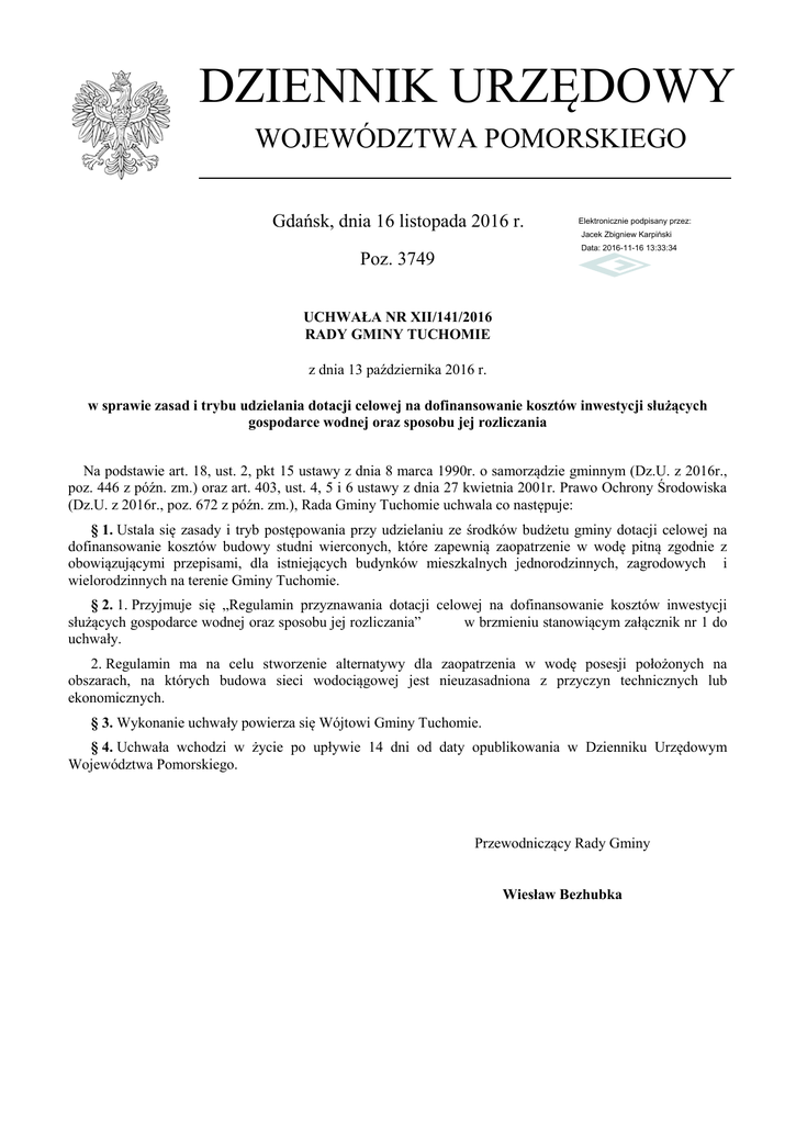 DZIENNIK URZĘDOWY WOJEWÓDZTWA POMORSKIEGO Gdańsk, dnia 16 listopada 2016 r. Elektronicznie podpisany przez: Jacek Zbigniew Karpiński Data: 2016-11-16 13:33:34 Poz. 3749 UCHWAŁA NR XII/141/2016 RADY GMINY TUCHOMIE z dnia 13 października 2016 r. w sprawie zasad i trybu udzielania dotacji celowej na dofinansowanie kosztów inwestycji służących gospodarce wodnej oraz sposobu jej rozliczania Na podstawie art. 18, ust. 2, pkt 15 ustawy z dnia 8 marca 1990r. o samorządzie gminnym (Dz.U. z 2016r., poz. 446 z późn. zm.) oraz art. 403, ust. 4, 5 i 6 ustawy z dnia 27 kwietnia 2001r. Prawo Ochrony Środowiska (Dz.U. z 2016r., poz. 672 z późn. zm.), Rada Gminy Tuchomie uchwala co następuje: § 1. Ustala się zasady i tryb postępowania przy udzielaniu ze środków budżetu gminy dotacji celowej na dofinansowanie kosztów budowy studni wierconych, które zapewnią zaopatrzenie w wodę pitną zgodnie z obowiązującymi przepisami, dla istniejących budynków mieszkalnych jednorodzinnych, zagrodowych i wielorodzinnych na terenie Gminy Tuchomie. § 2. 1. Przyjmuje się „Regulamin przyznawania dotacji celowej na dofinansowanie kosztów inwestycji służących gospodarce wodnej oraz sposobu jej rozliczania” w brzmieniu stanowiącym załącznik nr 1 do uchwały. 2. Regulamin ma na celu stworzenie alternatywy dla zaopatrzenia w wodę posesji położonych na obszarach, na których budowa sieci wodociągowej jest nieuzasadniona z przyczyn technicznych lub ekonomicznych. § 3. Wykonanie uchwały powierza się Wójtowi Gminy Tuchomie. § 4. Uchwała wchodzi w życie po upływie 14 dni od daty opublikowania w Dzienniku Urzędowym Województwa Pomorskiego. Przewodniczący Rady Gminy Wiesław Bezhubka Dziennik Urzędowy Województwa Pomorskiego –2– Poz. 3749 Załącznik nr 1 do Uchwały Nr XII/141/2016 Rady Gminy Tuchomie z dnia 13 października 2016 r. Regulamin przyznawania dotacji celowej na dofinansowanie kosztów inwestycji służących gospodarce wodnej oraz sposobu jej rozliczania § 1. Regulamin ustala zasady i tryb postępowania przy udzielaniu ze środków budżetu Gminy Tuchomie dotacji celowej na dofinasowanie kosztów budowy studni wierconych, które zapewnią zaopatrzenie w wodę pitną istniejących budynków mieszkalnych jednorodzinnych, zagrodowych i wielorodzinnych na terenie Gminy Tuchomie. § 2. Wysokość środków przeznaczonych na dofinasowanie będzie określona w uchwale budżetowej na dany rok budżetowy. § 3. Warunkiem otrzymania dofinansowania kosztów budowy studni wierconej jest: 1. brak możliwości podłączenia z przyczyn technicznych lub ekonomicznych do zbiorczej sieci wodociągowej; 2. brak możliwości poboru wody z istniejącej, wyeksploatowanej studni wierconej zlokalizowanej na danej nieruchomości; 3. budowa wyłącznie studni wierconej o wydajności nie przekraczającej 5m3 /dobę; 4. posiadanie stałego meldunku przez Wnioskodawcę na terenie Gminy Tuchomie. § 4. Dotacja udzielana jest jednorazowo na podstawie umowy i stanowi refundację części kosztów poniesionych w związku z realizacją tego przedsięwzięcia. § 5. Ze środków budżetu Gminy Tuchomie finansowane mogą być koszty przygotowania dokumentacji technicznej (kosztorysy, mapy, projekty, operaty wodnoprawne, usługi geodezyjno-kartograficzne i inne koszty związane z projektem), koszt wykonania odwiertu, zakup oraz montaż urządzeń wchodzących w skład systemu studni wierconej wraz z elementami służącymi do podłączenia instalacji do budynku oraz sporządzenia powykonawczej inwentaryzacji geodezyjnej. § 6. Koszty związane z przygotowaniem dokumentacji technicznej mogą być poniesione przed zawarciem umowy o udzielenie dotacji. § 7. Wnioskodawca może uzyskać dofinansowanie na realizację przedsięwzięcia w wysokości stanowiącej 60% udokumentowanych kosztów przedsięwzięcia, ale nie więcej niż 8.000,00zł (słownie: osiem tysięcy złotych) brutto. § 8. Kompletne wnioski będą rozpatrywane według kolejności ich składania. W przypadku wyczerpania środków finansowych przeznaczonych na ww. cel w danym roku dotacje będą realizowane w pierwszej kolejności w następnym roku kalendarzowym, bez prawa do odsetek za zwłokę w wypłacie dotacji. § 9. Procedura udzielania dotacji celowej na inwestycję: 1. Wniosek o udzielenie dofinansowania należy składać w sekretariacie Urzędu Gminy Wzór wniosku stanowi załącznik nr 1 do niniejszego Regulaminu. w Tuchomiu. 1) We wniosku należy określić: a) geodezyjne oznaczenie nieruchomości, na której będzie zlokalizowana studnia; b) podstawę władania nieruchomością; c) rodzaj obiektu budowlanego do którego zostanie doprowadzona instalacja wodna; 2) Do wniosku należy dołączyć oświadczenie o: a) zapoznaniu się i akceptacją treści niniejszego Regulaminu b) nie posiadaniu zaległości z tytułu podatków, opłat i innych należności względem Gminy Tuchomie Dziennik Urzędowy Województwa Pomorskiego –3– Poz. 3749 c) otrzymaniu lub nie otrzymaniu wsparcia na budowę lub remont studni z innych źródeł d) zgodności lokalizacji studni z przepisami szczególnymi tj. Rozporządzeniem Ministra Infrastruktury z dnia 12 kwietnia 2002r. w sprawie warunków technicznych jakim powinny odpowiadać budynki i ich usytuowanie (Dz.U. z 2015r., poz. 1422), ustawą z dnia 18 lipca 2001r. Prawo wodne (Dz.U. z 2015r., poz. 469 z późn. zm.), ustawą z dnia 9 czerwca 2011r. Prawo geologiczne i górnicze (Dz.U. z 2015r., poz. 196 z późn. zm.) e) stanie prawnym nieruchomości (własność), a w przypadku współwłasności pisemnej zgody wszystkich współwłaścicieli nieruchomości na posadowienie, zainstalowanie i użytkowanie studni f) użytkowaniu studni zgodnie z rozwiązaniem projektowym oraz zaleceniami wykonawcy przez minimum 5 lat g) wyrażeniu zgody na przetwarzanie swoich danych osobowych w celu weryfikacji wniosku, przyznania i wypłaty dotacji zgodnie z ustawą z dnia 29 sierpnia 1997r. o ochronie danyc