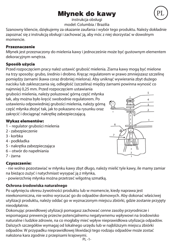 Młynek do kawy Columbia Brazilia. Instrukcja_PL