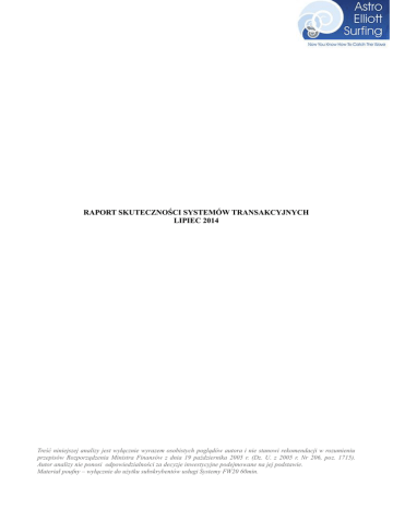 RAPORT SKUTECZNOŚCI SYSTEMÓW TRANSAKCYJNYCH LIPIEC 2014 Treść niniejszej analizy jest wyłącznie wyrazem osobistych poglądów autora i nie stanowi rekomendacji w rozumieniu przepisów Rozporządzenia Ministra Finansów z dnia 19 października 2005 r. (Dz. U. z 2005 r. Nr 206, poz. 1715). Autor analizy nie ponosi odpowiedzialności za decyzje inwestycyjne podejmowane na jej podstawie. Materiał poufny – wyłącznie do użytku subskrybentów usługi Systemy FW20 60min. SPIS TREŚCI 1. 2. 3. 4. 5. 6. 7. Dane analityczne Omówienie miesiąca Skuteczność na tle poprzednich miesięcy Analiza transakcji Sugerowana technika gry Wycena abonamentu na kolejny okres Pozostałe uwagi 1. Dane analityczne Do raportu dołączony jest plik Excel, w którym zestawione są wszystkie transakcje systemów od początku 2009 roku. Plik ten można wykorzystywać do własnych analiz i obliczeń. Struktura pliku: Kolumna 1 – Data transakcji Kolumna 2 – Godzina transakcji Kolumna 3 – Aktualna pozycja Kolumna 4 – Cena sygnału Kolumna 5 – Ilość kontraktów w transakcji Kolumna 6 – Zysk/Strata z transakcji Kolumna 7 – Zysk/Strata zakumulowana Kolumna 8 – Zysk/Strata z miesiąca Kolumna 9 – Prowizja - liczona jako 1 punkt od 1 obróconego kontraktu Kolumna 10 – Rzeczywista cena zamknięcia godziny w której zawarta została transakcja Kolumna 11 – Rzeczywiste minimum w następnej godzinie po sygnale Kolumna 12 – Rzeczywiste maksimum w następnej godzinie po sygnale Kolumna 13 – Różnica pomiędzy ceną sygnału a rzeczywistą możliwą do osiągnięcia w następnej godzinie Kolumna 14 - Uwagi Następne analizy będą odwoływały się do danych zawartych w tym pliku. Treść niniejszej analizy jest wyłącznie wyrazem osobistych poglądów autora i nie stanowi rekomendacji w rozumieniu przepisów Rozporządzenia Ministra Finansów z dnia 19 października 2005 r. (Dz. U. z 2005 r. Nr 206, poz. 1715). Autor analizy nie ponosi odpowiedzialności za decyzje inwestycyjne podejmowane na jej podstawie. Materiał poufny – wyłącznie do użytku subskrybentów usługi Systemy FW20 60min. 2. Omówienie miesiąca – lipiec 2014 Lipiec był miesiącem spadkowym, w którym można wyróżnić trzy fazy. Pierwsze 10 dni to kontynuacja czerwcowego spadku. Od 10 lipca rozpoczęła się korekta wzrostowa, która trwała przez 2 tygodnie. Ostatnie dni miesiąca to dynamiczny spadek notowań, z osiągnięciem nowych minimów. Ilość luk w obu kierunkach czy wyższych/niższych otwarć była umiarkowana (6), ale w kilku przypadkach systemy zostały stopowane na tych elementach, ponosząc straty. Miało to miejsce szczególnie podczas ruchu bocznego, który stanowił dużą część korekty wzrostowej z połowy miesiąca. Kurs przez cały miesiąc utrzymywał się poniżej średniej EMA240, a próby jej przebicia widoczne w trzecim tygodniu były każdorazowo kontrowane przez podaż. Maksima miesiąca osiągnięto 23.07 na poziomie 2380 pkt. Minima rynek ustanowił 10.07, na poziomie 2282 pkt. Miesiąc rozpoczął się na poziomie 2373 pkt., a zakończył na poziomie 2285 pkt. Miesięczny spadek wyniósł więc 88 punktów. Rozpiętość wahań 98 pkt. Treść niniejszej analizy jest wyłącznie wyrazem osobistych poglądów autora i nie stanowi rekomendacji w rozumieniu przepisów Rozporządzenia Ministra Finansów z dnia 19 października 2005 r. (Dz. U. z 2005 r. Nr 206, poz. 1715). Autor analizy nie ponosi odpowiedzialności za decyzje inwestycyjne podejmowane na jej podstawie. Materiał poufny – wyłącznie do użytku subskrybentów usługi Systemy FW20 60min. Zmienność mierzona wskaźnikiem ATR21 utrzymywała się na stabilnym, niskim poziomie, nie przekraczając 9 pkt. Ostatni tydzień spadkowy to dynamiczny wzrost zmienności z poziomu ok. 6 pkt. do ok. 10 pkt. Taki poziom zmienności jest korzystny dla systemów zbudowanych na świecach HeikinAshi , gdyż zdecydowanie zmniejsza ryzyko poślizgu ceny sygnalnej do dostępnej realnie na rynku. Większy problem będzie w sierpniu, jeżeli zmienność godzinowa utrzyma się powyżej 10 pkt. Dużo większym problemem był stosunkowo długi okres ruchu bocznego, który rozpoczął się 16.07, a zakończył wyjściem dołem w dniu 29.07. Było to pełne 10 dni sesyjnych, a więc niemal połowa w miesiącu. W okresie tym systemy „dreptały w miejscu”, karmiąc biura maklerskie prowizjami z wielu odwróceń pozycji. Niestety na ruchu bocznym nikt jeszcze nie zarobił, oprócz makreli. Treść niniejszej analizy jest wyłącznie wyrazem osobistych poglądów autora i nie stanowi rekomendacji w rozumieniu przepisów Rozporządzenia Ministra Finansów z dnia 19 października 2005 r. (Dz. U. z 2005 r. Nr 206, poz. 1715). Autor analizy nie ponosi odpowiedzialności za decyzje inwestycyjne podejmowane na jej podstawie. Materiał poufny – wyłącznie do użytku subskrybentów usługi Systemy FW20 60min. W lipcu zdarzyło się jedno, krótkotrwałe wyłączenie systemów z powodu awarii programu do podawania danych. Nie miało ono jednak wpływu na grę systemową, gdyż zostało błyskawicznie naprawione. Drugim problemem było zakwalifikowanie przez niektórych dostawców kont mailowych sygnałów systemowych jako spam. Problem został rozwiązany. Wyjątkiem jest domena hotmail.com, która nadal blokuje e-maile z sygnałami. Tu muszę prosić użytkowników o nieoznaczanie ww. sygnałów mailowych jako spam lub, jeżeli tam wpadają z automatu, o kwalifikowanie ich jako nie-spam. Problem wyżej opisany był najprawdopodobniej spowodowany tym, że u kogoś na skrzynce sygnały te lądowały w skrzynce ze spamem, wychwycił to automat i zablokował całą domenę, z której przychodzą sygnały. Odkręcanie całej sytuacji jest bardzo uciążliwe i długotrwałe bowiem kontakt z dostawcami kont e-mail jest utrudniony. Po prostu nie odpowiadają na monity. Od strony skuteczności był to przeciętny miesiąc. Powód jest prosty. Ponad połowa mie