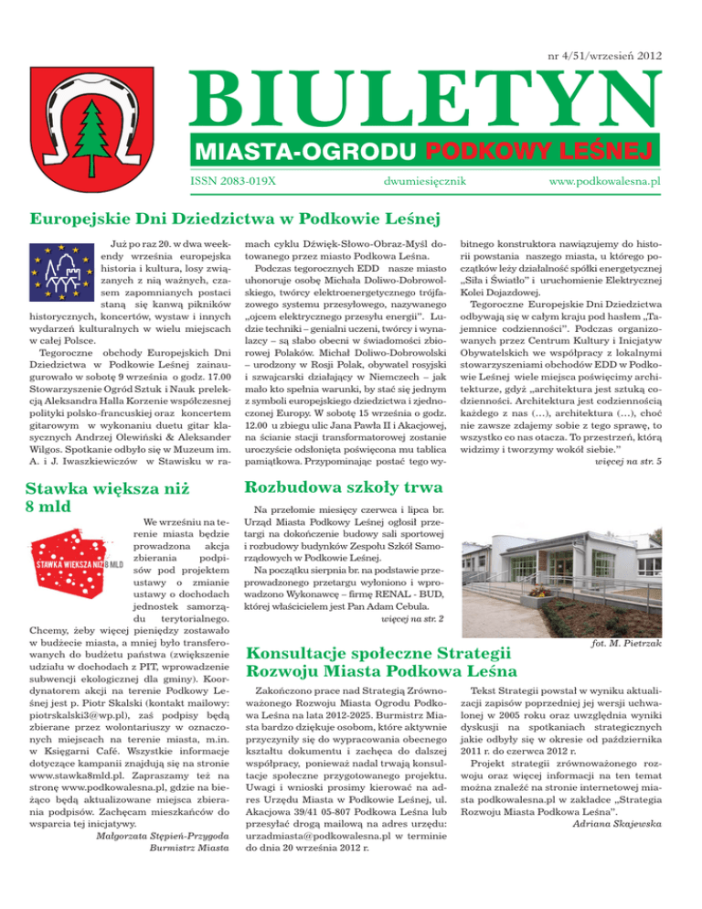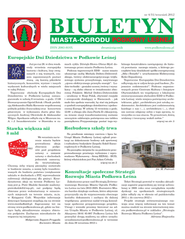 nr 4/51/wrzesień 2012 Europejskie Dni Dziedzictwa w Podkowie Leśnej Już po raz 20. w dwa weekendy września europejska historia i kultura, losy związanych z nią ważnych, czasem zapomnianych postaci staną się kanwą pikników historycznych, koncertów, wystaw i innych wydarzeń kulturalnych w wielu miejscach w całej Polsce. Tegoroczne obchody Europejskich Dni Dziedzictwa w Podkowie Leśnej zainaugurowało w sobotę 9 września o godz. 17.00 Stowarzyszenie Ogród Sztuk i Nauk prelekcją Aleksandra Halla Korzenie współczesnej polityki polsko-francuskiej oraz koncertem gitarowym w wykonaniu duetu gitar klasycznych Andrzej Olewiński & Aleksander Wilgos. Spotkanie odbyło się w Muzeum im. A. i J. Iwaszkiewiczów w Stawisku w ra- Stawka większa niż 8 mld We wrześniu na terenie miasta będzie prowadzona akcja zbierania podpisów pod projektem ustawy o zmianie ustawy o dochodach jednostek samorządu terytorialnego. Chcemy, żeby więcej pieniędzy zostawało w budżecie miasta, a mniej było transferowanych do budżetu państwa (zwiększenie udziału w dochodach z PIT, wprowadzenie subwencji ekologicznej dla gminy). Koordynatorem akcji na terenie Podkowy Leśnej jest p. Piotr Skalski (kontakt mailowy: [email protected]), zaś podpisy będą zbierane przez wolontariuszy w oznaczonych miejscach na terenie miasta, m.in. w Księgarni Café. Wszystkie informacje dotyczące kampanii znajdują się na stronie www.stawka8mld.pl. Zapraszamy też na stronę www.podkowalesna.pl, gdzie na bieżąco będą aktualizowane miejsca zbierania podpisów. Zachęcam mieszkańców do wsparcia tej inicjatywy. Małgorzata Stępień-Przygoda Burmistrz Miasta mach cyklu Dźwięk-Słowo-Obraz-Myśl dotowanego przez miasto Podkowa Leśna. Podczas tegorocznych EDD nasze miasto uhonoruje osobę Michała Doliwo-Dobrowolskiego, twórcy elektroenergetycznego trójfazowego systemu przesyłowego, nazywanego „ojcem elektrycznego przesyłu energii”. Ludzie techniki – genialni uczeni, twórcy i wynalazcy – są słabo obecni w świadomości zbiorowej Polaków. Michał Doliwo-Dobrowolski – urodzony w Rosji Polak, obywatel rosyjski i szwajcarski działający w Niemczech – jak mało kto spełnia warunki, by stać się jednym z symboli europejskiego dziedzictwa i zjednoczonej Europy. W sobotę 15 września o godz. 12.00 u zbiegu ulic Jana Pawła II i Akacjowej, na ścianie stacji transformatorowej zostanie uroczyście odsłonięta poświęcona mu tablica pamiątkowa. Przypominając postać tego wy- bitnego konstruktora nawiązujemy do historii powstania naszego miasta, u którego początków leży działalność spółki energetycznej „Siła i Światło” i uruchomienie Elektrycznej Kolei Dojazdowej. Tegoroczne Europejskie Dni Dziedzictwa odbywają się w całym kraju pod hasłem „Tajemnice codzienności”. Podczas organizowanych przez Centrum Kultury i Inicjatyw Obywatelskich we współpracy z lokalnymi stowarzyszeniami obchodów EDD w Podkowie Leśnej wiele miejsca poświęcimy architekturze, gdyż „architektura jest sztuką codzienności. Architektura jest codziennością każdego z nas (…), architektura (…), choć nie zawsze zdajemy sobie z tego sprawę, to wszystko co nas otacza. To przestrzeń, którą widzimy i tworzymy wokół siebie.” więcej na str. 5 Rozbudowa szkoły trwa Na przełomie miesięcy czerwca i lipca br. Urząd Miasta Podkowy Leśnej ogłosił przetargi na dokończenie budowy sali sportowej i rozbudowy budynków Zespołu Szkół Samorządowych w Podkowie Leśnej. Na początku sierpnia br. na podstawie przeprowadzonego przetargu wyłoniono i wprowadzono Wykonawcę – firmę RENAL - BUD, której właścicielem jest Pan Adam Cebula. więcej na str. 2 Konsultacje społeczne Strategii Rozwoju Miasta Podkowa Leśna Zakończono prace nad Strategią Zrównoważonego Rozwoju Miasta Ogrodu Podkowa Leśna na lata 2012-2025. Burmistrz Miasta bardzo dziękuje osobom, które aktywnie przyczyniły się do wypracowania obecnego kształtu dokumentu i zachęca do dalszej współpracy, ponieważ nadal trwają konsultacje społeczne przygotowanego projektu. Uwagi i wnioski prosimy kierować na adres Urzędu Miasta w Podkowie Leśnej, ul. Akacjowa 39/41 05-807 Podkowa Leśna lub przesyłać drogą mailową na adres urzędu: [email protected] w terminie do dnia 20 września 2012 r. www.podkowalesna.pl fot. M. Pietrzak Tekst Strategii powstał w wyniku aktualizacji zapisów poprzedniej jej wersji uchwalonej w 2005 roku oraz uwzględnia wyniki dyskusji na spotkaniach strategicznych jakie odbyły się w okresie od października 2011 r. do czerwca 2012 r. Projekt strategii zrównoważonego rozwoju oraz więcej informacji na ten temat można znaleźć na stronie internetowej miasta podkowalesna.pl w zakładce „Strategia Rozwoju Miasta Podkowa Leśna”. Adriana Skajewska 1 Rozbudowa szkoły trwa cd. ze str. 1 Zakres robót, który Wykonawca ma do wykonania w części dydaktycznej obejmuje: montaż opraw oświetleniowych i osprzętu, instalacji odgromowej, dokończenie prac sanitarnych – montaż umywalek, kabin sanitarnych i prysznicy, pisuarów oraz misek wc. O wiele więcej pracy pozostało do wykonania w budynku sali sportowej, między innymi: wykonanie opaski wokół Sali sportowej, dostawa i montaż okien, wykonanie tynków zewnętrznych oraz dokończenie tynków wewnątrz obiektu wraz z robotami malarskimi. Tak samo jak w części dydaktycznej należy wykonać montaż opraw oświetleniowych i osprzętu, jak również dokończenie robót sanitarnych związanych z wentylacją i ogrzewaniem. Pozostaje również wykona- nie podłogi sportowej oraz całego wyposażenia sportowego w tym trybun. Osobnym przetargiem wyłoniono Wykonawcę tj. firmę GOLD – BUD Sp. z o.o., której Prezesem jest Pani Bożena Goliasz na dostawę i montaż w części dydaktycznej dźwigu osobowego. W ramach realizowanych robót zostanie również wymienione ogrodzenie wokół całego terenu i wybudowany plac przed wej