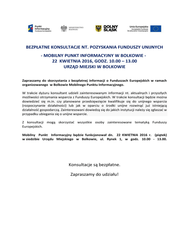 BEZPŁATNE KONSULTACJE NT. POZYSKANIA FUNDUSZY UNIJNYCH - MOBILNY PUNKT INFORMACYJNY W BOLKOWIE 22 KWIETNIA 2016, GODZ. 10.00 – 13.00 URZĄD MIEJSKI W BOLKOWIE Zapraszamy do skorzystania z bezpłatnej informacji o Funduszach Europejskich w ramach organizowanego w Bolkowie Mobilnego Punktu Informacyjnego. W trakcie dyżuru konsultant udzieli zainteresowanym informacji nt. aktualnych i przyszłych możliwości otrzymania wsparcia z Funduszy Europejskich. W trakcie konsultacji będzie można dowiedzieć się m.in. czy planowane przedsięwzięcie kwalifikuje się do unijnego wsparcia (rozpoczynanie działalności) lub jak w oparciu o środki unijne rozwinąć już istniejącą działalność gospodarczą. Zainteresowani dowiedzą się do jakich instytucji należy się zgłaszać w przypadku ubiegania się o unijne wsparcie. Z konsultacji mogą skorzystać wszystkie osoby zainteresowane tematyką Funduszy Europejskich. Mobilny Punkt Informacyjny będzie funkcjonował dn. 22 KWIETNIA 2016 r. (piątek) w siedzibie Urzędu Miejskiego w Bolkowie, ul. Rynek 1, w godz. 10.00 - 13.00. Konsultacje są bezpłatne. Zapraszamy do udziału!