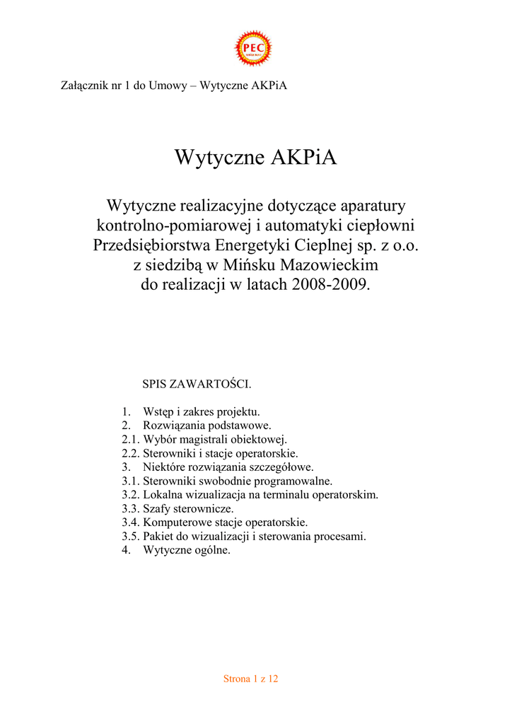Załącznik nr 1 do Umowy – Wytyczne AKPiA Wytyczne AKPiA Wytyczne realizacyjne dotyczące aparatury kontrolno-pomiarowej i automatyki ciepłowni Przedsiębiorstwa Energetyki Cieplnej sp. z o.o. z siedzibą w Mińsku Mazowieckim do realizacji w latach 2008-2009. SPIS ZAWARTOŚCI. 1. Wstęp i zakres projektu. 2. Rozwiązania podstawowe. 2.1. Wybór magistrali obiektowej. 2.2. Sterowniki i stacje operatorskie. 3. Niektóre rozwiązania szczegółowe. 3.1. Sterowniki swobodnie programowalne. 3.2. Lokalna wizualizacja na terminalu operatorskim. 3.3. Szafy sterownicze. 3.4. Komputerowe stacje operatorskie. 3.5. Pakiet do wizualizacji i sterowania procesami. 4. Wytyczne ogólne. Strona 1 z 12 OPIS TECHNICZNY 1. WSTĘP I ZAKRES PROJEKTU Niniejsze opracowanie zawiera wytyczne automatyki mikroprocesorowej w zakresie określającym podstawowe parametry systemu nadzoru, kontroli, zabezpieczeń i wizualizacji układów technologicznych ciepłowni Przedsiębiorstwa Energetyki Cieplnej sp. z o.o. w Mińsku Mazowieckim. Zakres prac obejmuje poza projektem spinającym poszczególne podukłady technologiczne i podłączenie do istniejących urządzeń połączenie w jeden system automatyki, kontroli, pomiarów i zabezpieczeń, a takŜe kompletację i dostawy elementów i urządzeń mikroprocesorowych oraz oprogramowania niezbędnych do stworzenia kompleksowego systemu automatyki i zbudowania nastawni obiektowej. 1.1. Zakres prac obejmuje: 1.1.1. Kompletację i dostawę sterowników swobodnie programowalnych według konfiguracji przedstawionej w pkt. 2.2 oraz 3.1 niniejszego opracowania (przynajmniej jeden sterownik na kaŜdy węzeł technologiczny). 1.1.2. Kompletację i dostawę terminali operatorskich opisanych w dalszej części niniejszego opracowania - pkt. 3.2 (przynajmniej jeden terminal do lokalnego podglądu i sterowania na kaŜdy węzeł technologiczny). 1.1.3. Kompletację i dostawę dodatkowego wyposaŜenia istniejących szaf zasilająco sterowniczych razem z elementami towarzyszącymi takimi jak listwy, styczniki, termiki itp. montowanymi w szafach do współpracy ze sterownikiem. 1.1.4. Kompletację i dostawę stacji komputerowych z zainstalowanym i skonfigurowanym systemem operacyjnym i siecią komputerową Ethernet, 1.1.5. Dostawę pakietów (m.in. hardware, software i osprzęt) do wizualizacji i sterowania procesów technologicznych dla Windows i Internetu, 1.1.6. Oprogramowanie narzędziowe i oprogramowanie uŜytkowe dla sterowników swobodnie programowalnych, 1.1.7. Wykonanie oprogramowania uŜytkowego i narzędziowego na terminalach operatorskich, 1.1.8. Zebranie informacji ze sterowników swobodnie programowalnych i terminali. 1.1.9. Zebranie informacji za sterowników w ciepłowni PLM. 1.1.10. Wykonanie aplikacji wizualizacyjnej, archiwizującej i narzędziowej na stacjach komputerowych. 1.1.11. Podłączenie istniejących sterowników obiektowych do systemu wizualizacji lub wymiana w/w sterowników na nowe i wykonanie aplikacji na tych sterownikach. W celu pozyskania sygnałów do wizualizacji dopuszcza się takŜe zainstalowanie nowych sterowników dodatkowych do istniejących urządzeń. Obecnie zainstalowane sterowniki wraz z podstawowymi sygnałami opisano w Załączniku nr 2 do Umowy – Wykazie sygnałów KLM. WyróŜniono tam m.in. następujące istniejące szafy zasilająco sterownicze: - szafa kotła nr 1 SK-1, - szafa kotła nr 2 SK-2, - szafa kotła nr 3 SK-3, - szafy pompowe: SR-1 i SR-2, - szafa pomiarów ogólnych. Strona 2 z 12 UWAGI: Uwaga Nr 1: W Załączniku nr 2 do Umowy - Wykazie sygnałów KLM specyfikującym część podstawowych sygnałów i poszczególnych szaf kotłowych oraz pompowych wyróŜniono kolorem sygnały związane z istniejącymi sterownikami. Wymieniono tam teŜ inne sygnały, których dalsze wykorzystanie przewidziane jest w jednym z dwóch przypadków: - jeśli wykonawca nie będzie pozyskiwać do stacji SCADA informacji z istniejących sterowników serii Modicon Micro, to dodatkowe sygnały łącznie z dotychczas obsługiwanymi przez sterowniki Modicon Micro będą podłączone do nowych oferowanych sterowników; dotychczasowe funkcje sterowania muszą być zapewnione; - jeśli wykonawca będzie odczytywać dane ze sterowników Modicon Micro, to w zaleŜności od liczby wolnych wejść/wyjść zaaplikuje je do istniejącego sterownika. Uwaga Nr 2 : NaleŜy zapewnić komunikację i wymianę danych pomiędzy stacją SCADA a istniejącymi urządzeniami takimi, jak: liczniki ciepła – 1szt., energii elektrycznej - 1szt., mierniki wielofunkcyjne itd. – wykonawca przed złoŜeniem oferty osobiście rozpozna moŜliwości komunikacji ze wspomnianymi urządzeniami. W odniesieniu do istniejących liczników bilansowych ciepła i energii elektrycznej brak moŜliwości komunikacyjnych obliguje wykonawcę do uzupełnienia lub wymiany wyposaŜenia na własny koszt w celu realizacji zdalnego odczytu danych do stacji SCADA. 1.1.12. Sczytanie informacji o pracy kotłowni połoŜonej przy ul. 1-go PLM „Warszawa” nr 1 ze sterownika obiektowego i przesłanie tej informacji do systemu centralnego, poprzez wskazane przez Zamawiającego łącze. Sterownikiem podstawowym w PLM (osobna od KLM i oddalona kotłownia gazowa), z którego naleŜy odczytywać dane (około 250 sygnałów analogowych i cyfrowych) jest sterownik PCD2 z modułem rozszerzającym oraz terminalem operatorskim PCD7.D850. Urządzenia te zapewniają obecnie sterowanie pracą prawie całej kotłowni gazowej. W odniesieniu do urządzeń PLM z grupy liczników (energia elektryczna – 1 szt., ciepło – 2 szt.) wykonawca zobowiązany jest do wypełnienia wymagań komunikacyjnych zawartych w Uwadze nr 2 w pkt. 1.1.11. Podstawowe dane istniejących liczników energii elektrycznej i ciepła kotłowni gazowej PLM zamieszczono w Załączniku nr 2 do Umowy - Wykazie sygnałów KLM. 1.2. Zakres prac nie obejmuje: a/ instalacji elektrycznej (np. doprowadzenie zasilania do szaf zasilająco - sterowni