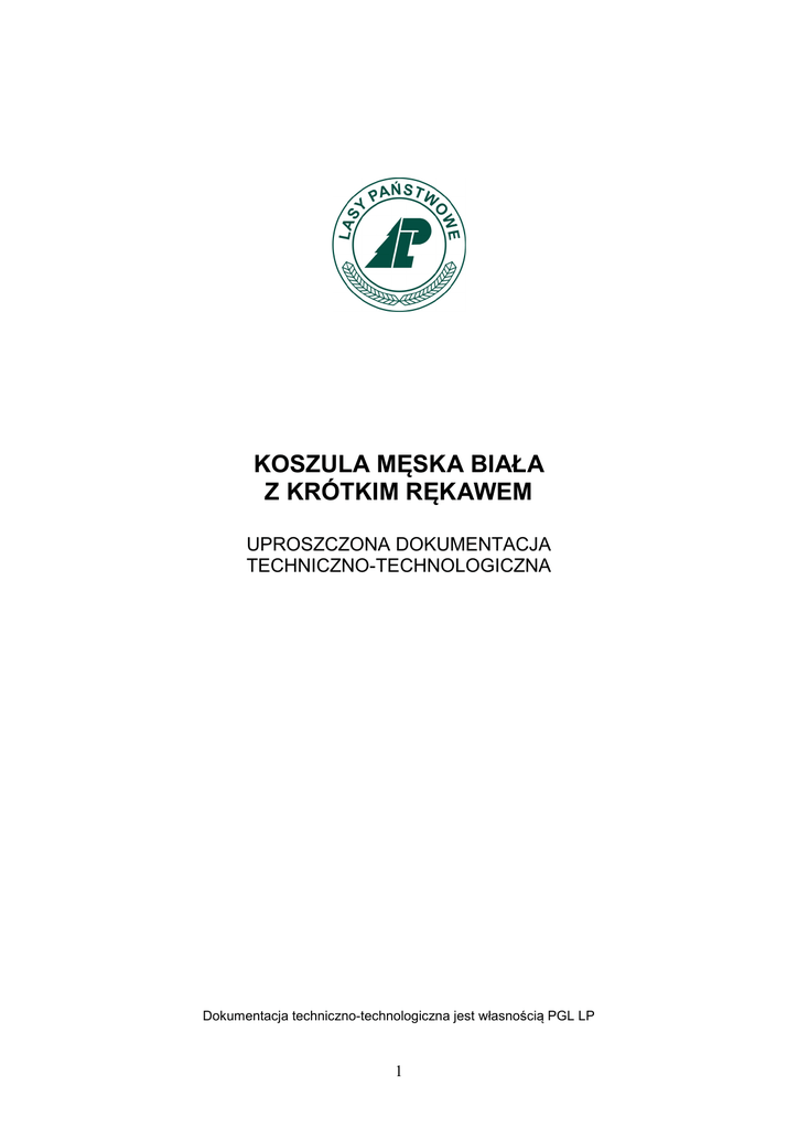 KOSZULA MĘSKA BIAŁA Z KRÓTKIM RĘKAWEM UPROSZCZONA DOKUMENTACJA TECHNICZNO-TECHNOLOGICZNA Dokumentacja techniczno-technologiczna jest własnością PGL LP 1 SPIS TREŚCI 1. Wstęp 2. Przedmiot dokumentacji 2.1. Opis ogólny 2.2 . Normy i dokumenty związane 3. Rysunek modelowy 4. Wymagania techniczne 4.1. Wykazy materiałów zasadniczych i dodatków 4.2. Dane dotyczące tkaniny 4.3. Ściegi maszynowe 5. Opis obróbki 6. Zestawienie elementów składowych 7. Rysunki techniczne – wymiarowe 8. Tabela wymiarów stałych dla wszystkich rozmiarów 9. Tabela wymiarów 10. 11. Karta techniczna wyrobu Warunki obioru - odbiór jakościowy - cechowanie etykiety wszywki, konserwacja - pakowanie , przechowywanie, transport 12. Oznakowanie - wzór etykiety 13. Arkusz ewidencji wprowadzonych zmian 14. Próbki tkanin 15. Załączniki – certyfikaty, wyniki badań laboratoryjnych zastosowanych materiałów (potwierdzenie spełnienia wymagań techniczno-użytkowych) 2 1. WSTĘP Zgodnie z Zarządzeniem Nr 16 Dyrektora Generalnego Lasów Państwowych z dnia 14.03.2005 r. dopuszcza się stosowanie tkaniny do wykonania koszuli męskiej białej do munduru wyjściowego z krótkim rękawem o składzie surowcowym z większym udziałem bawełny. 2. PRZDMIOT DOKUMENTACJI. 2.1. OPIS OGÓLNY Koszula męska z przodu zapinana na guziki. Kołnierz na odcinanej stójce. Tył z fałdami po bokach z doszywanym karczkiem tyłu. Przód lewy - imitacja plisy szerokości 3,5 cm na aparat. Przód prawy - podwinięty 1+3 cm do spodu. Na lewym przodzie naszyta kieszeń o ściętych rogach. Rękawy krótkie, w dole imitacja mankiecika szerokości 3 cm na aparat. Dół koszuli podwinięty do spodu na aparacie 0,7 cm. 3 2.2. NORMY I DOKUMENTY ZWIĄZANE PN-P-84518:1996 Wyroby odzieżowe. Terminologia. PN-91/P-01831 Elementy wyrobów odzieżowych. PN-83/P-84501 Wyroby konfekcyjne. Szwy. PN-83/P-84502 Wyroby konfekcyjne. Ściegi. PN-83/P-84506 Wyroby konfekcyjne. Badania odbiorcze. PN-83/P-84507 Wyroby konfekcyjne. Stopnie jakości. PN-EN ISO 3758:2006 Znaki informacyjne o sposobie konserwacji w postaci symboli graficznych PN-P-84509:1997 Wyroby odzieżowe. Pakowanie, przechowywanie, transport. PN-91/P-84504 Wyroby konfekcyjne. Wielkości. lub PN-EN 13402:2005 Wyroby odzieżowe. Wielkości. PN-90/P-84531 Wyroby konfekcyjne. Oznaczenie. PN-90/P-84530 Wyroby konfekcyjne. Składanie. PN-80/P-81101 Nici odzieżowe. Postanowienia ogólne. 4 3. RUSUNEK MODELOWY. 5 4. WYMAGANIA TECHNICZNE 4.1. Lp. 1. Wykaz materiałów zasadniczych i dodatków: Nazwa materiału Symbol Producent Tkanina zasadnicza – biała (55% bawełna, 45% poliester) 2. Wkładka z naniesieniem: Kołnierz (2 warstwy) Stójka (1 warstwa) Plisa (1 warstwa) 3. Nici - dobrane do koloru tkaniny 4. Guziki w kolorze tkaniny zasadniczej – dwudziurkowe Wzrost 170 – 12 szt. Wzrost 175-195 – 13 szt. 4.2. DANE DOTYCZĄCE TKANINY Tkanina biała Skala Pantona: 11-0601 TP Masa powierzchniowa: g/m² 133 Liczba nitek na dm: o/w 552/280 Masa liniowa: o/w tex 12,8/130 Skład surowca: 55% bawełna, 45% poliester 4.3. ŚCIEGI MASZYNOWE Szwy wg PN-83/P-84501 Ściegi wg PN-83/P-84502 - Szwy łączące wykonane na maszynach „overlock” i stębnówka winny wynosić 0,7 cm. - Ilość ściegów maszynowych winna wynosić od 4-5 na 1 cm - Przy obrabianiu dziurek po 12-14 ściegów na 1 cm .5. OPIS OBRÓBKI 6 4.4. Tył W tyle ułożone fałdki wg znaków. Karczki złożyć prawymi stronami tkaniny do środka. Między karczek spodni i wierzchni włożyć tył koszuli i przeszyć szwem 0,7 cm od krawędzi. Karczki przewinąć do góry. 4.5. Przody Przód prawy podwinięty 1-3 cm i przestębnowany. W lewym przodzie wykonać imitację plisy szer. 3,5 cm na aparat. Na lewym przodzie nałożyć kieszeń wg znaków i nastębnować. 5.3 Kieszeń Górną krawędź kieszeni podwinąć do spodu 1-3,5 cm w znaków. Kieszeń zaprasować wg szablonu. Nałożyć na przód, nastębnować 0,1 cm od krawędzi. U góry kieszeń zamocować w prostokąt w celu zabezpieczenia przed pruciem. 5.4 Ramiona Ramiona przodów połączyć z ramionami karczków na maszynie overlock. 5.5 Kołnierz Na spodnią stronę główki kołnierza wierzchniego nałożyć spunktowany dwuwarstwowy wkład z tkaniny powlekanej i zgrzać. Wierzch kołnierza z wkładem nałożyć na spód kołnierza prawymi stronami do wewnątrz i odszyć. Kołnierzy wywrócić, rogi wykonać tak, aby były jednakowe, obciągnąć do spodu. Kołnierz przestębnować 0,3 cm od krawędzi. Na spodnią stronę stójki wierzchniej nałożyć wkład z tkaniny powlekanej w odległości 1,1 cm od brzegu podkładając jednocześnie pośrodku wszywkę rozmiarową. Stójkę przewinąć do wierzchu i przestębnować 0,1 cm od krawędzi. Wystającą krawędź stójki spodniej wszyć do wykroju szyi. Krawędzią stójki wierzchniej nakryć stębnówkę wszycia i przestębnowania brzegiem. 5.6. Rękawy 7 W dole rękawa wykonać imitację mankiecika szer. 3,0 cm na aparat. Rękawy wszyć do wykroju pach na maszynie overlock 5-nitkowym. Boki koszuli i rękawów połączyć maszyną overlock 5-nitkowym, wszywając jednocześnie w prawy bok znaki ostrzegawcze ze składami surowcowymi odległości 6,5 cm od pach, a w odległości 12 cm od podwiniętego dołu łatkę brakarską. Zamocować u dołu szew zszycia rękawów. 5.7 Dziurki Dziurki w lewym przodzie wykonać wg tabeli wymiarów stałych. 5.8 Guziki Guziki w prawym przodzie przyszyć wg dziurek wykonanych w lewym przodzie. Zapasowy guzik doszyć od spodu w dole przodu prawego. 5.9 Dół koszuli. Dół koszuli podwinąć od spodu na aparacie 0,7 cm i przestębnować. 5.10 Wykończenie Etykietę zakładową przyszyć pod guzik (widoczny w tyle koszuli na wkładzie). Koszulę oczyścić z końców nici, uprasować i złożyć. 5.11 Składanie i prasowanie Koszulę złożyć na wkładzie tekturowym włożyć do torby foliowej a następnie pakować po 10 szt. w jednej wielkości do kartonu. Karton skleić taśmą, na kr
