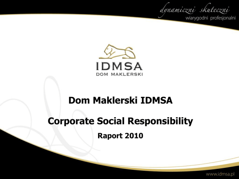 Dom Maklerski IDMSA Corporate Social Responsibility Raport 2010 Odpowiedzialność społeczna DM IDMSA Współodpowiedzialność za słabszych Działalność proedukacyjna Wysoki standard pracy Dbałość o środowisko Uczciwość wobec partnerów Wsparcie dla rozwoju kultury Pamięć historyczna 2 Współodpowiedzialność za słabszych Współodpowiedzialność za słabszych Działalność proedukacyjna Wysoki standard pracy Dbałość o środowisko Uczciwość wobec partnerów Wsparcie dla rozwoju kultury Pamięć historyczna 3 Współodpowiedzialność za słabszych Nieprzerwanie, od 2005 roku DM IDMSA wspiera Fundację im. Brata Alberta przeznaczając na jej cele statutowe 0,50 zł od każdego zlecenia giełdowego składanego przez naszych Klientów – jak dotychczas przekazaliśmy na rzecz Fundacji już blisko 691 tys. zł; W 2010 roku na cele charytatywne przeznaczyliśmy ponad 366 tysięcy złotych. W tym 89,5 tys. zł przekazaliśmy na rzecz Fundacji im. Brata Alberta oraz 14 tys. złotych podopiecznym Fundacji „Zdążyć z Pomocą”; W kolejnych latach zamierzamy nadal pomagać organizacjom charytatywnym. 4 Uczciwość wobec partnerów Współodpowiedzialność za słabszych Działalność proedukacyjna Wysoki standard pracy Dbałość o środowisko Uczciwość wobec partnerów Wsparcie dla rozwoju kultury Pamięć historyczna 5 Uczciwość wobec partnerów Wierzymy, że długotrwałe relacje biznesowe przy obustronnych korzyściach mogą odbywać się jedynie w oparciu o uczciwość i zaufanie partnerów biznesowych; Jako członek Izby Domów Maklerskich zobligowaliśmy się do przestrzegania norm wyznaczonych przez Kodeks Dobrej Praktyki Domów Maklerskich; Opracowaliśmy własny Kodeks Etyki DM IDMSA stanowiący nasze „biznesowe credo”. 6 Wsparcie dla rozwoju kultury Współodpowiedzialność za słabszych Działalność proedukacyjna Wysoki standard pracy Dbałość o środowisko Uczciwość wobec partnerów Wsparcie dla rozwoju kultury Pamięć historyczna 7 Wsparcie dla rozwoju kultury DM IDMSA obejmuje swoim mecenatem wiele uroczystości kulturalnych oraz artystycznych; W latach 2008-2009 ufundowaliśmy stypendium dla Bogdana Czesaka – studenta ASP w Krakowie; zaś w 2010 r. zamówiliśmy u tego artysty płaskorzeźby do nowego biura DM IDMSA w Warszawie; Sztuka to obszar w którym osoby wykluczone lub niepełnosprawne mogą integrować się ze społeczeństwem realizując swoje talenty. Część świadczonej przez nas pomocy organizacjom charytatywnym przeznaczonych jest właśnie na rozwój zdolności artystycznych ich podopiecznych. DM IDMSA jest zaangażowany w projekt domu pracy twórczej dla podopiecznych Fundacji Anny Dymnej „Mimo Wszystko”. 8 Wsparcie dla rozwoju kultury Wybrane prace podopiecznych Fundacji im. Brata Alberta 9 Pamięć historyczna Współodpowiedzialność za słabszych Działalność proedukacyjna Wysoki standard pracy Dbałość o środowisko Uczciwość wobec partnerów Wsparcie dla rozwoju kultury Pamięć historyczna 10 Pamięć historyczna Udział DM IDMSA w uroczystościach o charakterze patriotycznym traktujemy jako ogromny zaszczyt oraz przywilej; Przy współpracy z Instytutem Pamięci Narodowej, Stowarzyszeniem „Pokolenie” oraz Oficyną Wydawniczą Volumen udało nam się doprowadzić do opublikowania w sierpniu 2010 r., w trzydziestą rocznicę powstania Związku, Encyklopedii Solidarności. 11 Pamięć historyczna DM IDMSA był sponsorem koncertu poświęconego „Żołnierzom Wyklętym” – bojownikom podziemia niepodległościowego i antykomunistycznego. Dochód z koncertu został przekazany w całości na rzecz kombatantów podziemia antykomunistycznego. Patronat nad imprezą objął tragicznie zmarły 10 kwietnia 2010 roku Władysław Stasiak - Szef Kancelarii Prezydenta. 12 Pamięć historyczna W ramach celów na 2011 rok jako jeden z pomysłodawców podjęliśmy się współorganizacji Ogólnopolskiego Konkursu na Medal – Małą Formę Rzeźbiarską „Wdowom Katyńskim”. Wyłoniony w konkursie medal zostanie we wrześniu 2011 r. wręczony Wdowom Katyńskim – żonom polskich oficerów zamordowanych w 1940 r. w Katyniu, Charkowie i Miednoje. Dbałość o środowisko Współodpowiedzialność za słabszych Działalność proedukacyjna Wysoki standard pracy Dbałość o środowisko Uczciwość wobec partnerów Wsparcie dla rozwoju kultury Pamięć historyczna 14 Dbałość o środowisko W DM IDMSA uważamy, że każde działanie mające na celu ochronę przyrody niezależnie od skali jest warte podjęcia; Od wszystkich naszych kontrahentów oczekujemy najwyższej dbałości o środowisko. Każdy obecny i przyszły kontrahent DM IDMSA zobowiązany jest do prowadzenia Polityki Środowiskowej. W szczególności musi wykazać się wdrożeniem Systemu Środowiskowego, uwzględniającego charakter prowadzonej przez siebie działalności, jej skalę, rodzaj i zakres dokonywanych emisji zanieczyszczeń. 15 Wysoki standard pracy Współodpowiedzialność za słabszych Działalność proedukacyjna Wysoki standard pracy Dbałość o środowisko Uczciwość wobec partnerów Wsparcie dla rozwoju kultury Pamięć historyczna 16 Wysoki standard pracy Ogromną wagę przykładamy do tego, by w naszych szeregach znajdowali się jedynie fachowcy o nieposzlakowanej opinii, ambitni oraz zaangażowani w swoją pracę. Od naszych pracowników wymagamy poszanowania wartości etycznych, w tym m.in. przestrzeganie Kodeksu Etyki DM IDMSA; W 2010 roku podjęliśmy działania w kierunku poprawy warunków pracy młodych mam w zakresie strategii „Dom Maklerski IDMSA przyjazny rodzinie”. Celem tych rozwiązań jest umożliwienie pracującym w DM IDMSA mamom połączenia pracy zawodowej z rolą opiekuna. 17 Działalność proedukacyjna Współodpowiedzialność za słabszych Działalność proedukacyjna Wysoki standard pracy Dbałość o środowisko Uczciwość wobec partnerów Wsparcie dla rozwoju kultury Pamięć historyczna 18 Dzi
