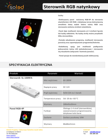 Sterownik RGB natynkowy Cechy: -Ekskluzywny panel naścienny RGB-4P do sterownia oświetleniem LED RGB z dotykową tarczą kolorystyczną umożliwia łatwy wybór koloru taśmy RGB oraz sterowanie wieloma strefami oświetlenia. -Panel daje możliwość sterowania aż 4 strefami łącznie lub każdą oddzielnie. Na każdą strefę można przydzielić kilka sterowników. -Posiada wbudowane programy, możliwość sterowania jasnością oraz zapamiętywanie programów/kolorów. -Dodatkową opcją jest możliwość podłączenia jednocześnie taśmy LED jednokolorowej i sterowanie nią niezależnie (włączanie i kontrola jasności). - Panel pasuje do standardowej puszki elektrycznej. SPECYFIKACJA ELEKTRYCZNA Produkt Sterownik SL-1009FA Produkt Parametr Parametr Moc wyjściowa Wartość Wartość 60-180W Sterownik SL-1009FA Moc wyjściowa Napięcie pracy 60-180W DC 12V TKOWE wyjściowy DC 12V 4x5A (5A na 1 kanał) NapięciePrąd pracy Temperatura pracy Od -20 do +50 ℃ Prąd wyjściowy 4x5A (5A na 1 kanał) Wymiary Temperatura pracy Panel RGB-4P Funkcje Wymiary Panel RGB-4P Funkcje Zasilanie Wymiary Zasilanie 180x45x20mm Od -20 do +50 ℃ Obsługa 1-4 stref (sterowników), zaawansowane programowanie, 180x45mm dotykowe koło barw Obsługa 1-4 stref (sterowników), Zasilacz puszkowy 10W zaawansowane programowanie, dotykowe koło barw 86x86x41mm Akumulator - Ładowanie USB SOLED Projekty i Dekoracje Świetlne Jacek Solka ul. Kolejowa 12 blok C 15-701 Białystok www.soled.pl www.sklep.soled.pl Wymiary Specyfikacja Elektryczna 86x86x41mm KONTAKT E-mail: [email protected] Tel. 531 185 153 Sterownik RGB natynkowy OPIS TECHNICZNY: FUNKCJE PANELU RGB-4P 1. Włącz/wyłącz panel. 2. Wybór strefy, Sterowanie jasnością 3. Uruchamianie programu 4. Włączanie/pauza programu 5. Mieszanie barw, sterowanie taśmą jednokolorową Synchronizacja panelu ze sterownikiem 1. 2. 3. 4. Włączyć panel za pomocą przycisku ON/OFF Podłączyć zasilanie oraz taśmę LED do sterownika. Nacisnąć przycisk Learning Key na sterowniku, a następnie daną strefę na panelu. Poprawne zaprogramowanie oznajmia mignięcie taśmy LED. Czynności te powtarza się z innymi sterownikami. Wszystkie sterowniki można przypisać do jednej strefy (działanie synchroniczne) lub każdy sterownik do osobnej. Aby skasować zapamiętany program należy nacisnąć czarny przycisk na sterowniku służący do programowania i przytrzymać przez 5sekund. Wybór strefy i koloru światła Do wybrania strefy służą numery na panelu (2): Po wybraniu strefy (1-4) możemy wybrać kolor świecenia przy pomocy dotykowej palety barw . Aby zmienić barwę kilku stref należy nacisnąć wybrane numery stref (1-4) jedna po drugiej po czym wybrać kolory z koła barw. Przyciśnięcie i przytrzymanie przycisku z numerem strefy spowoduje jej wyłączenie. Ponowne przytrzymanie – włączenie strefy. Sterowanie jasnością Do sterowania jasnością świecenia służy ten sam przycisk co do włączania/wyłączania panelu (1). Przytrzymanie przycisku spowoduje ściemnianie. Ponowne przytrzymanie przycisku spowoduje rozjaśnianie. SOLED Projekty i Dekoracje Świetlne Jacek Solka ul. Kolejowa 12 blok C 15-701 Białystok www.soled.pl www.sklep.soled.pl KONTAKT E-mail: [email protected] Tel. 531 185 153 Wybór programu Panel posiada wbudowane programy świecenia. Do wyboru programu służy przycisk (3). Jednokrotne dotknięcie spowoduje uruchomienie programu. Ponowne dotknięcie spowoduje zatrzymanie programu. Kolejne dotknięcie spowoduje uruchomienie następnego programu. Dotknięcie i przytrzymanie tego przycisku w momencie jeśli program jest uruchomiony spowoduje zwiększenie/zmniejszenie prędkości programu zmian. Sterowanie taśmą LED jednokolorową Sterownik umożliwia podłączenie taśmy LED jednokolorowej w miejscu pokazanym na schemacie zestawu na końcu instrukcji. Pojedyncze dotknięcie powoduje włączenie/wyłączenie. Przyciśnięcie i przytrzymanie spowoduje rozjaśnianie/ściemnianie oświetlenia. Mieszanie barw Do mieszania barw służą przyciski (5) R G B na panelu Jednorazowe dotknięcie któregoś z tych przycisków spowoduje wyłączanie/włączenie barwy. Przytrzymanie przycisku spowoduje ściemnianie/rozjaśnianie danej barwy. Włączanie wszystkich trzech barw R G B spowoduje ustawienie koloru białego zimnego na taśmie RGB Podłączenie sterownika oraz panelu PODŁĄCZENIA STEROWNIKA i PANELU SOLED Projekty i Dekoracje Świetlne Jacek Solka ul. Kolejowa 12 blok C 15-701 Białystok www.soled.pl www.sklep.soled.pl KONTAKT E-mail: [email protected] Tel. 531 185 153