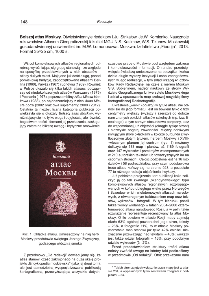 148 Recenzje Bolszoj atłas Moskwy. Otwietstwiennyje riedaktory I.Ju. Strikałow, Je.W. Kornienko. Naucznoje rukowodstwo Atłasom Gieograficzeskij fakultiet MGU N.S. Kasimow, W.S. Tikunow. Moskowskij gosudarstwiennyj uniwiersitiet im. M.W. Łomonosowa. Moskwa: Izdatielstwo „Fieorija”, 2013. Format 35×25 cm, 1000 s. Wśród kompleksowych atlasów regionalnych odrębną, wyróżniającą się grupę stanowią – ze względu na specyfikę przedstawianych w nich obszarów – atlasy dużych miast. Mają one już dość długą, ponad półwiekową tradycję, zapoczątkowaną atlasami Berlina (1960), Paryża (1967) i Londynu (1969). Również w Polsce ukazało się kilka takich atlasów, począwszy od niedokończonych atlasów Warszawy (1975) i Poznania (1978), poprzez ambitny Atlas Miasta Krakowa (1988), po najobszerniejszy z nich Atlas Miasta Łodzi (2002 oraz dwa suplementy: 2009 i 2012). Ostatnio ta niezbyt liczna kategoria publikacji powiększyła się o okazały Bolszoj atłas Moskwy, wyróżniający się nie tylko wagą i objętością, ale również bogactwem treści i formami jej przekazania, zasługujący zatem na bliższą uwagę i krytyczne omówienie. Ryc. 1. Okładka atlasu. Umieszczony na niej herb Moskwy przedstawia świętego Jerzego Zwycięzcę, godzącego włócznią smoka Z przedmowy „Od redakcji” dowiadujemy się, że atlas stanowi część zakrojonego na dużą skalę projektu „Encyklopedia moskiewska” (jako jej drugi tom), ale jest samodzielną wyspecjalizowaną publikacją kartograficzną, przewyższającą wszystkie dotych- czasowe prace o Moskwie pod względem zakresu i kompleksowości informacji. O randze przedsięwzięcia świadczą umieszczone na początku i końcu dzieła długie wykazy instytucji i osób zaangażowanych w jego realizację, w tym skład liczącej 41 członków Rady Redakcyjnej na czele z merem Moskwy S.S. Sobieninem, nadzór naukowy ze strony Wydziału Geograficznego Uniwersytetu Moskiewskiego i udział w opracowaniu map czołowej rosyjskiej firmy kartograficznej Roskartografija. Określenie „wielki” (bolszoj) w tytule atlasu nie odnosi się do jego formatu, jest on bowiem tylko o trzy centymetry większy (wyższy i szerszy) od dobrze nam znanych polskich atlasów szkolnych (np. tzw. licealnego), a tym samym stosunkowo poręczny, lecz do wspomnianej już objętości (okrągłe tysiąc stron!) i niezwykle bogatej zawartości. Między nobliwymi imitującymi skórę okładkami w kolorze burgunda z wytłoczonym złotym tytułem, herbem Moskwy i XVIII-wiecznym planem jej centrum (ryc. 1) możemy doliczyć się 533 map i planów, aż 1189 fotografii oraz 147 wykresów i przekrojów wkomponowanych w 210 autorskich tekstów lub towarzyszących im na osobnych stronach1. Całość podzielona jest na 16 rozdziałów i 58 podrozdziałów, przy czym podstawowa treść atlasu kończy się na stronie 923, a pozostałe 77 to różnego rodzaju objaśnienia i wykazy. Już pobieżne przejrzenie kart publikacji każe zaliczyć ją do tak zwanego „skandynawskiego” typu kompleksowych atlasów regionalnych, rozpropagowanych w końcu ubiegłego wieku przez Norwegów i Szwedów w ich wielotomowych atlasach narodowych, z równorzędnym traktowaniem map oraz tekstów, wykresów i fotografii. W tym kierunku poszli także twórcy wydanego w latach 2004–2008 czterotomowego atlasu narodowego Rosji, a w pełni takie rozwiązanie reprezentuje recenzowany tu atlas Moskwy. O ile bowiem w atlasie Rosji mapy zajmują około 63% ogólnej powierzchni jego stron, teksty – 23%, a fotografie 11%, to w atlasie Moskwy powierzchnia map stanowi już tylko 42% całości, nieznacznie przeważając nad tekstami – 40%; większy jest także udział fotografii – 16%, przy podobnym udziale wykresów (3 i 2%). Przed przedstawieniem struktury treści atlasu należy zwrócić uwagę na istotny fakt podkreślony w przedmowie „Od redakcji”. Otóż przekazane nam 1 Takich stron zajętych wyłącznie przez mapy jest w atlasie 234, a wypełnionych tylko zestawami fotografii z podpisami – 34. Recenzje dane o współczesnej Moskwie odnoszą się do początku 2012 roku (z nielicznymi wyjątkami), natomiast nie są uwzględnione informacje o rozległym niezurbanizowanym obszarze na południowy zachód od miasta, włączonym w jego granice administracyjne z dniem 1 lipca tego roku z perspektywą przyszłej rozbudowy stolicy Rosji właśnie w tym kierunku. Zatem Moskwa o jakiej szczegółowo informuje atlas, to jeszcze miasto o powierzchni 1091 km kwadratowych2, zamieszkała w styczniu 2012 r. przez 11,6 mln. mieszkańców, z przedziwnym kształtem swoich granic, biegnących od 1960 r. przeważnie wzdłuż wielkiej owalnej obwodnicy (tzw. kolcowoj awtodorogi), ale z dziewięcioma nieregularnymi „wypustkami” poza tę drogę i sześcioma eksklawami w ościennych rejonach (powiatach) obwodu moskiewskiego. Interesująco przedstawia się struktura tematyczna atlasu, wyrażona we wspomnianych już wyżej szesnastu rozdziałach. O ich treści oraz udziale w całości publikacji mogą nam już wiele powiedzieć ich tytuły z podaną w nawiasach liczbą stron: 1.Moskwa stolicą Federacji Rosyjskiej (21 s.) 2.Warunki i zasoby naturalne Moskwy i okolic (121) 3.Historia Moskwy (378) 4.System zarządzania Moskwą (41) 5.Ludność Moskwy (52) 6.Urbanistyka i architektura Moskwy (50) 7.Produkcja i usługi (109) 8.Gospodarka miejska (18) 9.Sfera informacyjna i telekomunikacyjna (7) 10.Edukacja w Moskwie (31) 11.Nauka i kultura w Moskwie (44) 12.Dziedzictwo historyczno-architektoniczne i kulturowe (54) 13.Środowisko wyznaniowe miasta (12) 14.Ochrona zdrowia w Moskwie (12) 15.Kultura fizyczna i sport (13) 16.Moskwa centrum turystycznym (13). Na podstawie tych danych możemy stwierdzić, że na rozdział wstępny poświęcono około 2%, na warunki naturalne około 12%, historię prawie 39%, na ludność i zagadnienia społeczne (oświatę, kulturę, ochronę zdrowia itp.) 28%, a na gospodar