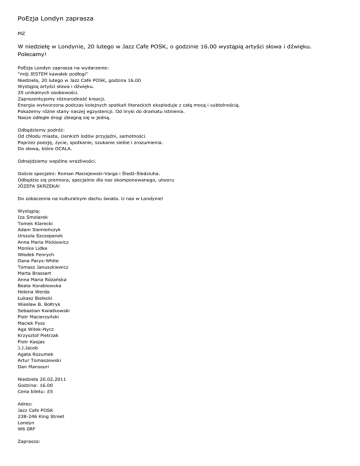 PoEzja Londyn zaprasza MZ W niedzielę w Londynie, 20 lutego w Jazz Cafe POSK, o godzinie 16.00 wystąpią artyści słowa i dźwięku. Polecamy! PoEzja Londyn zaprasza na wydarzenie: "mój JESTEM kawałek podłogi" Niedziela, 20 lutego w Jazz Cafe POSK, godzina 16.00 Wystąpią artyści słowa i dźwięku. 25 unikalnych osobowości. Zaprezentujemy różnorodność kreacji. Energia wytworzona podczas kolejnych spotkań literackich eksploduje z całą mocą i subtelnością. Pokażemy różne stany naszej egzystencji. Od liryki do dramatu istnienia. Nasze odległe drogi zbiegną się w jedną. Odbędziemy podróż: Od chłodu miasta, cienkich lodów przyjaźni, samotności. Poprzez poezję, życie, spotkanie, szukanie siebie i zrozumienia. Do słowa, które OCALA. Odnajdziemy wspólne wrażliwości. Goście specjalni: Roman Maciejewski-Varga i Śledź-Śledziuha. Odbędzie się premiera, specjalnie dla nas skomponowanego, utworu JÓZEFA SKRZEKA! Do zobaczenia na kulturalnym dachu świata. U nas w Londynie! Wystąpią: Iza Smolarek Tomek Klarecki Adam Siemieńczyk Urszula Szczepanek Anna Maria Mickiewicz Monika Lidke Włodek Fenrych Dana Parys-White Tomasz Januszkiewicz Marta Brassart Anna Maria Różańska Beata Korabiowska Helena Werda Łukasz Bielecki Wiesław B. Bołtryk Sebastian Kwiatkowski Piotr Macierzyński Maciek Pysz Aga Witek-Nycz Krzysztof Pietrzak Piotr Kasjas J.J.Jacob Agata Rozumek Artur Tomaszewski Dan Mansouri Niedziela 20.02.2011 Godzina: 16.00 Cena biletu: £5 Adres: Jazz Cafe POSK 238-246 King Street Londyn W6 0RF Zaprasza: Adam Siemieńczyk Marta Brassart PoEzja Londyn. PoEzja Londyn otworzyła swoje podwoje we wrześniu 2010. Wykreowana została przez Martę Brassart i Adama Siemieńczyka. Dewizą jest DODAWAĆ ODWAGI. Skupiamy się na słowie i sztukach, które współgrają z poetyckością. Zapraszamy do grona twórców, krytyków, popularyzatorów i odbiorców kultury. Mamy w naszej grupie ludzi słowa, obrazu i dźwięku. Tworzymy przestrzeń kreacji artystycznej i miejsce na spotkanie. Jest to również platforma promocyjna (jak się okazało). Podczas naszych działań w ramach PoEzji Londyn okazało się, że jesteśmy dobrze postrzegani przez media, krytyków i instytucje. Pozwala nam to na promowanie naszych artystów i współpracowników. Korzystamy tu z kontaktów własnych. Nie jesteśmy formalnie związani z żadną instytucją, ani mecenatem. Jesteśmy jednak otwarci na budowanie relacji z innymi. Jakie posiadamy doświadczenia? Marta Brassart (rocznik 1975, ur. w Białymstoku) jest miłośnikiem i organizatorem kultury. Studiowała filologię polską i kulturoznawstwo w Polsce, ukończyła socjologię we Francji; jest tłumaczem; pracowała w instytucji francuskiej ( Institut Medico-Educatif) jako tłumacz i koordynator wymiany francusko-angielskiej; organizowała szereg wystaw i spektakli we Francji; recytuje teksty naszych poetów. Adam Siemieńczyk (rocznik 1971, ur. w Gródku) ma doświadczenie w zakresie: rysunek satyryczny - szereg druków i wystaw, tomik rysunków satyrycznych; teatr - spektakle w Polsce i we Francji; poezja, proza, aforyzm - druki, tomiki, wieczorki, tłumaczenia na białoruski, francuski (dwie książki), angielski, niemiecki, włoski (pojedyncze wiersze); malarstwo olejne - wystawy indywidualne w Polsce i we Francji, roczny kontrakt z paryską galerią Les Galeries Artitude; praca jako kierownik Galerii 2000 - promocja artystów; okładki w wydawnictwach literackich; zajęcia plastyczne z dziećmi w wieku szkolnym w Polsce i we Francji. (Od września z odludka zmienia się w osobę otwartą.) Na jakich polach działamy w zakresie PoEzji Londyn. Poezja - mieliśmy szereg publikacji wierszy w prasie, portalach internetowych, blogach, wydawnictwach poetyckich w UK, Polsce, Austrii, Francji. Mamy nawiązany kontakt z periodykami, które się ukażą. Rozpoczynamy współpracę z krytyką literacką. Mamy oficjalne zaproszenie na Światowy Dzień Poezji (marzec, pokryte koszta pełnego pobytu). Mamy zdolność do tłumaczenia tekstów na język francuski i białoruski, angielski (jeszcze w ograniczonym zakresie). Rozpoczynamy profesjonalną współpracę w zakresie korekty i pracy redakcyjnej. Recenzujemy i dokumentujemy twórczość. Fotografia - druki w prasie poetyckiej, indywidualne prezentacje artystyczne w prasie (w przygotowaniu). Sztuki plastyczne (digart, cartoon) - druki w prasie poetyckiej i portalach internetowych. Dziennikarstwo - druki w prasie poetyckiej i polonijnej. Obecnie przygotowujemy druki artykułów opisujących spektakl w ponad 20 mediach. Czasem jako materiał własny, czasem jako cytaty. Film - prezentacja na portalach filmu niedeklamującego wydarzenie, przygotowujemy materiał do publikacji telewizyjnej. Muzyka - współpracujemy z muzykami i kompozytorami. Mamy trzy radia będące naszymi oficjalnymi patronami medialnymi. Już powstało kilka kompozycji specjalnie dla nas (Józef Skrzek, Urszula Szczepanek, Krzysztof Pioro Pikowski). Radio - przygotowujemy nagrania wierszy, wywiady, dokumentację. Współbycie, przestrzeń twórcza - PoEzja Londyn to spotkanie. Piszemy, czytamy, rozmawiamy, gramy, nagrywamy. Odnajdujemy i rozwijamy nasze wrażliwości i warsztat. Poprzez stworzenie płaszczyzny, gdzie doceniana jest twórczość, kreowane jest miejsce na wypowiedź artysty. Spotykamy się w domu, parku, galerii, kawiarni, teatrze. Uczestnictwo w kreacji sztuki zmienia człowieka nieodwracalnie. To nie zanika nawet po latach. PoEzja Londyn odnajduje (ludzi stąpających nieraz po cienkich lodach emigracyjnego bytu) i skupia osoby tak właśnie naznaczone. Są u nas nieudolni życiowo nadwrażliwcy, jak również ci, którzy są stabilnie osadzeni w codzienności. Nie jest ważna droga profesjonalna, którá już odbyli. Ważne są obecne działania. Dalsze efekty zależne są od talentu i pracy. PoEzja Londyn daje niezbędne parametry istnienia - PRZESTRZEŃ i CZAS. W naszych działaniach uczestnicz