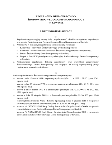 REGULAMIN ORGANIZACYJNY ŚRODOWISKOWEGO DOMU SAMOPOMOCY W SAWINIE I. POSTANOWIENIA OGÓLNE §1 1. Regulamin organizacyjny zwany dalej „regulaminem” określa szczegółowo organizację oraz zasady funkcjonowania Środowiskowego Domu Samopomocy w Sawinie. 2. Przez użyte w niniejszym regulaminie terminy należy rozumieć: Kierownik – kierownik Środowiskowego Domu Samopomocy, Uczestnik – osoba zakwalifikowana do Środowiskowego Domu Samopomocy, Dom – Środowiskowy Dom Samopomocy w Sawinie, Zespół – Zespół Wspierająco – Aktywizacyjny Środowiskowego Domu Samopomocy w Sawinie 3. Postanowienia regulaminu dotyczą uczestników oraz wszystkich pracowników Środowiskowego Domu Samopomocy bez względu na rodzaj wykonywanej pracy i zajmowane stanowisko służbowe. §2 Podstawą działalności Środowiskowego Domu Samopomocy są: ustawa z dnia 12 marca 2004 r. o pomocy społecznej (Dz. U. z 2009 r. Nr 175, poz. 1362 z późn. zm.), ustawa z dnia 19 sierpnia1994 r. o ochronie zdrowia psychicznego (Dz. U. Nr 111, poz. 535 z późn. zm.), ustawa z dnia 8 marca 1990 r. o samorządzie gminnym (Dz. U. z 2001 r. Nr 142, poz. 1591 z późn. zm.), ustawa z dnia 27 sierpnia 2009 r. o finansach publicznych (Dz. U. Nr 157 poz. 1240 z późn. zm.), rozporządzenia Ministra Pracy i Polityki Społecznej z dnia 9 grudnia 2010 r. w sprawie środowiskowych domów samopomocy (Dz. U. z 2010r. Nr 238, poz. 1586). uchwała Nr XXXV/216/06 Rady Gminy Sawin z dnia 26 października 2006 r. w sprawie celowości utworzenia Środowiskowego Domu Samopomocy w Sawinie, uchwała Nr XXXV/217/06 Rady Gminy Sawin z dnia 26 października 2006 r. w sprawie uchwalenia Statutu Środowiskowego Domu Samopomocy w Sawinie. §3 1. Środowiskowy Dom Samopomocy zapewnia oparcie społeczne dla osób z zaburzeniami psychicznymi poprzez świadczenie usług dostosowanych do szczególnych potrzeb tych osób, w szczególności: zapewnia rozwój umiejętności wykonywania czynności życia codziennego, uzdolnień i własnych zainteresowań poprzez rehabilitację, terapię zajęciową, pracę, dostęp do kultury i rekreacji, zapewnia posiłek w formie obiadu, zapewnia ochronę godności osobistej i poczucie intymności, kształtuje samodzielność i zasady współżycia w środowisku lokalnym poprzez swobodne kontakty, utrzymuje kontakty z rodzinami uczestników, dba o bezpieczne i higieniczne warunki pobytu, prowadzi profilaktykę w zakresie zdrowia psychicznego. 2. Środowiskowy Dom Samopomocy realizuje swoje zadania w oparciu o: program działalności Domu, plan pracy Domu na każdy rok. 1. 2. 3. 4. §4 Środowiskowy Dom Samopomocy jest jednostką budżetową Gminy Sawin. Nadzór bezpośredni nad Środowiskowym Domem Samopomocy sprawuje Wójt Gminy Sawin, a merytoryczny Wojewoda Lubelski. Środowiskowym Domem Samopomocy kieruje Kierownik, który jest zwierzchnikiem służbowym w stosunku do pracowników Środowiskowego Domu Samopomocy. Kierownika zatrudnia Wójt Gminy Sawin, pozostałych pracowników zatrudnia Kierownik Środowiskowego Domu Samopomocy. II. ZASADY ORGANIZACJI ŚRODOWISKOWEGO DOMU SAMOPOMOCY §5 1. Środowiskowy Dom Samopomocy jest placówką dziennego pobytu czynną od poniedziałku do piątku w godzinach od 7.30 do 15.30. 2. Zajęcia terapeutyczne prowadzone są w Środowiskowym Domu Samopomocy w godzinach od 8.00 do 15.00 według ustalonego harmonogramu. Pozostałą godzinę przeznacza się na czynności porządkowe, przygotowanie do zajęć, uzupełnianie niezbędnej dokumentacji, zapewnienie opieki uczestnikom w trakcie dowożenia na zajęcia lub odwożenia do miejsca zamieszkania. §6 1. Środowiskowy Dom Samopomocy prowadzi zajęcia dla uczestników w oparciu o indywidualne plany postępowania wspierająco - aktywizującego przygotowywane przez Zespół. 2. W skład zespołu Wspierająco - Aktywizacyjnego wchodzą wszyscy merytoryczni pracownicy Środowiskowego Domu Samopomocy. 3. Zajęcia wspierająco – aktywizacyjne obejmują: trening funkcjonowania w codziennym życiu, w tym: trening dbałości o wygląd zewnętrzny, trening nauki higieny, trening kulinarny, trening umiejętności praktycznych, trening gospodarowania własnymi środkami finansowymi; trening umiejętności interpersonalnych i rozwiazywania problemów, w tym: kształtowanie pozytywnych relacji uczestnika z osobami bliskimi, sąsiadami, z innymi osobami w czasie zakupów, w środkach komunikacji publicznej, w urzędach, w instytucjach kultury; trening umiejętności spędzania czasu wolnego, w tym: rozwijanie zainteresowań literaturą, audycjami radiowymi, telewizyjnymi, Internetem, udział w spotkaniach towarzyskich i kulturalnych; terapię ruchową; poradnictwo psychologiczne; działania edukacyjne i inne formy terapii. 4. Szczegółowe zasady działania Zespołu Wspierająco – Aktywizującego określone są w odrębnym regulaminie. §7 1. Pobyt w Środowiskowym Domu Samopomocy jest odpłatny. 2. Opłata miesięczna za pobyt ustalana jest na podstawie art. 51b ustawy z dnia 12 lutego 2010 r. o zmianie ustawy o pomocy społecznej. 3. Środowiskowy Dom Samopomocy ubezpiecza uczestników od następstw nieszczęśliwych wypadków związanych z udziałem w zajęciach terapeutycznych i rehabilitacji oraz w drodze do domu i z domu. Koszty ubezpieczenia ponoszą uczestnicy lub opiekunowie prawni. §8 1. Środowiskowy Dom Samopomocy jest zobowiązany do prowadzenia dokumentacji indywidualnej każdego uczestnika oraz dokumentacji zbiorczej. 2. Dokumentacja zbiorcza zawiera: ewidencję uczestników, ewidencję obecności uczestników w ŚDS, dzienniki dokumentujące pracę pracowników zespołu wspierająco – aktywizującego, ewidencję byłych uczestników, ewidencję osób oczekujących na przyjęcie do ŚDS, ewidencję samodzielnych wyjść uczestników, rejestr współpracy z rodzinami uczestników i instytucjami oraz kronikę. 3. Dokumentację indywidualną uczestnika stanowi w szczególności: kopia decyzji kierującej do domu, kopia orz