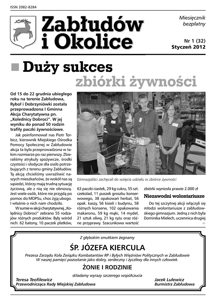 ISSN 2082-8284 Miesięcznik bezpłatny Zabłudów i Okolice Nr 1 (32) Styczeń 2012 Duży sukces zbiórki żywności Od 15 do 22 grudnia ubiegłego roku na terenie Zabłudowa, Ryboł i Dobrzyniówki została przeprowadzona I Gminna Akcja Charytatywna pn. „Kolednicy Dobroci”. W jej wyniku do ponad 50 rodzin trafiły paczki żywnościowe. Jak poinformował nas Piotr Torbicz, kierownik Miejskiego Ośrodka Pomocy Społecznej w Zabłudowie akcja ta była przeprowadzona w takim rozmiarze po raz pierwszy. Zbieraliśmy atrykuły spożywcze, środki czystości i słodycze dla osób potrzebujących z terenu gminy Zabłudów. Tą akcją chcieliśmy uwrażliwić naszych mieszkańców, że wokół nas są sąsiedzi, którzy mają trudną sytuację życiową, ale z nią się nie obnoszą. Jest wiele osób, które nie przyjdą po pomoc do MOPSu, choc żyją ubogo. I właśnie o nich nam chodziło. W sumie w akcji charytatywnej „Kolędnicy Dobroci” zebrano 55 rodzajów różnych produktów. Były wśród nich: 62 batony, 10 paczek płatków, Gimnazjaliści zachęcali do wzięcia udziału w zbiórce żywności 63 paczki ciastek, 29 kg cukru, 55 szt. czekolad, 11 puszek groszku konserwowego, 38 opakowań herbat, 56 opak. kaszy, 56 kisieli i budyniu, 58 różnych konserw, 102 opakowania makaronu, 59 kg mąki, 14 mydeł, 21 sztuk oliwy, 21 kg ryżu oraz różne przyprawy. Szacunkowa wartość zbiórki wyniosła prawie 2.000 zł Niezawodni wolontariusze Do tej szczytnej akcji włączyli się młodzi wolontariusze z zabłudowskiego gimnazjum. Jedną z nich była Dominika Mielech, uczennica drugiej Z głębokim smutkiem żegnamy ŚP. JÓZEFA KIERCULA Prezesa Zarządu Koła Związku Kombatantów RP i Byłych Więźniów Politycznych w Zabłudowie W naszej pamięci pozostanie jako dobry, serdeczny i życzliwy dla innych człowiek. ŻONIE I RODZINIE składamy wyrazy szczerego współczucia Teresa Teofilewicz Jacek Lulewicz Przewodnicząca Rady Miejskiej Zabłudowa Burmistrz Zabłudowa 2 Zabłudów i Okolice klasy, która stwierdziła, że taka akcja jest bardzo potrzebna. – Jest wiele osób, którym ta żywność na pewno ułatwiła radosne przeżycie świąt Bożego Narodzenia. Byliśmy w pewnym rodzaju mikołajami. Myślę, że dzięki naszemu zaanagażowaniu ubodzy mieli łatwiej. Chłopcy i dziewczęta codziennie w godzinach od 15 do 17 zachęcali kupujących w sklepach do wsparcia prowadzonej akcji. Każdy, kto włożył produkt do świątecznego koszyka, otrzymał symboliczną, ręcznie wykonaną kartkę świąteczną. Iwona Chojnowska, opiekun grupy wolontariackiej z gimnazjum również uważa akcję „Kolędnicy Dobroci” za bardzo udaną. W tych godzinach, kiedy młodzież zachęcała kupujących do wzięcia w niej udział ilość produktów trafiających do koszy znacznie wzrastała. – Mogę zaświadczyć, że tylko nieliczni spośród naszych mieszkańców nic nie wkładali do koszy. Naprawdę jestem bardzo zadowolona, że tak wiele osób włączyło się w tę akcję charytatywną. – Pomysł zaangażowania młodzieży gimnazjalnę w zbiórkę żywności uważam za bardzo trafiony – zaznaczył kierownik MOPSu. Są to fantastyczni młodzi ludzie otwarci na Takie produkty trafiły do potrzebujących rodzin potrzeby innych osób. Dzięki temu, że gimnazjaliści stali w sklepach i zachęcali do umieszczenia w koszach i pudełkach artykułów uzyskaliśmy ich cztery razy więcej niż normalnie. Czynnik ludzi jest potęgą. Jak zapowiedział Piotr Torbicz tą akcją rozpoczęliśmy cykliczne zbiórki charytatywne w naszej gminie. Kolejną planujemy już przed Wielkanocą. Oto sklepy, które wzięły udział w zbiórce żywności: GS „SCH” Zabłudów Delikatesy Nr 3, ul. Mickiewicza, Delikatesy Nr 2, ul. Rynek, Delika- tesy Nr 1, ul. Białostocka, Pawilon Handlowy, sklep spożywczy „SM Krokus” ul. Białostocka, sklep spożywczy „KAMA”, sklep spożywczy PH Andrzej Łotko, sklep spożywczy w Rybołach i Dobrzyniówce. Organizatorami I Gminnej Akcji Charytatywnej „Kolędnicy Dobroci” były: Miejski Ośrodek Pomocy Społecznej w Zabłudowie, Miejski Ośrodek Animacji Kultury w Zabłudowie i grupa wolontariatu z Gimnazjum im. Grzegorza Chodkiewicza w Zabłudowie. PW Ferie w MOAK-u Miejski Ośrodek Animacji Kultury w Zabłudowie serdecznie zaprasza dzieci i młodzież na zajęcia podczas 30 grudnia 2011 roku w wieku 97 lat zmarł nadchodzących ferii zimowych. Szczegółowy ich program można znaleźć na stronie www.moak-zabludow.pl Z głębokim żalem i smutkiem przyjęliśmy wiadomość o śmierci ŚP. JÓZEF KIERCUL ŚP. JÓZEFA KIERCULA Prezes Zarządu Koła Związku Kombatantów RP i Byłych Więźniów Politycznych w Zabłudowie Prezesa Zarządu Koła Związku Kombatantów RP i Byłych Więźniów Politycznych w Zabłudowie ŻONIE, RODZINIE I BLISKIM RODZINIE I BLISKIM wyrazy głębokiego współczucia składają koleżanki i koledzy z Koła w Zabłudowie wyrazy współczucia składają dyrekcja i pracownicy Miejskiego Ośrodka Animacji Kultury oraz Miejskiej Biblioteki Publicznej w Zabłudowie Nr 1 (32) • Styczeń 2012 3 Czas na zmiany Z Jarosławem Kazimierczukiem, nowym komendantem Miejsko – Gminny Ochotniczych Straży Pożarnych w Zabłudowie rozmawia Piotr Woroniecki. 26 listopada 2011 roku został Pan wybrany na nowego komendanta OSP w Gminie Zabłudów. Co się stało, że po 26-latach nastąpiła zmiana na tym stanowisku? Czyżby Romuald Wiszniewski stracił Wasze zaufanie? Tak, patrząc na ilość głosów mogę stwierdzić, że poprzedni komendant stracił nasze zaufanie. Problemy nawarstwiające się już od kilku lat, niereagowanie na potrzeby strażnic czy niedopilnowanie naszych inwestycji przyczyniło się m.in. do wyboru nowego szefa strażaków w gminie Zabłudów. Musieliśmy w końcu zdecydowanie zareagować. Jak widzi Pan funkcjonowanie OSP, co należy poprawić, a co zostawić jak dotychczas. W naszej gminie mamy dwie jednostki, które są w krajowy