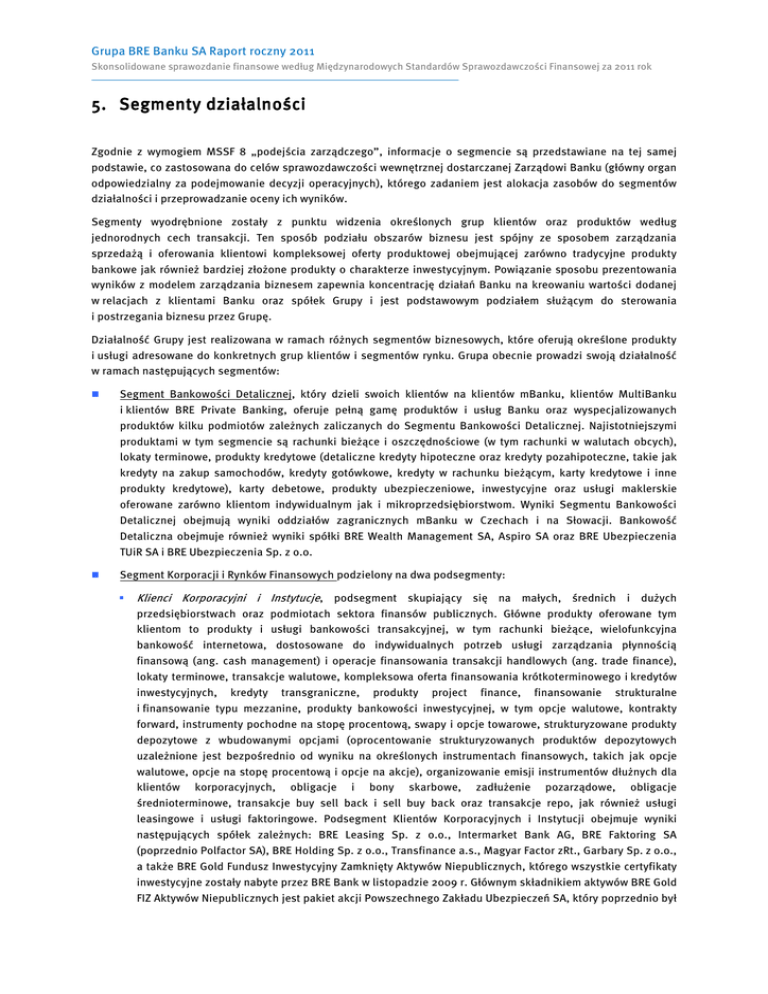 Grupa BRE Banku SA Raport roczny 2011 Skonsolidowane sprawozdanie finansowe według Międzynarodowych Standardów Sprawozdawczości Finansowej za 2011 rok 5. Segmenty działalności Zgodnie z wymogiem MSSF 8 „podejścia zarządczego”, informacje o segmencie są przedstawiane na tej samej podstawie, co zastosowana do celów sprawozdawczości wewnętrznej dostarczanej Zarządowi Banku (główny organ odpowiedzialny za podejmowanie decyzji operacyjnych), którego zadaniem jest alokacja zasobów do segmentów działalności i przeprowadzanie oceny ich wyników. Segmenty wyodrębnione zostały z punktu widzenia określonych grup klientów oraz produktów według jednorodnych cech transakcji. Ten sposób podziału obszarów biznesu jest spójny ze sposobem zarządzania sprzedażą i oferowania klientowi kompleksowej oferty produktowej obejmującej zarówno tradycyjne produkty bankowe jak również bardziej złożone produkty o charakterze inwestycyjnym. Powiązanie sposobu prezentowania wyników z modelem zarządzania biznesem zapewnia koncentrację działań Banku na kreowaniu wartości dodanej w relacjach z klientami Banku oraz spółek Grupy i jest podstawowym podziałem służącym do sterowania i postrzegania biznesu przez Grupę. Działalność Grupy jest realizowana w ramach różnych segmentów biznesowych, które oferują określone produkty i usługi adresowane do konkretnych grup klientów i segmentów rynku. Grupa obecnie prowadzi swoją działalność w ramach następujących segmentów: Segment Bankowości Detalicznej, który dzieli swoich klientów na klientów mBanku, klientów MultiBanku i klientów BRE Private Banking, oferuje pełną gamę produktów i usług Banku oraz wyspecjalizowanych produktów kilku podmiotów zależnych zaliczanych do Segmentu Bankowości Detalicznej. Najistotniejszymi produktami w tym segmencie są rachunki bieżące i oszczędnościowe (w tym rachunki w walutach obcych), lokaty terminowe, produkty kredytowe (detaliczne kredyty hipoteczne oraz kredyty pozahipoteczne, takie jak kredyty na zakup samochodów, kredyty gotówkowe, kredyty w rachunku bieżącym, karty kredytowe i inne produkty kredytowe), karty debetowe, produkty ubezpieczeniowe, inwestycyjne oraz usługi maklerskie oferowane zarówno klientom indywidualnym jak i mikroprzedsiębiorstwom. Wyniki Segmentu Bankowości Detalicznej obejmują wyniki oddziałów zagranicznych mBanku w Czechach i na Słowacji. Bankowość Detaliczna obejmuje również wyniki spółki BRE Wealth Management SA, Aspiro SA oraz BRE Ubezpieczenia TUiR SA i BRE Ubezpieczenia Sp. z o.o. Segment Korporacji i Rynków Finansowych podzielony na dwa podsegmenty: Klienci Korporacyjni i Instytucje, podsegment skupiający się na małych, średnich i dużych przedsiębiorstwach oraz podmiotach sektora finansów publicznych. Główne produkty oferowane tym klientom to produkty i usługi bankowości transakcyjnej, w tym rachunki bieżące, wielofunkcyjna bankowość internetowa, dostosowane do indywidualnych potrzeb usługi zarządzania płynnością finansową (ang. cash management) i operacje finansowania transakcji handlowych (ang. trade finance), lokaty terminowe, transakcje walutowe, kompleksowa oferta finansowania krótkoterminowego i kredytów inwestycyjnych, kredyty transgraniczne, produkty project finance, finansowanie strukturalne i finansowanie typu mezzanine, produkty bankowości inwestycyjnej, w tym opcje walutowe, kontrakty forward, instrumenty pochodne na stopę procentową, swapy i opcje towarowe, strukturyzowane produkty depozytowe z wbudowanymi opcjami (oprocentowanie strukturyzowanych produktów depozytowych uzależnione jest bezpośrednio od wyniku na określonych instrumentach finansowych, takich jak opcje walutowe, opcje na stopę procentową i opcje na akcje), organizowanie emisji instrumentów dłużnych dla klientów korporacyjnych, obligacje i bony skarbowe, zadłużenie pozarządowe, obligacje średnioterminowe, transakcje buy sell back i sell buy back oraz transakcje repo, jak również usługi leasingowe i usługi faktoringowe. Podsegment Klientów Korporacyjnych i Instytucji obejmuje wyniki następujących spółek zależnych: BRE Leasing Sp. z o.o., Intermarket Bank AG, BRE Faktoring SA (poprzednio Polfactor SA), BRE Holding Sp. z o.o., Transfinance a.s., Magyar Factor zRt., Garbary Sp. z o.o., a także BRE Gold Fundusz Inwestycyjny Zamknięty Aktywów Niepublicznych, którego wszystkie certyfikaty inwestycyjne zostały nabyte przez BRE Bank w listopadzie 2009 r. Głównym składnikiem aktywów BRE Gold FIZ Aktywów Niepublicznych jest pakiet akcji Powszechnego Zakładu Ubezpieczeń SA, który poprzednio był Grupa BRE Banku SA Raport roczny 2011 Skonsolidowane sprawozdanie finansowe według Międzynarodowych Standardów Sprawozdawczości Finansowej za 2011 rok własnością Banku. W 2011 roku w odniesieniu do spółek Intermarket Bank AG i Magyar Factor zRt, podsegment ten obejmuje wyniki osiągnięte przez te spółki do dnia realizacji transakcji sprzedaży posiadanych przez Grupę udziałów. Działalność Handlowa i Inwestycyjna, podsegment, który obejmuje głównie działalność w zakresie operacji skarbowych (ang. treasury), rynków finansowych, zarządzania płynnością, ryzykiem stóp procentowych i walutowym Banku oraz jego portfelem handlowym i inwestycyjnym, a także organizowanie rynku dla instrumentów pieniężnych i pochodnych denominowanych w PLN, organizowanie emisji instrumentów dłużnych dla instytucji finansowych oraz obsługę instytucji finansowych. Bank prowadzi współpracę z wieloma bankami-korespondentami, a także nawiązuje relacje z innymi bankami oferując produkty takie jak konta bieżące, zadłużenie w rachunku bieżącym, kredyty udzielane samodzielnie i w ramach konsorcjum oraz kredyty ubezpieczane przez KUKE mające na celu wspieranie polskiego eksportu. W ramach tego podsegmentu są wykazywane wyniki spółki BRE Bank Hipoteczny SA, BRE Finance France