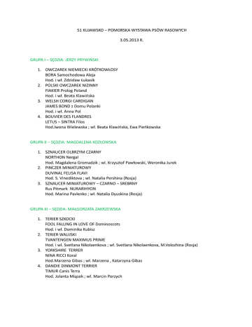 51 KUJAWSKO – POMORSKA WYSTAWA PSÓW RASOWYCH 3.05.2013 R. GRUPA I – SĘDZIA: JERZY PRYWIŃSKI 1. OWCZAREK NIEMIECKI KRÓTKOWŁOSY BORA Samochodowa Aleja Hod. i wł. Zdzisław Łukasik 2. POLSKI OWCZAREK NIZINNY FIAKIER Prolog Poland Hod. i wł. Beata Klawińska 3. WELSH CORGI CARDIGAN JAMES BOND z Domu Polanki Hod. i wł. Anna Pol 4. BOUVIER DES FLANDRES LETUS – SINTRA Filos Hod.Iwona Wielewska ; wł. Beata Klawińska, Ewa Pieńkowska GRUPA II – SĘDZIA: MAGDALENA KOZŁOWSKA 1. SZNAUCER OLBRZYM CZARNY NORTHON Nergal Hod. Magdalena Gromadzik ; wl. Krzysztof Pawłowski, Weronika Jurek 2. PINCZER MINIATUROWY DUVINAL FELISA FLAVI Hod. S. Vinediktova ; wł. Natalia Pershina (Rosja) 3. SZNAUCER MINIATUROWY – CZARNO – SREBRNY Rus Pitmark NURARIHYON Hod. Marina Pavlenko ; wł. Natalia Dyuskina (Rosja) GRUPA III – SĘDZIA: MAŁGORZATA ZAKRZEWSKA 1. TERIER SZKOCKI FOOL FALLING IN LOVE OF Dominoscots Hod. i wł. Dominika Kubisz 2. TERIER WALIJSKI TVANTENGEN MAXIMUS PRIME Hod. i wl. Svetlana Nikolaenkova ; wł. Svetlana Nikolaenkova, M.Volozhina (Rosja) 3. YORKSHIRE TERRER NINA RICCI Koral Hod.Marzena Gibas ; wł. Marzena , Katarzyna Gibas 4. DANDIE DINMONT TERRIER TIMUR Canis Terra Hod. Jolanta Miąsek ; wł. Marcin Porzych GRUPA IV – SĘDZIA: BOGUSŁAWA SZYDLOWICZ – POLAŃCZYK 1. JAMNIK SZORSTKOWŁOSY MINIATUROWY Zimerbude MARSELEZA Hod. i wł. Zhanna Lukoshko ; wł. Igor Lukoshko, Zhanna Lukoshko (Rosja) 2. JAMNIK SZORSTKOWŁOSY KRÓLICZY Lisiego Nosa VESMA HOROCH Hod. marina Kovalenko ; wł. M. Kolbasina, M. Kovalenko (Rosja) 3. JAMNIK DŁUGOWŁOSY STANDARDOWY Dvinskie Zori SHESTOY ELEMENT Hod. E.Khlebnikova ; wł. Magdalena Rykowska - Janowska 4. JAMNIK SZORSTKOWŁOSY STANDARDOWY CZANGA Złamany Szeląg Hod. i wł. Maria i Zbigniew Wawrzyniak GRUPA V – SĘDZIA: EWA STOLARSKA 1. SIBERIAN HUSKY Winter Melody DOUBLE TROUBLE Hod. i wł. Ewa Górska i Jose Luis Gomez Sanchez 2. SAMOYED Belyi Volk PARADISE HARMONY Hod. T. Evgrafova ; wł. N. Balakireva (Rosja) 3. AKITA YOKOHAMA Duma Samuraja Hod. i wł. Marzena Mikuła 4. ALASKAN MALAMUTE Arctic Callenge WINTER FLOWER Hod. Iwona Lenarczyk, J.Kordalska-Lenarczyk ; wł. Katarzyna Plak – Kotlarska GRUPA VI – SĘDZIA: EWA MARCINKOWSKA 1. POSOKOWIEC BAWARSKI WARKA Sfora Nemroda Hod. A.M. Cysewskie ; wł. Aleksandra Trepanowska 2. BASSET HOUND RUMBA Galopująca Fufla Hod. i wł. Dorota Gąsiorowska 3. BEAGLE Absolutely Spotless SZACH Hod. i wł. Tomasz Bukowski 4. GOŃCZY POLSKI DUNAJ Leszczynowy Gaj Hod. i wł. Donat Pierożyński GRUPA VII – SĘDZIA: BOGUSŁAWA SZYDŁOWICZ – POLAŃCZYK 1. WYŻEŁ NIEMIECKI SZORSTKOWŁOSY IKAR Spokojne Łowisko Hod. i wł. Henryk Tomaszewski 2. SETER SZKOCKI GORDON Laurelhach MOST WANTED Hod. Frances Boxall ; wł. Olga Przybyłowska 3. WYŻEŁ NIEMIECKI KRÓTKOWŁOSY NEFRA Hubertówka znad Parsęty Hod. Krzysztof Sagan ; wł. Jadwiga Sagan 4. SETER IRLANDZKI DARIA’S DALILAH All About Arina And B’Doll Hod. i wł. Daria Gyedu GRUPA VIII – SĘDZIA: MAGDALENA ŚWIĘTOŃ 1. COCKER SPANIEL ANGIELSKI CATCH THE WIND Renmil’s Dream Hod. i wł. Renata Niklasiewicz i Milena Seidel 2. CLUMBER SPANIEL NEQUAM Kaprys Rejenta Hod. Ewa Knuplerz ; wł. Dorota Paterak 3. FIELD SPANIEL Winterbourne NORWEGIAN WOOD Hod. Maria Kohlstrom ; wł. Ewa Ostapczuk – Gębka 4. COCKER SPANIEL AMERYKAŃSKI STAR INLAY CHARMEUR GREEN PLACE Hod. Olga Nesterenko ; wł. Beata Królak GRUPA IX – SĘDZIA: MARIOLA ŻUCHLIŃSKA 1. CAVALIER KING CHARLES SPANIEL RAINDROP Sylena Hod. i wł. Jerzy Olszewski 2. PUDEL MINIATUROWY Diza Fleich THE SILVER BEAUTY Hod. A. Berezina ; wł. O. Bernshtein (Rosja) 3. LHASA APSO MAŁY KSIĄŻĘ Azurowa Amhara Hod. Ewa Besaraba ; wł. Anna Majewicz 4. BULGOG FRANCUSKI Ignavi EMMA BEAUTIFUL NIGHT Hod. Nadezhda Ignatova ; wł. Olga Protasova (Rosja) GRUPA X – SĘDZIA: EWA MARCINKOWSKA 1. GREYHOUND Fionn Clann ZALMAN Hod. E. Arhipova ; wł. Monika i Przemysław Jarczyńscy 2. CHART AFGAŃSKI RASZID Akacjana Hod. Dagmara Łączyńska ; wł. Alina Wróbel 3. CHART POLSKI ZLOTY Sopocka Aura Hod. Aurelia Cieślicka ; wł. Dariusz Drozdowski 4. WHIPPET Meradith I FEEL SO ATTRACTIVE Hod. Agnieszka Nakonieczna ; wł. Monika Jarczyńska, Adrianna Jarczyńska MEMORIAŁ IM. MARII DUBROWINOWEJ POLSKI OWCZAREK NIZINNY – ZWYCIĘZCA RASY FIAKIER Prolog Poland Hod. i wł. Beata Klawińska MEMORIAŁ IM. MARIANA SZYMANKIEWICZA OWCZAREK NIEMIECKI KRÓTKOWŁOSY – ZWYCIĘZCA RASY BORA Samochodowa Aleja Hod. i wł. Zdzisław Łukasik MEMORIAŁ IM. TERESY JASZOWSKIEJ SHIH – TZU – ZWYCIĘZCA RASY HANA Ad Acte Hod. Bogumiła Strzyżewska ; wł. Svietlana Kovalchuk (Rosja) KONKURS MŁODY PREZENTER – SĘDZIA: MAGDALENA KOZŁOWSKA GRUPA MŁODSZA 1. Magdalena Majerowicz 2. Julia Foksińska 3. Gabriela Szkodzińska GRUPA STARSZA 1. Katarzyna Żak 2.Małgorzata Tymczak 3.Joanna Guzowska 4.Elżbieta Jedlińska ZWYCIĘZCA DNIA Katarzyna Żak NAJPIĘKNIEJSZE BABY WYSTAWY – SĘDZIA: EWA STOLARSKA 1. POLSKI OWCZAREK NIZINNY AKWARELA Rawipon Hod. Iwona Wojdyła ; wł. Beata Klawińska 2. JAMNIK KRÓTKOWŁOSY STANDARDOWY PANDORA z Dachu Hod. i wł. Hanna Maniewska 3. MASTIF TYBETAŃSKI CAIRO Matha – Ratha Hod. Beata Wejksznia ; wł. Violetta Szypulska 4. BULDOG ANGIELSKI VALENTYNA z Rodu Uparciuchów Hod. Marzena Aleksandrowicz ; wł. Beata Pruchniewicz – Tajl NAJPIĘKNIEJSZE SZCZENIĘ WYSTAWY – SĘDZIA: BOGUSŁAWA SZYDŁOWICZ – POLAŃCZYK 1. AMERICAN STAFFORDSHIRE TERIER EVERGLADES DRAGONESS W RED Florida Hod. i wł. Weronika Jurek, Małgorzata Jurek – Ereńska 2. SIBERIAN HUSKY SYMPHONY OF THE NIGHT LEGEND OF THE SPIRIT HOD. I WŁ. Izabela Krieger 3. MALTAŃCZYK MONT BLANC Maltezzi Hod. Sylwester Szumaczuk ; wł. Agnieszka Humerczyk 4. BULDOG FRANCUSKI QUARELLE de la Virreyna Hod. Rodriguez Tola Ulises, Rodriguez Garcia David ; wł. Joanna Dzikiewicz NAJPIĘKNIEJSZY JUNIOR WYSTAWY – SĘDZIA: MAGDALENA ŚWIĘTOŃ 1. CAVALIER KING CHARLES SPANIEL HIGH CLASS DE VAUDIVAL Hod. Duglas Bernard ; wł. Bernard 
