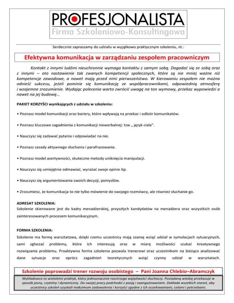 Serdecznie zapraszamy do udziału w wyjątkowo praktycznym szkoleniu, nt.: Efektywna komunikacja w zarządzaniu zespołem pracowniczym Kontakt z innymi ludźmi nieuchronnie wymaga kontaktu z samym sobą. Dogadać się ze sobą oraz z innymi – oto nastawienie tak zwanych kompetencji społecznych, które są nie mniej ważne niż kompetencje zawodowe, a nawet mają przed nimi pierwszeństwo. W kierowaniu zespołem nie można odnieść sukcesu, jeżeli pominie się komunikację ze współpracownikami, odpowiednią atmosferę i wzajemne zrozumienie. Wydając polecenia warto zwrócić uwagę na ton wymowy, przekaz wypowiedzi a nawet na jej budowę… PAKIET KORZYŚCI wynikających z udziału w szkoleniu: • Poznasz model komunikacji oraz bariery, które wpływają na przekaz i odbiór komunikatów. • Poznasz kluczowe zagadnienia z komunikacji niewerbalnej: tzw „ język ciała”. • Nauczysz się zadawać pytania i odpowiadać na nie. • Poznasz zasady aktywnego słuchania i parafrazowania. • Poznasz model asertywności, skuteczne metody uniknięcia manipulacji. • Nauczysz się umiejętnie odmawiać, wyrażać swoje opinie itp. • Nauczysz się argumentowania swoich decyzji, pomysłów. • Zrozumiesz, że komunikacja to nie tylko mówienie do swojego rozmówcy, ale również słuchanie go. ADRESAT SZKOLENIA: Szkolenie skierowane jest do kadry menadżerskiej, przyszłych kandydatów na menadżera oraz wszystkich osób zainteresowanych procesem komunikacyjnym. FORMA SZKOLENIA: Szkolenie ma formę warsztatowa, dzięki czemu uczestnicy mają szansę wziąć udział w symulacjach sytuacyjnych, sami zgłaszać problemy, które ich interesują oraz w miarę możliwości szukać kreatywnego rozwiązania problemu. Proaktywna forma szkolenia pozwala trenerowi oraz uczestnikom na bieżąco analizować dane sytuacje oraz oprócz zagadnień teoretycznych wziąć czynny udział w warsztatach. Szkolenie poprowadzi trener rozwoju osobistego – Pani Joanna Chlebio–Abramczyk Wykładowca to wieloletni praktyk, który jednoznacznie rozstrzyga wątpliwości słuchaczy. Posiadaną wiedzę przekazuje w sposób jasny, czytelny i dynamiczny. Do swojej pracy podchodzi z pasją i zaangażowaniem. Dokłada wszelkich starań, aby uczestnicy szkoleń uzyskali maksimum zadowolenia i korzyści zgodne z ich oczekiwaniami, celami i potrzebami. RAMOWY PLAN SZKOLENIA: 1. Model procesu komunikowania się /omówienie głównych zagadnień/. 2. Fazy komunikacji interpersonalnej. 3. Rodzaje komunikacji: werbalna i niewerbalna. 4. Rozumienie języka ciała. 5. Umiejętność argumentowania i przekonywania innych. 6. Sztuka bycia asertywnym i nie asertywnym. 7. Sztuka słuchania i zadawania pytań. 8. Parafrazowanie. 9. Procesy grupowe. 10. Wpływ grupy na jednostkę. 11. Jak budować zaufanie? Szkolenie odbędzie się w małej kameralnej grupie – umożliwiającej prowadzenie swobodnej dyskusji i wymiany doświadczeń. Czas trwania: 6 godzin. Rozpoczęcie szkolenia: godzina 9:00; zakończenie ok. 15:00. W trakcie spotkania zapraszamy na przerwy kawowe z ciasteczkami i ciepły lunch. Zapewniamy przydatne materiały dydaktyczne! Rezerwacja według kolejności zgłoszeń; ilość miejsc jest ograniczona. Organizator zastrzega sobie możliwość zmiany miejsca szkolenia w obrębie miejscowości.