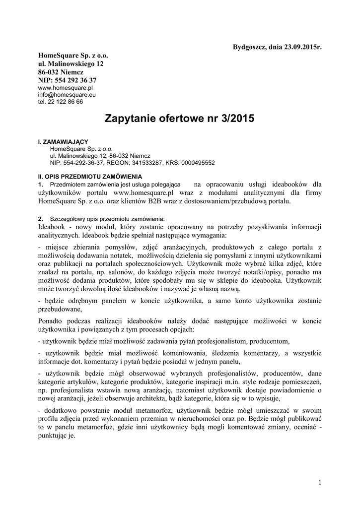 Bydgoszcz, dnia 23.09.2015r. HomeSquare Sp. z o.o. ul. Malinowskiego 12 86-032 Niemcz NIP: 554 292 36 37 www.homesquare.pl [email protected] tel. 22 122 86 66 Zapytanie ofertowe nr 3/2015 I. ZAMAWIAJĄCY HomeSquare Sp. z o.o. ul. Malinowskiego 12, 86-032 Niemcz NIP: 554-292-36-37, REGON: 341533287, KRS: 0000495552 II. OPIS PRZEDMIOTU ZAMÓWIENIA 1. Przedmiotem zamówienia jest usługa polegająca na opracowaniu usługi ideabooków dla użytkowników portalu www.homesquare.pl wraz z modułami analitycznymi dla firmy HomeSquare Sp. z o.o. oraz klientów B2B wraz z dostosowaniem/przebudową portalu. 2. Szczegółowy opis przedmiotu zamówienia: Ideabook - nowy moduł, który zostanie opracowany na potrzeby pozyskiwania informacji analitycznych. Ideabook będzie spełniał następujące wymagania: - miejsce zbierania pomysłów, zdjęć aranżacyjnych, produktowych z całego portalu z możliwością dodawania notatek, możliwością dzielenia się pomysłami z innymi użytkownikami oraz publikacji na portalach społecznościowych. Użytkownik może wybrać kilka zdjęć, które znalazł na portalu, np. salonów, do każdego zdjęcia może tworzyć notatki/opisy, ponadto ma możliwość dodania produktów, które spodobały mu się w sklepie do ideabooka. Użytkownik może tworzyć dowolną ilość ideabooków i nazywać je własną nazwą. - będzie odrębnym panelem w koncie użytkownika, a samo konto użytkownika zostanie przebudowane, Ponadto podczas realizacji ideabooków należy dodać następujące możliwości w koncie użytkownika i powiązanych z tym procesach opcjach: - użytkownik będzie miał możliwość zadawania pytań profesjonalistom, producentom, - użytkownik będzie miał możliwość komentowania, śledzenia komentarzy, a wszystkie informacje dot. komentarzy i pytań będzie posiadał w jednym panelu, - użytkownik będzie mógł obserwować wybranych profesjonalistów, producentów, dane kategorie artykułów, kategorie produktów, kategorie inspiracji m.in. style rodzaje pomieszczeń, np. profesjonalista wstawia nową aranżację, natomiast użytkownik dostaje powiadomienie o nowej aranżacji, jeżeli obserwuje architekta, bądź kategorie, która się w to wpisuje, - dodatkowo powstanie moduł metamorfoz, użytkownik będzie mógł umieszczać w swoim profilu zdjęcia przed wykonaniem przemian w nieruchomości oraz po. Będzie mógł publikować to w panelu metamorfoz, gdzie inni użytkownicy będą mogli komentować zmiany, oceniać punktując je. 1 W celu działania funkcji ideabooka będzie konieczne dodanie funkcjonalności w całym serwisie - dodaj do ideabooka dla zdjęć, obserwuj dla profili pro, kategorii produktów, styli inspiracji, kat. artykułów, itp. Analityka: - zbieranie informacji o preferencjach użytkownika w celu dalszego wykorzystania w panelach analitycznych m.in.. Jakie produkty cieszą się zainteresowaniem, statystyki kategorii produktów, rodzaje produktów, rodzaje inspiracje, style, profesjonaliści, kat. artykułów oraz konkretne artykuły. Na podstawie analityki możliwe będzie: - przesyłanie oferty powiązanej z zainteresowaniami użytkownika, - dostosowane rabaty do produktów ulubionych/przeglądanych - przypominanie o porzuconym koszyku i formy zachęty do realizacji zamówienia - propozycje przesłania produktów na podstawie preferencji, które użytkownik chciałby zakupić w panelu sprzedawcy/profesjonalisty. Ponadto HomeSquare oraz partnerzy B2B otrzymają statystyki dotyczących ich kont oraz zawartości strony, która jest dla nich przypisana, np. architekci - ilość wyświetleń profilu, ilość wyświetleń inspiracji, ilość wyświetleń artykułów sponsorowanych, produktów, itp. Analityka wraz z panelami musi zostać opracowana w celu uzyskania najskuteczniejszej sprzedaży i dotarcia do klienta. Oprócz tego na podstawie statystyk zebranych informacji klient B2B musi uzyskać informacje, które przyniosą mu wymierne efekty, np. będzie w stanie wywnioskować czy nowa seria produktów, którą wprowadził cieszy się powodzeniem, jakie uwagi mają do niej klienci, itp. Wykonawca musi być w stanie stworzyć system zbierania preferencji od użytkowników, a następnie opracować statystyki i funkcjonalności, które będą w stanie sprostać wymaganiom klientów biznesowych firmy HomeSquare dzięki unikatowości i innowacyjności analiz. Zamawiający przewiduje budowę platformy homesquare.pl od podstaw w celu uzyskania założeń prac przewidzianych w zapytaniu oraz w celu zwiększenia wydajności i przyjazności interfejsów dla użytkowników końcowych. Wykonawca zobowiązany jest do migracji aktualnych danych na platformie wraz z ulepszeniem funkcjonalności portalu, które obecnie działają oraz dodaniem funkcjonalności wg poniższego opisu: I. Analityka - opracowanie inteligentnego systemu do analizowania i zwiększania sprzedaży, wg opracowanego systemu analiz. II. Budowa i modernizacja funkcji platformy Wszystkie strony platformy muszą mieć zaimplementowane funkcje analityczne wymienione w punkcie I - odpowiednio dla treści i funkcji, której dany moduł może posłużyć. Np. dla strony głównej wyświetlanie dynamicznych treści i analiza zachowań użytkownika. Dla sklepu, analiza zachowań, preferencje produktowe, zdarzenia dotyczące porzucenia koszyka, informowanie klienta (przypominanie o zakończeniu zakupów), kampanie marketingowe, sugerowanie podobnych produktów, funkcje up-sell (sugerowanie podobnych produktów w karcie produktu), cross-sell (sugerowanie produktów w koszyku na podstawie już dodanych). Dla artykułów analityka zachowań, sugerowanie produktów powiązanych z tematyką, proponowanie powiązanych artykułów, sugerowanie artykułów, które użytkownik może lubić wg zbadanych preferencji. 2 Platforma może zostać przebudowana (system Wordpress) lub dopuszcza się budowę systemu od podstaw bazując na aktualnych danych, używając innego systemu CRM (np. Magento). B