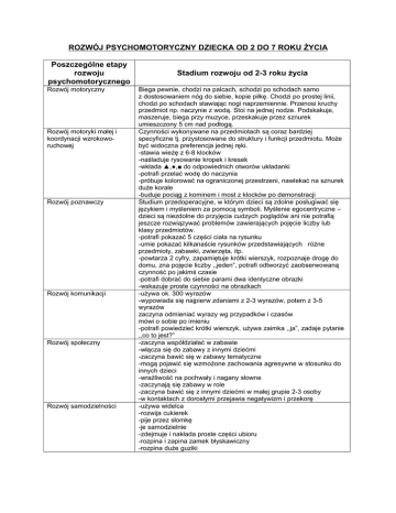 ROZWÓJ PSYCHOMOTORYCZNY DZIECKA OD 2 DO 7 ROKU ŻYCIA Poszczególne etapy rozwoju psychomotorycznego Rozwój motoryczny Rozwój motoryki małej i koordynacji wzrokoworuchowej Rozwój poznawczy Rozwój komunikacji Rozwój społeczny Rozwój samodzielności Stadium rozwoju od 2-3 roku życia Biega pewnie, chodzi na palcach, schodzi po schodach samo z dostosowaniem nóg do siebie, kopie piłkę. Chodzi po prostej linii, chodzi po schodach stawiając nogi naprzemiennie. Przenosi kruchy przedmiot np. naczynie z wodą. Stoi na jednej nodze. Podskakuje, maszeruje, biega przy muzyce, przeskakuje przez sznurek umieszczony 5 cm nad podłogą. Czynności wykonywane na przedmiotach są coraz bardziej specyficzne tj. przystosowane do struktury i funkcji przedmiotu. Może być widoczna preferencja jednej ręki. -stawia wieżę z 6-8 klocków -naśladuje rysowanie kropek i kresek -wkłada ▲,●,■ do odpowiednich otworów układanki -potrafi przelać wodę do naczynia -próbuje kolorować na ograniczonej przestrzeni, nawlekać na sznurek duże korale -buduje pociąg z kominem i most z klocków po demonstracji Studium przedoperacyjne, w którym dzieci są zdolne posługiwać się językiem i myśleniem za pomocą symboli. Myślenie egocentryczne – dzieci są niezdolne do przyjęcia cudzych poglądów ani nie potrafią jeszcze rozwiązywać problemów zawierających pojęcie liczby lub klasy przedmiotów. -potrafi pokazać 5 części ciała na rysunku -umie pokazać kilkanaście rysunków przedstawiających różne przedmioty, zabawki, zwierzęta, itp. -powtarza 2 cyfry, zapamiętuje krótki wierszyk, rozpoznaje drogę do domu, zna pojęcie liczby ,,jeden”, potrafi odtworzyć zaobserwowaną czynność po jakimś czasie -potrafi dobrać do siebie parami dwa identyczne obrazki -wskazuje proste czynności na obrazkach -używa ok. 300 wyrazów -wypowiada się najpierw zdaniami z 2-3 wyrazów, potem z 3-5 wyrazów zaczyna odmieniać wyrazy wg przypadków i czasów mówi o sobie po imieniu -potrafi powiedzieć krótki wierszyk, używa zaimka ,,ja”, zadaje pytanie ,,co to jest?” -zaczyna współdziałać w zabawie -włącza się do zabawy z innymi dziećmi -zaczyna bawić się w zabawy tematyczne -mogą pojawić się wzmożone zachowania agresywne w stosunku do innych dzieci -wrażliwość na pochwały i nagany słowne -zaczynają się zabawy w role -zaczyna bawić się z innymi dziećmi w małej grupie 2-3 osoby -w kontaktach z dorosłymi przejawia negatywizm i przekorę -używa widelca -rozwija cukierek -pije przez słomkę -je samodzielnie -zdejmuje i nakłada proste części ubioru -rozpina i zapina zamek błyskawiczny -rozpina duże guziki Poszczególne etapy rozwoju psychomotorycznego Rozwój motoryczny Rozwój motoryki małej i koordynacji wzrokoworuchowej Rozwój poznawczy Rozwój komunikacji Rozwój społeczny Rozwój samodzielności Stadium rozwoju od 3-4 roku życia -potrafi utrzymać równowagę, gdy stoi z zamkniętymi oczami z wykroku (palce jednej nogi dotykają pięty drugiej nogi) i na jednej nodze z otwartymi oczami -kopie piłkę do celu -wchodzi i schodzi ze schodów, stawiając nogi na przemian, nie trzymając się poręczy -zeskakuje z najniższego stopnia schodów -przeskakuje z rozbiegu przeszkodę 20-25 cm nad ziemią -jeździ na sankach, trzykołowym rowerku (pod kontrolą dorosłego) -zaczyna uczyć się np. pływać, jeździć na rowerze, łyżwach -buduje dwu-trzywymiarowe budowle -rysuje koło -lepi z plasteliny np. wałeczek, kulkę -posługuje się ręką dominującą -potrafi nożycami ciąć papier -odkręca nakrętki -zaczyna planować swoje działania i nazywa konstrukcje przed wykonaniem -współpraca pomiędzy ręką dominującą a wspomagającą -powtarza 3 cyfry i zdanie z 6-12 sylab -potrafi z pamięci powtórzyć krótkie opowiadanie -składa obrazki rozcięte na dwie części, opisuje obrazek wymieniając znajdujące się na nim przedmioty -rozumie układy słów zawierające określenie ,,na, w, do, za, pod, nad, przed, naprzeciw, na wierzchu, na dole” -zlicza cztery przedmioty -gromadzi przedmioty mając wybraną wspólną cechę -spostrzega cechy nieistotne, mające wartość subiektywną -uwaga mimowolna, nietrwała, mało podzielna, skupienie na ok. 15 min. – zajęcia grupowe -komentuje wykonane czynności -słownik od 1000 do 2000 słów -zdanie złożone z wielu wyrazów, artykulacja może być jeszcze niewyraźna -głównie reaguje na polecenia kierowane indywidualnie, słabo podporządkowuje się poleceniom adresowanym do całej grupy -coraz lepiej współdziała w zabawie -chwiejność uczuciowa -często przeżywa różne lęki, np. w sytuacji rozstania z matką w obcym środowisku -potrafi zrezygnować z przyjemności na rzecz drugiego dziecka -częsta postawa egoistyczna i egocentryczna -lubi pomagać rodzicom w drobnych pracach domowych (np. przynoszeniu rzeczy, rozkładaniu nakryć na stole, ścieraniu kurzu) -je, myje się, ubiera i rozbiera samodzielnie, ale wymaga nadzoru i dyskretnej pomocy -sprząta zabawki z pomocą -próbuje zapinać guziki -zdejmuje i wkłada rajstopy -myje zęby pod nadzorem -smaruje chleb np.. masłem -nalewa z dzbanka Poszczególne etapy rozwoju psychomotorycznego Rozwój motoryczny Rozwój motoryki małej i koordynacji wzrokoworuchowej Rozwój poznawczy Rozwój komunikacji Rozwój społeczny Rozwój samodzielności Stadium rozwoju od 4-5 roku życia -chodzi po równoważni -wykonuje ok. pięciu podskoków jeden za drugim -wspina się na drabinkę -doskonali rzucanie i chwytanie piłki -stoi na palcach kilka chwil zachowując równowagę -posuwa się wzdłuż linii prostej ok. 5 m podskakując na jednej nodze (pięciolatek) -idzie na palcach ok. 3 m (pięciolatek) -biegnie po schodach do góry, bez trzymania się poręczy -wykonuje elementarne ćwiczenia gimnastyczne i sportowe (łyżwy, narty, pływanie) -potrafi stać na jednej nodze ok. 15 s. (czterolatek) -trafia piłką do celu z odległości 1 m, rzuca pi