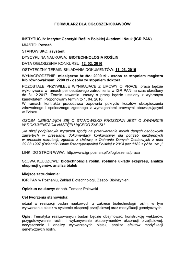 FORMULARZ DLA OGŁOSZENIODAWCÓW INSTYTUCJA: Instytut Genetyki Roślin Polskiej Akademii Nauk (IGR PAN) MIASTO: Poznań STANOWISKO: asystent DYSCYPLINA NAUKOWA: BIOTECHNOLOGIA ROŚLIN DATA OGŁOSZENIA KONKURSU: 12. 02. 2016 OSTATECZNY TERMIN SKŁADANIA DOKUMENTÓW: 11. 03. 2016 WYNAGRODZENIE: miesięczne brutto: 2000 zł - osoba ze stopniem magistra lub równoważnym; 2200 zł - osoba ze stopniem doktora POZOSTAŁE PRZYWILEJE WYNIKAJĄCE Z UMOWY O PRACĘ: praca będzie wykonywana w ramach pełnoetatowego zatrudnienia w IGR PAN na czas określony do 31.12.2017. Termin zawarcia umowy o pracę będzie ustalony z wybranym kandydatem. Proponowany termin to 1. 04. 2016. W ramach kontraktu pracodawca zapewnia pokrycie kosztów ubezpieczenia zdrowotnego i społecznego zgodnego z wymaganiami prawnymi obowiązującymi w Polsce. OSOBA UBIEGAJĄCA SIĘ O STANOWISKO PROSZONA JEST O ZAWARCIE W DOKUMENTACJI NASTĘPUJĄCEGO ZAPISU: „Ja niżej podpisany/a wyrażam zgodę na przetwarzanie moich danych osobowych zawartych w przesłanej dokumentacji konkursowej dla potrzeb niezbędnych w procesie rekrutacji, zgodnie z Ustawą o Ochronie Danych Osobowych z dnia 29.08.1997 (Dziennik Ustaw Rzeczypospolitej Polskiej z 2014 poz.1182 z późn. zm.)” LINKI DO STRON WWW: http://www.igr.poznan.pl/pl/ogloszenia/praca SŁOWA KLUCZOWE: biotechnologia roślin, roślinne układy ekspresji, analiza ekspresji genów, analiza białek Miejsce zatrudnienia: IGR PAN w Poznaniu, Zakład Biotechnologii, Zespół Bioinżynierii. Opiekun naukowy: dr hab. Tomasz Pniewski Cel tworzenia stanowiska: udział w realizacji badań naukowych z zakresu biotechnologii roślin, w tym wytwarzania białek w systemie ekspresji przejściowej oraz modyfikacji genetycznych. Opis: Tematyka realizowanych badań będzie obejmować: konstrukcję wektorów, przygotowywanie roślin i wykonywanie eksperymentów ekspresji przejściowej, oczyszczanie i analizy wytwarzanych białek, analiza efektów modyfikacji genetycznych roślin. Wymagane umiejętności: • znajomość zagadnień oraz technik badawczych z zakresu biotechnologii roślin, biologii molekularnej, oczyszczania i analizy białek, • biegłość w łączeniu technik molekularnych, podejść eksperymentalnych i analiz strukturalnych w celu formułowania i weryfikacji hipotez dotyczących otrzymywania funkcjonalnych białek heterologicznych oraz modyfikacji genetycznych; • umiejętność pracy zespołowej; • znajomość obsługi programów arkuszy kalkulacyjnych; • znajomość podstaw analizy statystycznej; • dobra znajomość języka angielskiego. Preferowani będą kandydaci z doświadczeniem w zakresie biotechnologii roślin, szczególnie ekspresji białek heterologicznych i modyfikacji genetycznych, udokumentowanym dorobkiem publikacyjnym, szczególnie w czasopismach z listy Journal Citation Reports. Przy ocenie kandydatury osoby ubiegającej się o stanowisko asystenta brana również będzie pod uwagę aktywność naukowa kandydata i umiejętność dyskusji w języku angielskim. Zakres obowiązków: Prowadzenie badań na wysokim poziomie naukowym w ramach Zespołu, publikowanie wyników w renomowanych czasopismach naukowych, prezentacja badań na konferencjach krajowych i międzynarodowych, samodzielne oraz wspólne składanie projektów badawczych finansowanych ze źródeł krajowych lub zagranicznych, rozwijanie współpracy z innymi ośrodkami naukowymi i przedsiębiorstwami. Wykaz dokumentów wymaganych od kandydata: 1) List motywacyjny; 2) CV kandydata zawierające w szczególności: listę publikacji, wykonywanych/ kierowanych projektów badawczych, doniesień konferencyjnych i in. aktywności naukowych; 3) Odpis(y) dyplomu(ów); 4) Autoreferat opisujący przebieg dotychczasowej pracy naukowej i dokumentujący spełnienie wymagań odnoszących się do danego stanowiska naukowego; Dokumenty prosimy składać osobiście lub mailem z tytułem "Konkurs asystent Bioinżynieria" w Dziale Kadr, pok. 125 (email: [email protected]) z kopią do dr. hab. Tomasza Pniewskiego (email: [email protected]) lub też listownie pod adresem: Instytut Genetyki Roślin PAN, ul. Strzeszyńska 34, 60-479 Poznań. Termin rozstrzygnięcia konkursu i ogłoszenia wyników: Nie później niż 1 miesiąc po zamknięciu naboru.