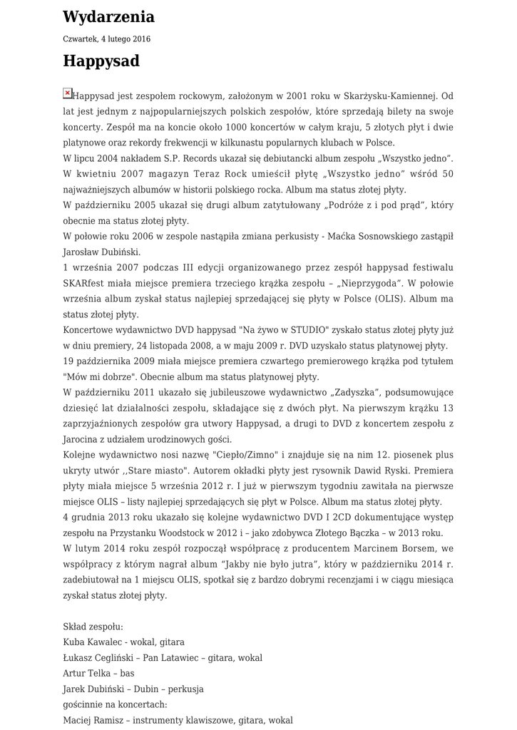 Wydarzenia Czwartek, 4 lutego 2016 Happysad Happysad jest zespołem rockowym, założonym w 2001 roku w Skarżysku-Kamiennej. Od lat jest jednym z najpopularniejszych polskich zespołów, które sprzedają bilety na swoje koncerty. Zespół ma na koncie około 1000 koncertów w całym kraju, 5 złotych płyt i dwie platynowe oraz rekordy frekwencji w kilkunastu popularnych klubach w Polsce. W lipcu 2004 nakładem S.P. Records ukazał się debiutancki album zespołu „Wszystko jedno”. W kwietniu 2007 magazyn Teraz Rock umieścił płytę „Wszystko jedno” wśród 50 najważniejszych albumów w historii polskiego rocka. Album ma status złotej płyty. W październiku 2005 ukazał się drugi album zatytułowany „Podróże z i pod prąd”, który obecnie ma status złotej płyty. W połowie roku 2006 w zespole nastąpiła zmiana perkusisty - Maćka Sosnowskiego zastąpił Jarosław Dubiński. 1 września 2007 podczas III edycji organizowanego przez zespół happysad festiwalu SKARfest miała miejsce premiera trzeciego krążka zespołu – „Nieprzygoda”. W połowie września album zyskał status najlepiej sprzedającej się płyty w Polsce (OLIS). Album ma status złotej płyty. Koncertowe wydawnictwo DVD happysad "Na żywo w STUDIO" zyskało status złotej płyty już w dniu premiery, 24 listopada 2008, a w maju 2009 r. DVD uzyskało status platynowej płyty. 19 października 2009 miała miejsce premiera czwartego premierowego krążka pod tytułem "Mów mi dobrze". Obecnie album ma status platynowej płyty. W październiku 2011 ukazało się jubileuszowe wydawnictwo „Zadyszka”, podsumowujące dziesięć lat działalności zespołu, składające się z dwóch płyt. Na pierwszym krążku 13 zaprzyjaźnionych zespołów gra utwory Happysad, a drugi to DVD z koncertem zespołu z Jarocina z udziałem urodzinowych gości. Kolejne wydawnictwo nosi nazwę "Ciepło/Zimno" i znajduje się na nim 12. piosenek plus ukryty utwór ,,Stare miasto". Autorem okładki płyty jest rysownik Dawid Ryski. Premiera płyty miała miejsce 5 września 2012 r. I już w pierwszym tygodniu zawitała na pierwsze miejsce OLIS – listy najlepiej sprzedających się płyt w Polsce. Album ma status złotej płyty. 4 grudnia 2013 roku ukazało się kolejne wydawnictwo DVD I 2CD dokumentujące występ zespołu na Przystanku Woodstock w 2012 i – jako zdobywca Złotego Bączka – w 2013 roku. W lutym 2014 roku zespół rozpoczął współpracę z producentem Marcinem Borsem, we współpracy z którym nagrał album “Jakby nie było jutra”, który w październiku 2014 r. zadebiutował na 1 miejscu OLIS, spotkał się z bardzo dobrymi recenzjami i w ciągu miesiąca zyskał status złotej płyty. Skład zespołu: Kuba Kawalec - wokal, gitara Łukasz Cegliński – Pan Latawiec – gitara, wokal Artur Telka – bas Jarek Dubiński – Dubin – perkusja gościnnie na koncertach: Maciej Ramisz – instrumenty klawiszowe, gitara, wokal Michał Bąk – saksofon, instrumenty klawiszowe Daniel Pomorski – trąbka, klawisze Jakub Moroń - puzon Dyskografia: „Wszystko jedno” – 2004 r. (SP Records) „Podróże z i pod prąd” – 2005 r. (SP Records) „Nostress/Łydka” – 2006 r. – singiel (SP Records) „Nieprzygoda” – 2007 r. (SP Records) „Na żywo w Studio” – 2008 r. – 2DVD (Mystic Production) „Na żywo w Studio” – 2009 r. – 2CD (Mystic Production) „Mów mi dobrze” – 2009 r. (Mystic Production) „Zadyszka” – 2011 r. – CD/DVD (Mystic Production) „Ciepło/Zimno” – 2012 r. (Mystic Production) „Przystanek Woodstock 2013” – 2013 r. (Złoty Melon) „Jakby nie było jutra” - 2014 r. (Mystic Production)