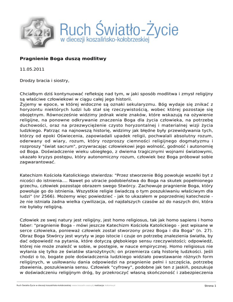 Pragnienie Boga duszą modlitwy 11.05.2011 Drodzy bracia i siostry, Chciałbym dziś kontynuować refleksję nad tym, w jaki sposób modlitwa i zmysł religijny są właściwe człowiekowi w ciągu całej jego historii. Żyjemy w epoce, w której widoczne są oznaki sekularyzmu. Bóg wydaje się znikać z horyzontu niektórych ludzi lub stał się rzeczywistością, wobec której pozostaje się obojętnym. Równocześnie widzimy jednak wiele znaków, które wskazują na ożywienie religijne, na ponowne odkrywanie znaczenia Boga dla życia człowieka, na potrzebę duchowości, oraz na przezwyciężenie czysto horyzontalnej i materialnej wizji życia ludzkiego. Patrząc na najnowszą historię, widzimy jak błędne były przewidywania tych, którzy od epoki Oświecenia, zapowiadali upadek religii, pochwalali absolutny rozum, oderwany od wiary, rozum, który rozproszy ciemności religijnego dogmatyzmu i rozproszy "świat sacrum", przywracając człowiekowi jego wolność, godność i autonomię od Boga. Doświadczenie wieku ubiegłego, z dwiema tragicznymi wojnami światowymi, ukazało kryzys postępu, który autonomiczny rozum, człowiek bez Boga próbował sobie zagwarantować. Katechizm Kościoła Katolickiego stwierdza: "Przez stworzenie Bóg powołuje wszelki byt z nicości do istnienia.... Nawet po utracie podobieństwa do Boga na skutek popełnionego grzechu, człowiek pozostaje obrazem swego Stwórcy. Zachowuje pragnienie Boga, który powołuje go do istnienia. Wszystkie religie świadczą o tym poszukiwaniu właściwym dla ludzi" (nr 2566). Możemy więc powiedzieć - jak to ukazałem w poprzedniej katechezie że nie istniała żadna wielka cywilizacja, od najdalszych czasów aż do naszych dni, która nie byłaby religijną. Człowiek ze swej natury jest religijny, jest homo religiosus, tak jak homo sapiens i homo faber: "pragnienie Boga - mówi jeszcze Katechizm Kościoła Katolickiego - jest wpisane w serce człowieka, ponieważ człowiek został stworzony przez Boga i dla Boga" (n. 27). Obraz Boga Stwórcy jest wyryty w jego istocie i czuje on potrzebę znalezienia światła, by dać odpowiedź na pytania, które dotyczą głębokiego sensu rzeczywistości; odpowiedź, której nie może znaleźć w sobie, w postępie, w nauce empirycznej. Homo religiosus nie wyłania się tylko ze światów starożytnych; on przemierza całą historię ludzkości. Jeśli chodzi o to, bogate pole doświadczenia ludzkiego widziało powstawanie różnych form religijnych, w usiłowaniu dania odpowiedzi na pragnienie pełni i szczęścia, potrzebę zbawienia, poszukiwania sensu. Człowiek "cyfrowy", podobne jak ten z jaskiń, poszukuje w doświadczeniu religijnym dróg, by przekroczyć własną skończoność i zabezpieczenia Ruch Światło-Życie w diecezji koszalińsko-kołobrzeskiej: www.koszalin.oaza.pl; realizacja: kokoma.pl Strona 1 własnej niepewnej (kruchej) ziemskiej przygody. Poza tym, życie bez horyzontu transcendentnego byłoby pozbawione sensu spełnienia i szczęścia, do którego wszyscy zmierzamy, jest ono ukierunkowane spontanicznie na przyszłość, na jutru, które ma jeszcze nadejść. Sobór Watykański II w Deklaracji Nostra etatae syntetycznie podkreślił: "Ludzie oczekują od różnych religii odpowiedzi na głębokie tajemnice ludzkiej egzystencji, które jak niegdyś, tak i teraz do głębi poruszają ludzkie serca; czym jest człowiek, jaki jest sens i cel naszego życia, co jest dobrem, a co grzechem, jakie jest źródło i jaki cel cierpienia, na jakiej drodze można osiągnąć prawdziwą szczęśliwość, czym jest śmierć, sąd i wymiar sprawiedliwości po śmierci, czym wreszcie jest owa ostateczna i niewysłowiona tajemnica, ogarniająca nasz byt, z której bierzemy początek i ku której dążymy" (n.1). Człowiek wie, że nie może sam sobie odpowiedzieć na własną podstawową potrzebę zrozumienia. Mimo że się łudził i łudzi się dalej, że może być samowystarczalny, ciągle doświadcza, że nie wystarcza sam sobie. Potrzebuje się otworzyć na coś innego: coś lub kogoś, kto może obdarzyć go tym, czego mu brakuje, musi wyjść od samego siebie ku Temu, który będzie mógł wypełnić szerokość i głębokość jego pragnienia. Człowiek nosi w sobie głód nieskończoności, tęsknotę za wiecznością, pragnienie poszukiwania piękna, miłości, potrzebę światła i prawdy, które zbliżają go ku Absolutowi; człowiek nosi w sobie pragnienie Boga. I człowiek wie w pewien sposób, że może zwrócić się ku Bogu, wie, iż może modlić się do Niego. Św. Tomasz z Akwinu, jeden z największych teologów w dziejach, określa modlitwę jako „wyraz pragnienia Boga, jakie posiada człowiek". Owo bycie "pociąganymi" ku Bogu, które On sam złożył w człowieku, jest właśnie duszą modlitwy, która następnie wyraża się w różnych formach i sposobach, w zależności od kontekstu historycznego, od czasu, od chwili, od łaski i nawet w zależności od grzechów każdej modlącej się osoby. Ponieważ człowiek rozwinął w sobie różne sposoby otwierania się ku Innemu i ku temu co przekracza naszą rzeczywistość, historia ludzkości zna w rezultacie tego najróżniejsze formy modlitwy. Dlatego też modlitwę możemy uznać za doświadczenie obecne w każdej religii i w każdej kulturze. Rzeczywiście, drodzy bracia i siostry, jak to widzieliśmy w zeszłą środę, modlitwa nie jest przywiązana do jakiegoś jednego tylko szczególnego kontekstu, lecz jest ona wpisana w serce każdego człowieka i w każdego społeczeństwa. Oczywiście, gdy mówimy o modlitwie jako o doświadczeniu człowieka jako takiego, jako doświadczeniu homo orans, koniecznym jest uświadomienie sobie, iż bardziej niż zespołem praktyk i formuł, jest ona wewnętrzną postawą, bardziej niż wykonywaniem aktów kultu i wypowiadaniem słów, jest ona sposobem istnienia w Bożej obecności. Modlitwa ma swoje centrum i zapuszcza swoje korzenie w najgłębszych 