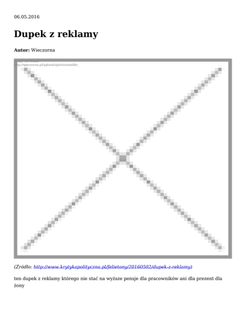 06.05.2016 Dupek z reklamy Autor: Wieczorna Image not found http://wieczorna.pl/uploads/photos/middle_ (Źródło: http://www.krytykapolityczna.pl/felietony/20160502/dupek-z-reklamy) ten dupek z reklamy którego nie stać na wyższe pensje dla pracowników ani dla prezent dla żony