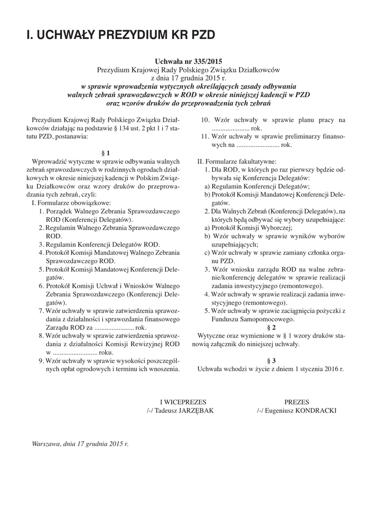 I. UCHWAŁY PREZYDIUM KR PZD Uchwała nr 335/2015 Prezydium Krajowej Rady Polskiego Związku Działkowców z dnia 17 grudnia 2015 r. w sprawie wprowadzenia wytycznych określających zasady odbywania walnych zebrań sprawozdawczych w ROD w okresie niniejszej kadencji w PZD oraz wzorów druków do przeprowadzenia tych zebrań Prezydium Krajowej Rady Polskiego Związku Działkowców działając na podstawie § 134 ust. 2 pkt 1 i 7 statutu PZD, postanawia: §1 Wprowadzić wytyczne w sprawie odbywania walnych zebrań sprawozdawczych w rodzinnych ogrodach działkowych w okresie niniejszej kadencji w Polskim Związku Działkowców oraz wzory druków do przeprowadzania tych zebrań, czyli: I. Formularze obowiązkowe: 1. Porządek Walnego Zebrania Sprawozdawczego ROD (Konferencji Delegatów). 2. Regulamin Walnego Zebrania Sprawozdawczego ROD. 3. Regulamin Konferencji Delegatów ROD. 4. Protokół Komisji Mandatowej Walnego Zebrania Sprawozdawczego ROD. 5. Protokół Komisji Mandatowej Konferencji Delegatów. 6. Protokół Komisji Uchwał i Wniosków Walnego Zebrania Sprawozdawczego (Konferencji Delegatów). 7. Wzór uchwały w sprawie zatwierdzenia sprawozdania z działalności i sprawozdania finansowego Zarządu ROD za ....................... rok. 8. Wzór uchwały w sprawie zatwierdzenia sprawozdania z działalności Komisji Rewizyjnej ROD w .......................... roku. 9. Wzór uchwały w sprawie wysokości poszczególnych opłat ogrodowych i terminu ich wnoszenia. 10. Wzór uchwały w sprawie planu pracy na ...................... rok. 11. Wzór uchwały w sprawie preliminarzy finansowych na ......................... rok. II. Formularze fakultatywne: 1. Dla ROD, w których po raz pierwszy będzie odbywała się Konferencja Delegatów: a) Regulamin Konferencji Delegatów; b) Protokół Komisji Mandatowej Konferencji Delegatów. 2. Dla Walnych Zebrań (Konferencji Delegatów), na których będą odbywać się wybory uzupełniające: a) Protokół Komisji Wyborczej; b) Wzór uchwały w sprawie wyników wyborów uzupełniających; c) Wzór uchwały w sprawie zamiany członka organu PZD. 3. Wzór wniosku zarządu ROD na walne zebranie/konferencję delegatów w sprawie realizacji zadania inwestycyjnego (remontowego). 4. Wzór uchwały w sprawie realizacji zadania inwestycyjnego (remontowego). 5. Wzór uchwały w sprawie zaciągnięcia pożyczki z Funduszu Samopomocowego. §2 Wytyczne oraz wymienione w § 1 wzory druków stanowią załącznik do niniejszej uchwały. §3 Uchwała wchodzi w życie z dniem 1 stycznia 2016 r. I WICEPREZES /-/ Tadeusz JARZĘBAK Warszawa, dnia 17 grudnia 2015 r. PREZES /-/ Eugeniusz KONDRACKI WYTYCZNE w sprawie przeprowadzania walnych zebrań sprawozdawczych w rodzinnych ogrodach działkowych Polskiego Związku Działkowców w okresie kadencji Niniejsze wytyczne wskazują zasady odbywania walnych zebrań sprawozdawczych w rodzinnych ogrodach działkowych zarządzanych przez stowarzyszenie ogrodowe Polski Związek Działkowców w okresie obecnej kadencji w Związku. Na opracowanie wytycznych do przeprowadzenia walnych zebrań sprawozdawczych oraz formularzy dokumentów na okres kadencji pozwoliło wdrożenie ustawy z dnia 13 grudnia 2013 roku o rodzinnych ogrodach działkowych oraz zarejestrowanie w Krajowym Rejestrze Sądowym statutu PZD uchwalonego na XII Krajowym Zjeździe Delegatów PZD. Walne zebranie jest najwyższym organem PZD w ROD, który podejmuje najważniejsze dla funkcjonowania ROD decyzje. Zgodnie z § 56 ust. 2 statutu PZD prawo uczestniczenia w nim mają wyłącznie członkowie PZD. Dlatego też zarządy ROD muszą bezwzględnie przygotować imienną listę członków PZD w ROD oraz dopilnować, aby w zebraniu wzięły udział wyłącznie osoby uprawnione. Niezbędne jest więc sprawdzanie dowodu tożsamości przy podpisywaniu listy obecności. Należy pamiętać, że prawa członkowskie wykonuje się osobiście (§ 14 ust. 2 statutu PZD), dlatego nie jest dopuszczalne zastępstwo członka PZD w czynnym udziale w walnym zebraniu sprawozdawczym (konferencji delegatów). OBOWIĄZKI OKRĘGOWEGO ZARZĄDU PZD Przed walnymi zebraniami sprawozdawczymi 1. Zaplanowanie pracy i zadań związanych z walnymi zebraniami sprawozdawczymi w ROD. 2. Opracowanie przez prezydium OZ i wdrożenie systemu narad i szkoleń dla prezesów ROD. 3. Powołanie i przeszkolenie zespołu do obsługi walnych zebrań nie tylko z prawa związkowego, ale także aktualnych problemów Związku, a w szczególności programu PZD uchwalonego na XII Krajowym Zjeździe Delegatów PZD i wynikającego z niego otwarcia ogrodów, pozyskiwania środków z funduszy europejskich oraz krajowych i rozwoju ROD. 4. Ustalenie kalendarza walnych zebrań. 5. Udzielenie pomocy w zorganizowaniu zebrań tym ogrodom, które nie posiadają odpowiednich świetlic. 6. Ustalenie obsługi poszczególnych walnych zebrań przez członków powołanego przez OZ zespołu. 7. Przedstawienie na walnych zebraniach: – aktualnych problemów Związku, a w szczególności programu PZD na kadencję uchwalonego na XII Krajowym Zjeździe Delegatów PZD i wynikającego z niego otwarcia ogrodów, pozyskiwania środków z funduszy europejskich oraz krajowych i rozwoju ROD, – działań Związku na rzecz ogrodów i działkowców, – aktualnych problemów rodzinnych ogrodów działkowych, zadań i roli organów Związku w służbie działkowców. OBOWIĄZKI ZARZĄDU ROD Przed zebraniem: 1. Przygotowanie sprawozdania (merytorycznego i finansowego) za poprzedni rok. Komisja rewizyjna ROD przygotowuje własne sprawozdanie z działalności w poprzednim roku. 2. Przygotowanie projektu porządku obrad i regulaminu walnego zebrania (konferencji). 3. Uzgodnienie terminu walnego zebrania (konferencji) z okręgiem PZD. 4. Przygotowanie materiałów i projektów uchwał dotyczących bieżącej działalności ogrodu wynikających z obowiązków walnego zebrania sprawozdawczego (przede wszystkim kalkulacja wysokości opłat ogrodowych). 5. Przy
