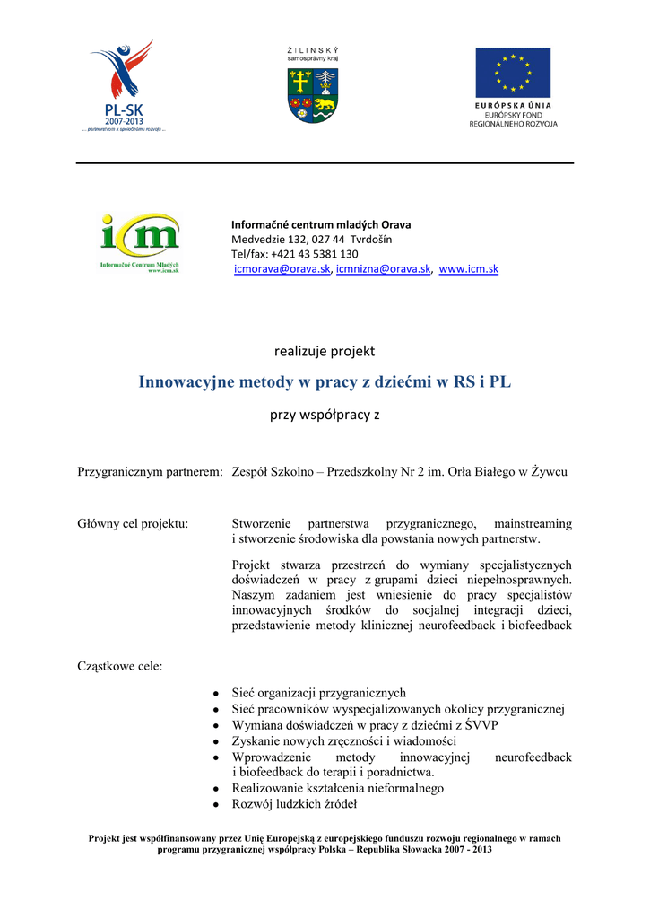 Informačné centrum mladých Orava Medvedzie 132, 027 44 Tvrdošín Tel/fax: +421 43 5381 130 [email protected], [email protected], www.icm.sk realizuje projekt Innowacyjne metody w pracy z dziećmi w RS i PL przy współpracy z Przygranicznym partnerem: Zespół Szkolno – Przedszkolny Nr 2 im. Orła Białego w Żywcu Główny cel projektu: Stworzenie partnerstwa przygranicznego, mainstreaming i stworzenie środowiska dla powstania nowych partnerstw. Projekt stwarza przestrzeń do wymiany specjalistycznych doświadczeń w pracy z grupami dzieci niepełnosprawnych. Naszym zadaniem jest wniesienie do pracy specjalistów innowacyjnych środków do socjalnej integracji dzieci, przedstawienie metody klinicznej neurofeedback i biofeedback Cząstkowe cele: Sieć organizacji przygranicznych Sieć pracowników wyspecjalizowanych okolicy przygranicznej Wymiana doświadczeń w pracy z dziećmi z ŚVVP Zyskanie nowych zręczności i wiadomości Wprowadzenie metody innowacyjnej neurofeedback i biofeedback do terapii i poradnictwa. Realizowanie kształcenia nieformalnego Rozwój ludzkich źródeł Projekt jest współfinansowany przez Unię Europejską z europejskiego funduszu rozwoju regionalnego w ramach programu przygranicznej współpracy Polska – Republika Słowacka 2007 - 2013 Działalność w ramach programu: Konferencja wstępna - Celem konferencji jest przy uczestniczeniu pracowników wyspecjalizowanych i pedagogicznych w rejonie przygranicznym prezentowanie wyników metody neurofeedback i biofeedback, przedstawienie przykładów dobrej praktyki, stworzenie przestrzeni do nawiązania dwustronnej współpracy specjalistycznych pracowników i ich instytucji w pracy z grupami dzieci niepełnosprawnych. NFB a HRV treningi Grupowy intensywny program – ukierunkowany na złagodzenie zaburzeń zachowania, zaburzeń przy nauce, wspieranie intergacji społecznej, rozwój zręczności socjalnych i komunikatywnych, rozwój inteligencji emocjonalnej, harmonizacji osobowości dziecięcej. Opracowanie manualności sprawdzowe metody pracy. społecznej Końcowy workshop (seminarium) i oddziaływanie projektu. – będzie zawierać – ocena wyników Projekt jest współfinansowany przez Unię Europejską z europejskiego funduszu rozwoju regionalnego w ramach programu przygranicznej współpracy Polska – Republika Słowacka 2007 - 2013