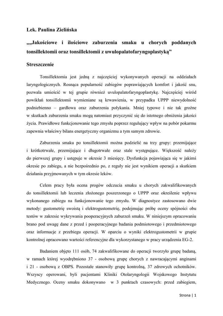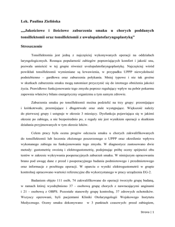 Lek. Paulina Zielińska „„Jakościowe i ilościowe zaburzenia smaku u chorych poddanych tonsillektomii oraz tonsillektomii z uwulopalatofaryngoplastyką” Streszczenie Tonsillektomia jest jedną z najczęściej wykonywanych operacji na oddziałach laryngologicznych. Rosnąca popularność zabiegów poprawiających komfort i jakość snu, pozwala umieścić w tej grupie również uvulopalatofaryngoplastykę. Najczęściej wśród powikłań tonsillektomii wymieniane są krwawienia, w przypadku UPPP niewydolność podniebienno – gardłowa oraz zaburzenia połykania. Mniej typowe i nie tak groźne w skutkach zaburzenia smaku mogą natomiast przyczynić się do istotnego obniżenia jakości życia. Prawidłowe funkcjonowanie tego zmysłu poprzez regulujący wpływ na pobór pokarmu zapewnia właściwy bilans energetyczny organizmu a tym samym zdrowie. Zaburzenia smaku po tonsillektomii można podzielić na trzy grupy: przemijające i krótkotrwałe, przemijające i długotrwałe oraz stale występujące. Większość należy do pierwszej grupy i ustępuje w okresie 3 miesięcy. Dysfunkcja pojawiająca się w jakimś okresie po zabiegu, a nie bezpośrednio po, z reguły nie jest wynikiem operacji a skutkiem działania przyjmowanych w tym okresie leków. Celem pracy była ocena progów odczucia smaku u chorych zakwalifikowanych do tonsillektomii lub leczenia złożonego poszerzonego o UPPP oraz określenie wpływu wykonanego zabiegu na funkcjonowanie tego zmysłu. W diagnostyce zastosowano dwie metody: gustometrię swoistą i elektrogustometrię, podejmując próbę oceny spójności obu testów w zakresie wykrywania pooperacyjnych zaburzeń smaku. W niniejszym opracowaniu brano pod uwagę dane z przed i pooperacyjnego badania podmiotowego i przedmiotowego oraz informacje z przebiegu operacji. W oparciu o wyniki elektrogustometrii w grupie kontrolnej opracowano wartości referencyjne dla wykorzystanego w pracy urządzenia EG-2. Badaniem objęto 111 osób, 74 zakwalifikowane do operacji tworzyło grupę badaną, w ramach której wyodrębniono 37 - osobową grupę chorych z nawracającymi anginami i 21 - osobową z OBPS. Pozostałe stanowiły grupę kontrolną, 37 zdrowych ochotników. Wszyscy operowani, byli pacjentami Kliniki Otolaryngologii Wojskowego Instytutu Medycznego. Oceny smaku dokonywano w 3 punktach czasowych: przed zabiegiem, Strona | 1 w 2 dobie i 2 tygodnie po, w przypadku elektrogustometrii badanie przedoperacyjne służyło zapoznaniu z metodą a uzyskane wartości nie były analizowane w kontekście zaburzeń po leczeniu. W przypadku odchyleń od wartości prawidłowych stwierdzanych po 14 dniach wydłużano okres obserwacji do momentu normalizacji wyników. Na podstawie uzyskanych wyników nie stwierdzono istotnych statystycznie różnic w uzyskanych progach smaku pomiędzy zdrowymi a zakwalifikowanymi do operacji. Podobnie chorzy z nawracającymi anginami jak i zaburzeniami snu nie różnili się znamiennie od grupy kontrolnej w zakresie funkcjonowania smaku. Za normy dla urządzenia EG-2 uznano wartości progów smaku poniżej 56 µA dla 2/3 przednich języka i 70,8 µA w obszarze nasady. Nie otrzymano zgodności wyników uzyskanych przy pomocy gustometrii swoistej i elektrogustometrii w zakresie identyfikacji pooperacyjnych zaburzeń smaku. Wobec tego faktu, obie metody powinny być stosowane jako uzupełniające się a nie alternatywne. Zaburzenia smaku we wczesnym okresie pooperacyjnym wystąpiły u 24 chorych (32,4%), ocenianych przy użyciu gustometrii swoistej i 16 (28,1%) zdiagnozowanych z wykorzystaniem impulsacji prądem elektrycznym. Najczęściej upośledzonym smakiem był słodki a zaburzenia dotyczyły 23 spośród 24 badanych. Odchylenia zanotowano na wszystkich trzech obszarach języka, przy czym na wierzchołku u jednego chorego wystąpiła w 2 dobie ageusja smaku kwaśnego, nieobecna w badaniu po 14 dniach. Najsilniejszym czynnikiem predykcyjnym wystąpienia pooperacyjnej dysgeusji w badaniu z użyciem roztworów substancji testowych było nadciśnienie tętnicze. Prawdopodobnie był to efekt wspólnego działania samego urazu operacyjnego jak i leków hypotensyjnych, wymienianych wśród farmaceutyków mogących zmieniać percepcję smakową. W elektrogustometrii podwyższone progi odczucia smaku istotnie statystycznie częściej występowały na przedniej części języka. W tym przypadku najsilniejszym czynnikiem predykcyjnym okazało się stwierdzenie zrostów pomiędzy dnem niszy migdałkowej a jego torebką oceniane śródoperacyjnie. Bardziej agresywne postępowanie w trakcie preparacji, konieczne w tej sytuacji łączy się z ryzykiem przypadkowego uszkodzenia innych obecnych w niszy struktur. Poszerzenie pierwotnej operacji o plastykę podniebienia nie zwiększało w sposób istotny szans na wystąpienie po leczeniu zaburzeń smaku. Podobnie nie wykazano aby technika operacji, czas jej trwania, rodzaj hemostazy a także późniejszy proces gojenia miały znamienny wpływ na ryzyko pooperacyjnej dysgeusji. Mimo jakościowych zaburzeń smaku w badaniu gustometrycznym, większość chorych nie zgłaszała subiektywnej zmiany Strona | 2 w tym zakresie. Biorąc pod uwagę wyniki obu testów prawdopodobną przyczyną dysgeusji mógł być ucisk trzonu języka, w tym struny bębenkowej przez retraktor szczękorozwieracza. Najczęściej zaburzenia smaku są skutkiem bezpośredniego lub pośredniego urazu językowej gałązki n IX. Mogą też wynikać z nacisku na język retraktora szczękorozwieracza a dysfunkcja jest wynikiem rozciągnięcia lub ucisku zarówno struny bębenkowej jak i wspominanego wcześniej n. językowo-gardłowego. Pomimo, że zaburzenia smaku, mogą wystąpić nawet przy zachowaniu przez chirurga daleko idącej ostrożności, zabieg tonsillektomii należy wykonywać z minimalizacją urazu tkankowego, szczególnie w okolicy dolnego bieguna niszy. Warto też zachować ostrożność podczas zakładania szpatułki szczękorozwieracz