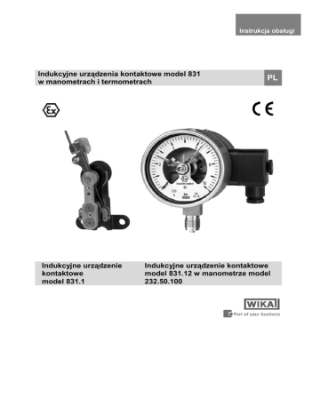 Instrukcja obsługi Indukcyjne urządzenia kontaktowe model 831 w manometrach i termometrach Indukcyjne urządzenie kontaktowe model 831.1 PL Indukcyjne urządzenie kontaktowe model 831.12 w manometrze model 232.50.100 PL Instrukcja obsługi model 831 2 Strona 1-19 Spis treści Spis treści 1 Instrukcje dotyczące bezpieczeństwa 4 2 Opis 4 3 Przyłącze mechaniczne 5 4 Schematy oprzewodowania 5 5 Stopień ochrony IP 7 6 Dopuszczalna temperatura otoczenia 7 7 Konserwacja i serwis/czyszczenie 7 8 Naprawy 7 9 Usuwanie 7 Załącznik 1: Świadectwo badania typu WE (Aprobata EX dotycząca gazów) dla inicjatorów szczelinowych typu SJ (WIKA Model 831) 8-10 Załącznik 2: Świadectwo badania typu WE (Aprobata EX dotycząca gazów) dla czujników SN typu SJ (WIKA Model 831-SN/S1N) 11-14 Załącznik 3: Świadectwo badania typu WE Aprobata EX dotycząca gazów) dla czujników zbliżeniowych SN typu SJ (WIKA Model 831 i 831-SN/S1N) 15-19 Instrukcja obsługi firmy WIKA indukcyjnych urządzeń kontaktowych model 831 3 1. Instrukcje dotyczące bezpieczeństwa / 2. Opis 1. Instrukcje dotyczące bezpieczeństwa Podczas instalacji, odbioru technicznego oraz obsługi opisywanego sprzętu należy przestrzegać odpowiednich krajowych przepisów bezpieczeństwa (np. VDE 0100). ■ Nie wolno obsługiwać manometra, jeżeli nie zostało odłączone zasilanie elektryczne ■ W przypadku nieprzestrzegania odpowiednich przepisów mogą wystąpić poważne uszkodzenia i/lub zniszczenia ■ Z niniejszymi przyrządami może pracować jedynie wykwalifikowany personel. 2. Opis Wbudowane elektryczne urządzenia kontaktowe są bezstykowymi, szczelinowymi, zbliżeniowymi czujnikami indukcyjnymi zasilanymi przez wzmacniacze przełączające z certyfikowanymi, samoistnie bezpiecznymi obwodami. Gdy nie został osiągnięty żaden z regulowanych punktów nastawy, powiązany obwód wyjściowy zostanie otwarty albo zamknięty. ■ Standardowo stosowane są czujniki szczelinowe model 831 zgodne ze świadectwem badania typu WE PTB 99 ATEX 22 19 X (patrz Załącznik 1) i ZELM 03 ATEX 0128 X (patrz Załącznik 3) ■ Czujniki model 831-SN i -S1N SN, zgodne z PTB 00 ATEX 2049 X (patrz Załącznik 2) i ZELM 03 ATEX 0128 X (patrz Załącznik 3), do zastosowań specjalnych ze specjalną konstrukcją z funkcją bezpieczeństwa (nieodpowiedni do ochrony przeciwwybuchowej) Podłączone obciążenia przełączników są zgodne z EN 60 947-5-6 (“NAMUR”). Wzmacniacze przełączające odpowiednie do modelu 831 to: Z obwodem typu 1: Jednostka sterowania KFD2-SR2-Ex1 i KFD2-SR2-Ex2 Z obwodem typu 2: Jednostka sterowania KFA6-SR2-Ex1 i KFA6-SR2-Ex2 - Model 904.28/29 Wzmacniacze przełączające odpowiednie do modelu 831-SN i 831-S1N to: Z obwodem typu 2: Jednostka sterowania KFD2-SR2-Ex1 i KHA6-SH-Ex1 - Model 904.30 4 Instrukcja obsługi firmy WIKA indukcyjnych urządzeń kontaktowych model 831 3. Przyłącze mechaniczne / 4. Schematy oprzewodowania 3. ■ Przyłącze mechaniczne Zgodnie z ogólnymi przepisami technicznymi dotyczącymi przetworników ciśnienia i przyrządów do pomiaru temperatury (np. EN 837-2 lub EN 13 190). Podczas montażu manometrów moment obrotowy śruby mocującej nie może być przyłożony poprzez obudowę lub skrzynkę końcówek, ale odpowiednie narzędzie z użyciem płaskich kluczy przeznaczonych do tego celu na kwadratowym trzonku łącznika. Instalacja z użyciem klucza W przypadku manometrów bezpieczeństwa (oznaczonych symbolem ) należy upewnić się, że pusta przestrzeń za wydmuchem z tyłu wynosi przynajmniej 15 mm. Wymagania specjalne w punkcie instalacji Aby uniknąć, między innymi, "drgania" sygnału przełącznika należy upewnić się, że przyrząd zamontowany jest w miejscu, w którym nie ma wibracji. Jeśli punkt pomiarowy nie jest odpowiednio stabilny, do jego ochrony powinien być stosowany wspornik manometra (może być z wykorzystaniem elastycznej linii kapilary). Jeśli nie można ograniczyć wibracji przez odpowiedni montaż, należy stosować przyrząd wypełniony cieczą. Przyrządy powinny być chronione przed gruboziarnistymi zanieczyszczeniami i dużymi zmianami temperatury otoczenia. 4. Schematy oprzewodowania ■ Podłączenia elektryczne musi wykonać wykwalifikowany personel ■ Podłączenia przełączników za pomocą zacisków śrubowych w skrzynce zaciskowej ■ Przekrój przewodu maks. 1,5 mm2 ■ Przyporządkowanie końcówek podane jest na płytce końcówek manometru lub miernika temperatury ■ Przyrząd musi być podłączony do złącza ekwipotencjalnego instalacji. Instrukcja obsługi firmy WIKA indukcyjnych urządzeń kontaktowych model 831 5 4. Schematy oprzewodowania Dopuszczalne wartości graniczne dla Ui, Ii i Pi w samoistnie bezpiecznych obwodach zasilania zależą od typu czujnika. Pochodzą one z odpowiednich certyfikatów badania typu WE. (Przyporządkowanie końcówek podane jest na płytce końcówek manometru lub miernika temperatury.) Odpowiednie wzmacniacze przełączające podano poniżej np.: Obwód (patrz certyfik. Ex) Typ czujnika Oznaczenie modelu Fa. Pepperl & Fuchs Świadectwo badania typu WE Model WIKA Model 1 standard standard standard standard Czujniki SN Czujniki SN KFD2-SR2-Ex1 KFD2-SR2 Ex2 KFA6-SR2-Ex1 KFA6-SR2-Ex2 KFD2-SH-Ex1 KHA6-SH-Ex1 PTB 00 ATEX 2080 PTB 00 ATEX 2080 PTB 00 ATEX 2081 PTB 00 ATEX 2081 PTB 00 ATEX 2042 PTB 00 ATEX 2043 904.31 904.32 904.28 904.29 904.33 904.30 Model 2 Kompatybilność elektromagnetyczna EMC zgodnie z EN 60 947-5-2 Przyrządy należy chronić przed silnym polem elektromagnetycznym. Czerwone wskazówki nastawcze Ustawienia punktu nastawy wykonuje się regulowaną blokadą w okienku kluczem regulacyjnym (dołączony do dostawy; na standardowych przyrządach pomiarowych znajduje się na zewnętrznym brzegu puszki połączeniowej). Wskaźniki punktu nastawy (czerwona wskazówka) Wyjmowany klucz regulacyjny Blokada regulacyjna Wskazówki punktów nastawy styków alarmowych regulowane są w pełnym zakresi