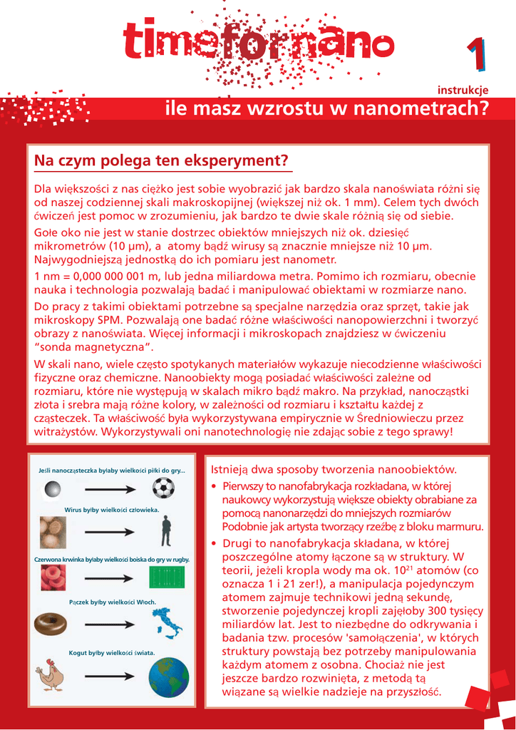 1 instrukcje ile masz wzrostu w nanometrach? Na czym polega ten eksperyment? Dla większości z nas ciężko jest sobie wyobrazić jak bardzo skala nanoświata różni się od naszej codziennej skali makroskopijnej (większej niż ok. 1 mm). Celem tych dwóch ćwiczeń jest pomoc w zrozumieniu, jak bardzo te dwie skale różnią się od siebie. Gołe oko nie jest w stanie dostrzec obiektów mniejszych niż ok. dziesięć mikrometrów (10 µm), a atomy bądź wirusy są znacznie mniejsze niż 10 µm. Najwygodniejszą jednostką do ich pomiaru jest nanometr. 1 nm = 0,000 000 001 m, lub jedna miliardowa metra. Pomimo ich rozmiaru, obecnie nauka i technologia pozwalają badać i manipulować obiektami w rozmiarze nano. Do pracy z takimi obiektami potrzebne są specjalne narzędzia oraz sprzęt, takie jak mikroskopy SPM. Pozwalają one badać różne właściwości nanopowierzchni i tworzyć obrazy z nanoświata. Więcej informacji i mikroskopach znajdziesz w ćwiczeniu “sonda magnetyczna”. W skali nano, wiele często spotykanych materiałów wykazuje niecodzienne właściwości fizyczne oraz chemiczne. Nanoobiekty mogą posiadać właściwości zależne od rozmiaru, które nie występują w skalach mikro bądź makro. Na przykład, nanocząstki złota i srebra mają różne kolory, w zależności od rozmiaru i kształtu każdej z cząsteczek. Ta właściwość była wykorzystywana empirycznie w Średniowieczu przez witrażystów. Wykorzystywali oni nanotechnologię nie zdając sobie z tego sprawy! Jeśli nanocząsteczka byłaby wielkości piłki do gry... Wirus byłby wielkości człowieka. Czerwona krwinka byłaby wielkości boiska do gry w rugby. Pączek byłby wielkości Włoch. Kogut byłby wielkości świata. Istnieją dwa sposoby tworzenia nanoobiektów. • Pierwszy to nanofabrykacja rozkładana, w której naukowcy wykorzystują większe obiekty obrabiane za pomocą nanonarzędzi do mniejszych rozmiarów Podobnie jak artysta tworzący rzeźbę z bloku marmuru. • Drugi to nanofabrykacja składana, w której poszczególne atomy łączone są w struktury. W teorii, jeżeli kropla wody ma ok. 1021 atomów (co oznacza 1 i 21 zer!), a manipulacja pojedynczym atomem zajmuje technikowi jedną sekundę, stworzenie pojedynczej kropli zajęłoby 300 tysięcy miliardów lat. Jest to niezbędne do odkrywania i badania tzw. procesów 'samołączenia', w których struktury powstają bez potrzeby manipulowania każdym atomem z osobna. Chociaż nie jest jeszcze bardzo rozwinięta, z metodą tą wiązane są wielkie nadzieje na przyszłość. ile masz wzrostu w nanometrach? Zastosowania Nanotechnologie mogą być stosowane w bardzo wielu różnych dziedzinach nauki. W niedalekiej przyszłości spodziewanych jest wiele odkryć naukowych, które zawdzięczać będzie można nanotechnologii. • Zdrowie: Nanocząstki mogą pełnić rolę zminiaturyzowanych laboratoriów diagnostycznych (zwanych laboratorium na chipie). Dzięki nim szybciej będzie można rozpoznać chorobę oraz dobrać najlepszą metodę leczenia. Nanocząstki mogą także pełnić rolę lekarstw działających na konkretne choroby, takie jak rak. • Środowisko: Nanocząstki mogą służyć za filtry oczyszczające zanieczyszczoną ziemię bądź wodę. Naukowcy pracują także nad nanotechnologią, która poprawi wydajność baterii słonecznych. • Nauki o materiałach: Nanorurki węglowe są już dziś wykorzystywane w sportach, takich jak tenis czy żeglarstwo. Są one 100 razy bardziej wytrzymałe i 6 razy lżejsze od stali. Niektórzy eksperci szacują nawet, że nanorurka węższa od ludzkiego włosa byłaby w stanie utrzymać naczepę ciężarówki, jednak nie wyprodukowano jeszcze nanorurki w takim rozmiarze, aby móc potwierdzić tę teorię! • Informatyka: Dzięki nanoprocesorom bylibyśmy w stanie wyprodukować urządzenie elektroniczne wielkości karty kredytowej, mogące służyć jednocześnie za telefon komórkowy, rejestrator wideo, aparat, lokalizator GPS oraz kartę kredytową, wszystko w jednym urządzeniu. To tylko niektóre przykłady możliwości, jakie mogą nieść ze sobą nanotechnologie oraz nanonauki. Niedługo zastosowań tych będzie znacznie więcej. Pomysły na wykonanie ćwiczenia Oto kilka liczb, które można omówić z uczniami: • Ludzki włos ma szerokość od 50000 do 100000 nm. • Czerwona komórka krwi ma ok. 7000 nm średnicy. • Typowa bakteria ma ok 1000 nm. • Większość wirusów ma wielkość od 10 do 250 nm. • Podwójny łańcuch DNA ma ok. 2 nm szerokości. • Typowa średnica atomu to między 0,1 a 0,5 nm. Można także omówić inne skale, stosowane do mierzenia odległości: kilometry, milimetry... Cele doświadczenia • Zrozumieć jak mały jest nanometr przez porównanie z używanymi na co dzień wielkościami, takimi jak wysokość. • Przedstawić świat nanonauki • Zrozumieć różne prefiksy stosowane przed jednostką miary