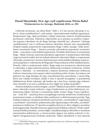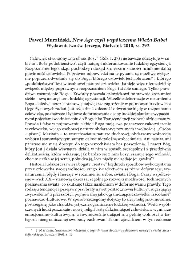 Paweł Murziński, New Age czyli współczesna Wieża Babel Wydawnictwo św. Jerzego, Białystok 2010, ss. 292 Człowiek stworzony „na obraz Boży” (Rdz 1, 27) nie zawsze odczytuje w sobie to „Boże podobieństwo”, czyli naturę i ukierunkowanie ludzkiej egzystencji. Rozpoznanie tego, skąd pochodzę i dokąd zmierzam stanowi fundamentalną powinność człowieka. Poprawne odpowiedzi na te pytania są możliwe wyłącznie poprzez odwołanie się do Boga, którego człowiek jest „obrazem” i którego „podobieństwo” jest w osobowej naturze człowieka. Istnieje więc nierozdzielny związek między poprawnym rozpoznaniem Boga i siebie samego. Tylko prawdziwe rozumienie Boga – Stwórcy pozwala człowiekowi poprawnie zrozumieć siebie – swą naturę i sens ludzkiej egzystencji. Wszelkie deformacje w rozumieniu Boga – błędy i herezje, stanowią największe zagrożenie w pojmowaniu człowieka i jego życiowych zadań. Jest też jednak zależność odwrotna: błędy w rozpoznaniu człowieka, poznawcze i życiowe deformowanie osoby ludzkiej skutkuje wypaczonymi pojęciami w odniesieniu do Boga jako Transcendencji wobec ludzkiej natury. Prawda i fałsz w pojmowaniu siebie i Boga mają swe poznawcze zakotwiczenie w człowieku, w jego osobowej naturze obdarzonej rozumem i wolnością. „Osoba – pisze J. Maritain – to wszechświat o naturze duchowej, obdarzony wolnością wyboru i stanowiący tym samym całość niezależną wobec świata. Ani natura, ani państwo nie mają dostępu do tego wszechświata bez pozwolenia. I nawet Bóg, który jest i działa wewnątrz, działa w nim w sposób szczególny i z przedziwną delikatnością, która wskazuje, jak bardzo się z nim liczy: szanuje jego wolność, choć mieszka w jej sercu, pobudza ją, lecz nigdy nie zadaje jej gwałtu”1. Historia ludzkości zawiera bogaty „zestaw” błędnych sposobów wykorzystania przez człowieka swojej wolności, czego świadectwem są różne deformacje, wynaturzenia, błędy i herezje w rozumieniu siebie, świata i Boga. Czasy współczesne – wiek XX – stanowią okres szczególnego rozwoju możliwości technicznych poznawania świata, co skutkuje także nasileniem w deformowaniu prawdy. Tego rodzaju tendencje i przejawy przybrały nawet postać „nowej kultury”, sugerującej „wyzwolenie” z przeszłości, pojmowanej jako ograniczające człowieka „zacofanie” poznawczo-kulturowe. W sposób szczególny dotyczy to sfery religijno-moralnej, postrzeganej jako charakterystyczne ograniczenie ludzkiej wolności. Wielu współczesnych ludzi poszukuje „nowej religii”, satysfakcjonującej człowieka w wymiarze emocjonalno-kulturowym, a równocześnie dającej mu pełnię wolności w kategorii nieograniczonej swobody zachowań. Takim zjawiskiem w tym zakresie 1 J. Maritain, Humanizm integralny: zagadnienia doczesne i duchowe nowego świata chrześcijańskiego, Londyn 1961, s. 16. Sprawozdania i recenzje 255 jest New Age. Ta nowa alternatywa ludzkich oczekiwań w sferze sacrum zawiera w sobie liczne ludzkie dążenia oraz tendencje współczesnej kultury w wymiarze holistycznym, stanowiąc równocześnie przedmiot wielu kontrowersji i dyskusji. W pakiet tychże dyskusji trafnie i zasadnie wpisuje się książka ks. dr. Pawła Murzińskiego, zatytułowana New Age czyli współczesna Wieża Babel. Autor tejże rozprawy w jej Wstępie słusznie zauważa, że tytułowy ruch New Age, choć mający już swą przeszłość i krytyczną ocenę, „pozostaje wciąż aktualny, tym bardziej, iż ściśle związany ze współczesną postmodernistyczną kulturą, wraz z którą rozwija się nadal, niejako w rytm szybkich i głębokich przemian w niej zachodzących”2. Dobrze więc się stało, że problem ten został poruszony w omawianej pracy, podejmującej analizę ruchu New Age z punktu widzenia katolickiej teologii moralnej. Omawiana rozprawa składa się z pięciu rozdziałów, które poprzedza Wstęp, a wieńczy Zakończenie. Wprowadzeniem do podjętego problemu jest słowo wstępne autorstwa abp. E Ozorowskiego- Albo Bóg, albo nic. W rozdziale pierwszym – Fenomen New Age’u – Autor pracy charakteryzuje zjawisko ruchu New Age. Dokonał tu najpierw jego zdefiniowania, ze wskazaniem przyczyn i celu powstania. Następnie ukazane zostały jego ideologiczne podstawy w świetle historyczno-kulturowych przeobrażeń. Do nich zalicza: historyczną erę renesansu i reformacji, rozwój naukowej kosmologii i kontestacja biblijnej wizji świata, systemy ezoteryczne XX wieku, zwłaszcza ezoteryczną psychologię, nowożytny spirytyzm jako preludium Nowej Ery oraz postmodernizm jako charakterystyczną jej postać. W ostatniej zaś części tego rozdziału została zamieszczona charakterystyka formowania się ruchu New Age. Ksiądz P. Murziński wymienia zmiany w kulturze religijno-moralnej wprowadzone przez rewolucję społeczną lat 60. XX wieku oraz rewolucję naukową lat 70. Mamy tu też charakterystykę channelingu i duchowych przewodników (guru) formującego się ruchu, opis miejsc kultowych i najważniejszych postaci oraz charakterystykę struktury organizacyjnej i stanu aktualnego New Age. Rozdział drugi nosi tytuł Światopogląd Nowej Ery. Zostały tu ukazane ideowe podstawy omawianego ruchu New Age i ich interpretacja. Epistemologiczną podstawą jest holistyczna wizja świata rozpoznawana według holistycznej zasady New Science, swoista rewolucja epistemologiczna stanowiąca nowy paradygmat rozpoznawania człowieka i świata. Szczególny wkład w rozwój myśli Nowej Ery miały systemy religijne Wschodu oraz hipoteza Gaia. Następnie autor ukazuje koncepcję Boga w ideologii Nowej Ery, oraz „chrystologię” i antropologię tejże ideologii. Analizy tego rozdziału koncentrują się na ideowych założeniach podstaw i uwarunkowań „nowej” religijności. W swej istocie ta ideologia Nowej Ery stanowi deformację chrześcijaństwa i jego teologicznej interpretacji opartej na Bibl